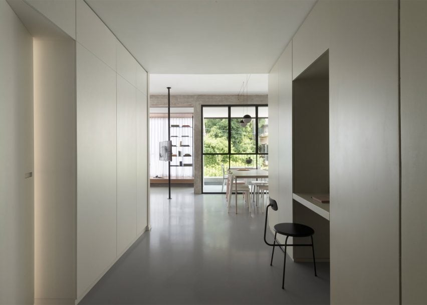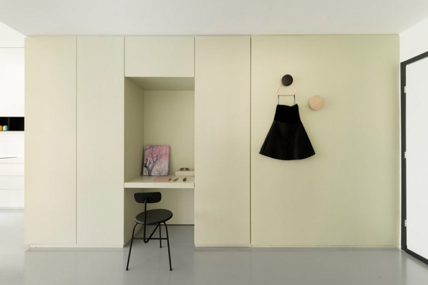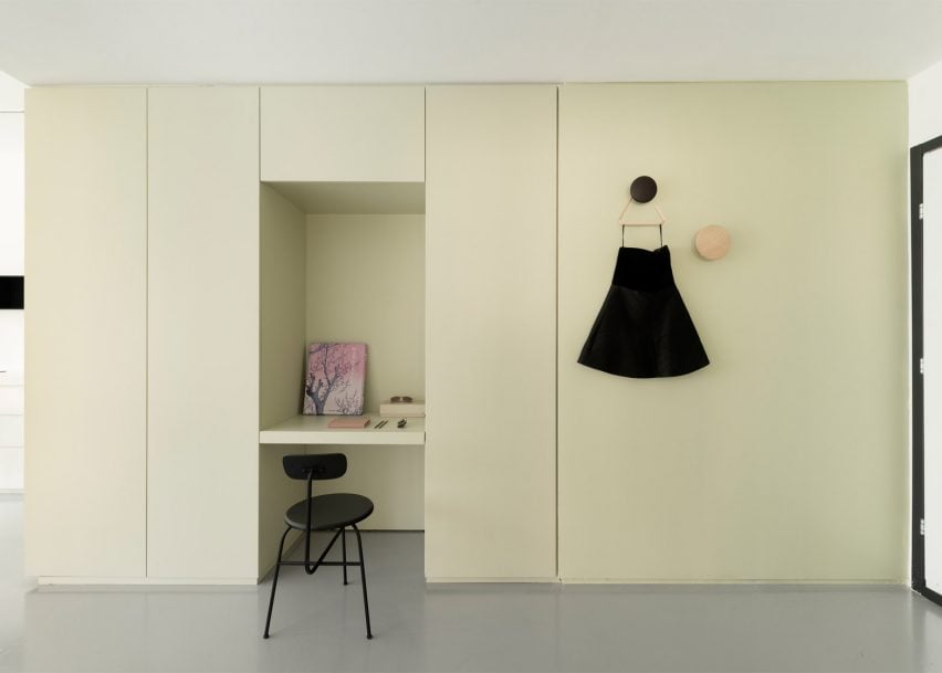 A double sided pale green cabinet extends from the kitchen, down the corridor and to the front door. As well as concealing the fridge and creating ample storage space, it holds a small nook with a study desk.