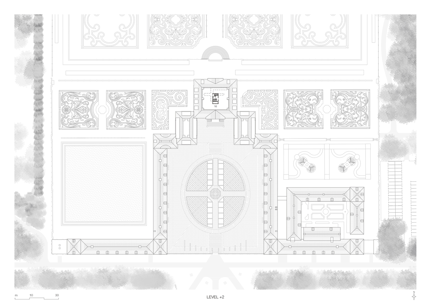 Nestled between the palace wings lies the Bassecour, formerly a courtyard with grass parterres and a water trough for horses. Today, it has been transformed into a stunning space with a central fountain and four glass surfaces, each adorned with natural stone and a thin layer of running water, paying homage to the waterworks in the historic gardens. The Bassecour has evolved beyond just the palace forecourt, now serving as the roof of the new extension. The four-centimeter deep ponds reflect the monumental palace while daylight permeates the water, casting a brilliant effect below.