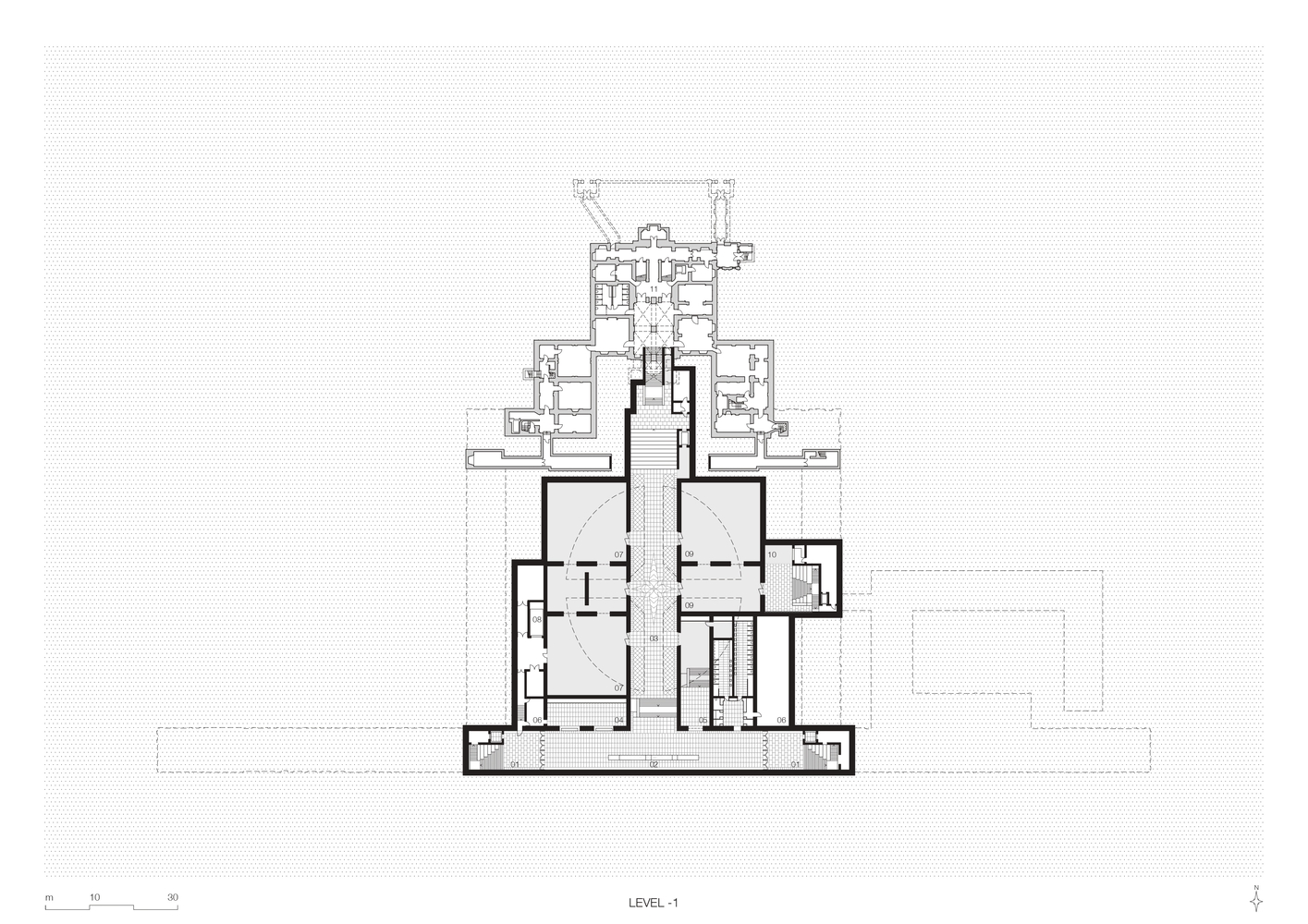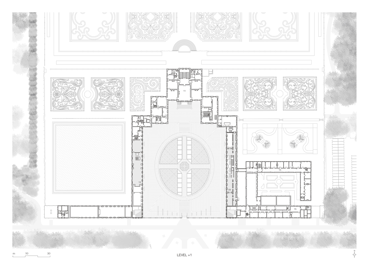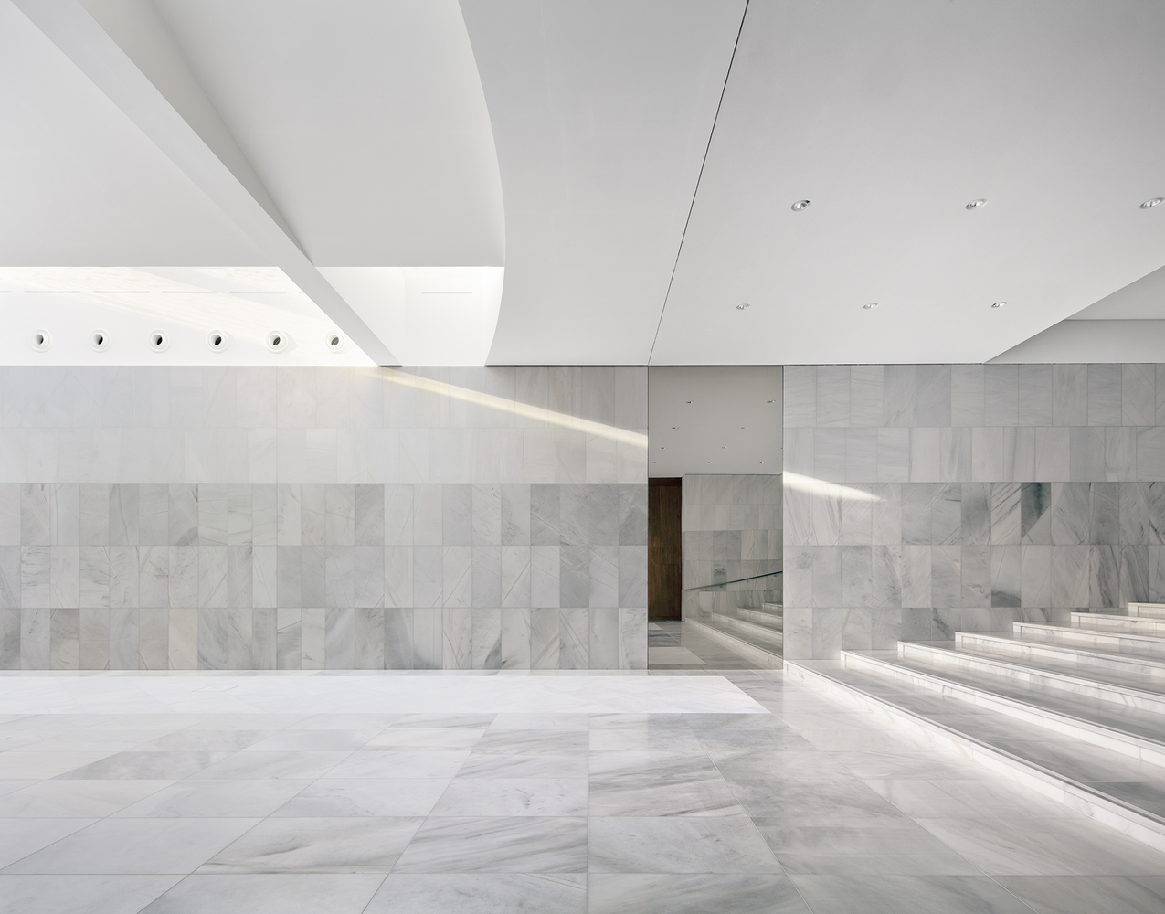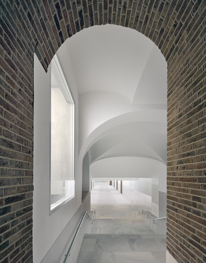 Rather than creating a prominent entrance that could encroach on the open Bassecour, the entry points have been positioned at the ends of the palace wings. Traces of the past remain visible in the subtle marble inlays on the walls where the old structure was hollowed out to create the lantern-like entry pavilions. Visitors are guided down to the light filled balcony, which hosts all necessary visitor facilities and leads into the Foyer.