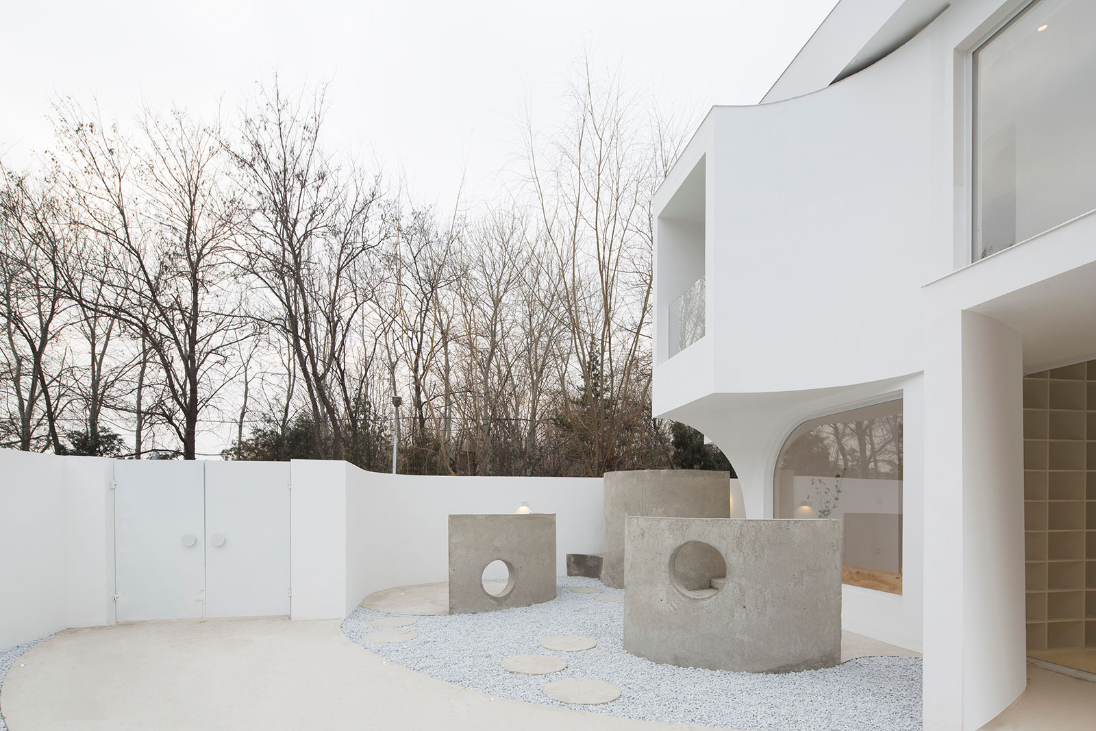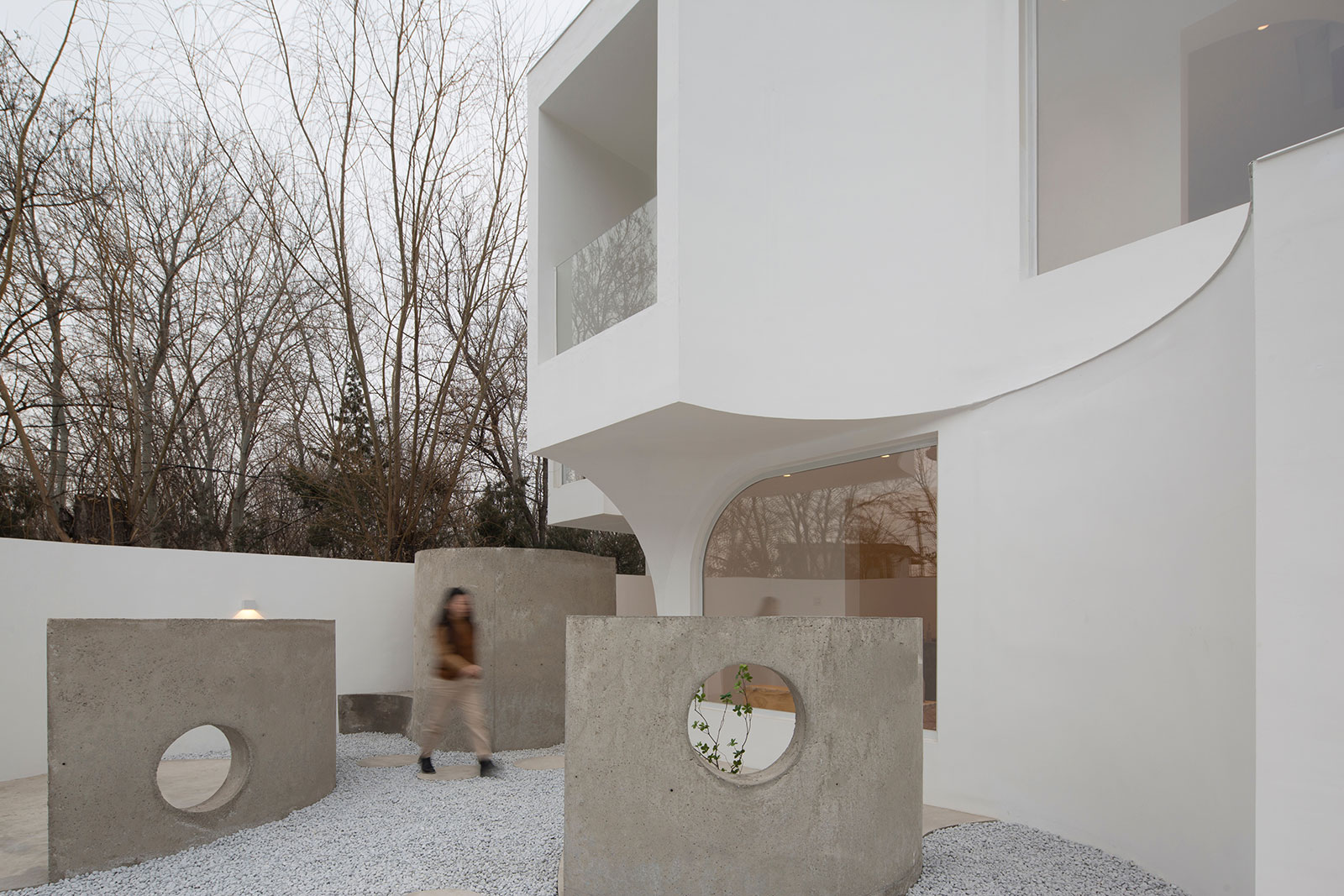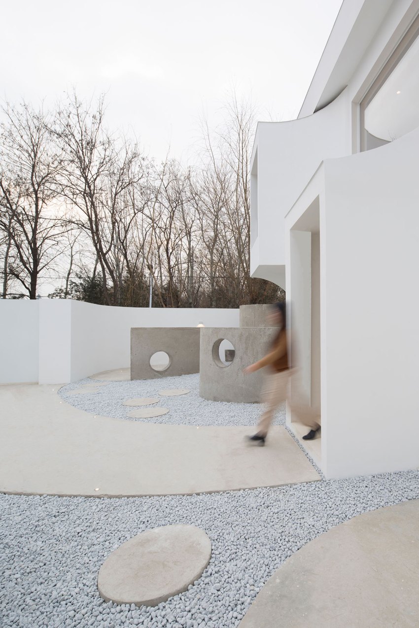 The architectural design language and the interior are based on a quarter arc, which flows freely in the space with a rigorous attitude and increases the tension of the building by means of geometric composition. The outward extension of the building block on the facade is close to nature in a flowing posture, bringing the distance between architecture, nature, and people closer together. The white facade makes the building abstract and sculptural. Through the rendering of white material, the boundary between the wall and the top is blurred. The flowing space and natural light blend together to bring people a pure experience in an imaginative space.