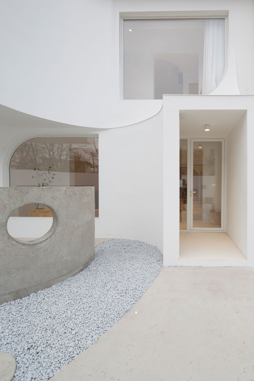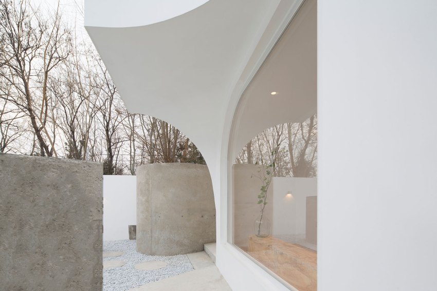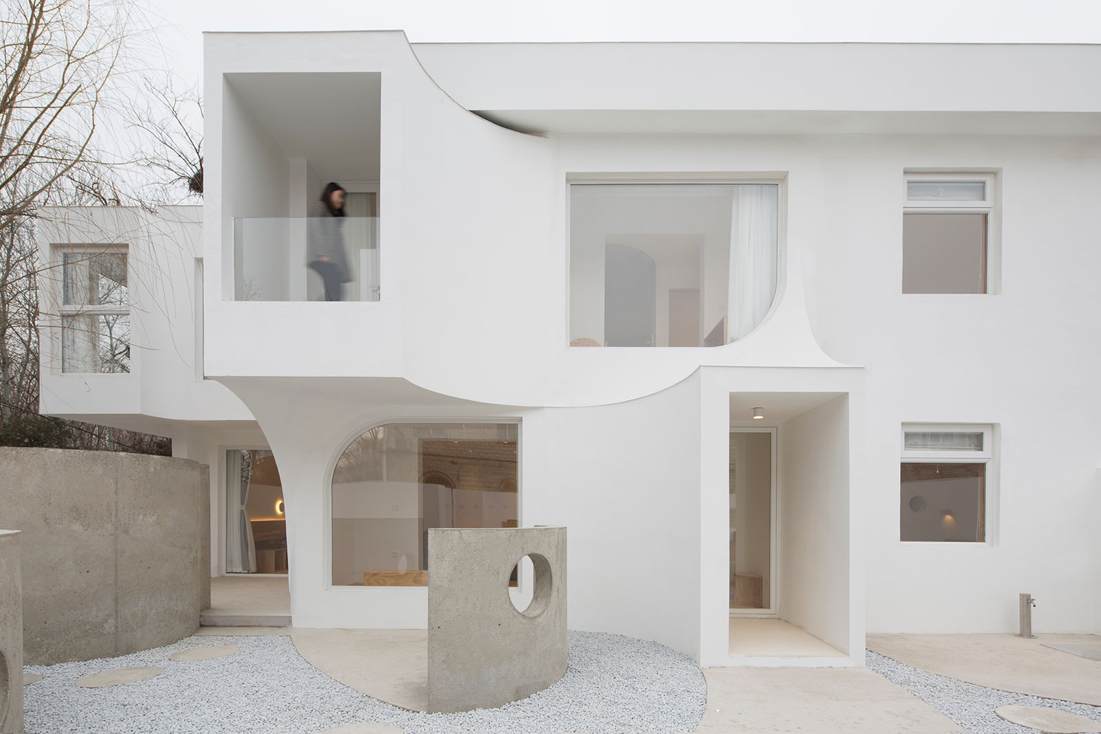 The architectural design language and the interior are based on a quarter arc, which flows freely in the space with a rigorous attitude and increases the tension of the building by means of geometric composition. The outward extension of the building block on the facade is close to nature in a flowing posture, bringing the distance between architecture, nature, and people closer together. The white facade makes the building abstract and sculptural. Through the rendering of white material, the boundary between the wall and the top is blurred. The flowing space and natural light blend together to bring people a pure experience in an imaginative space.