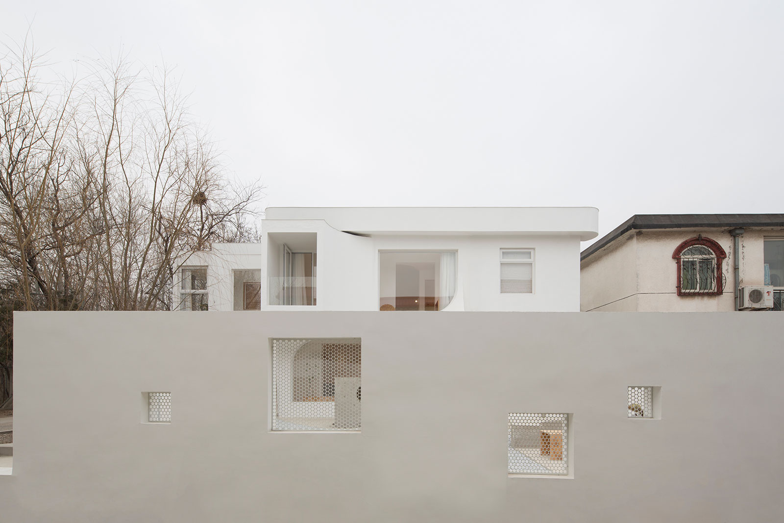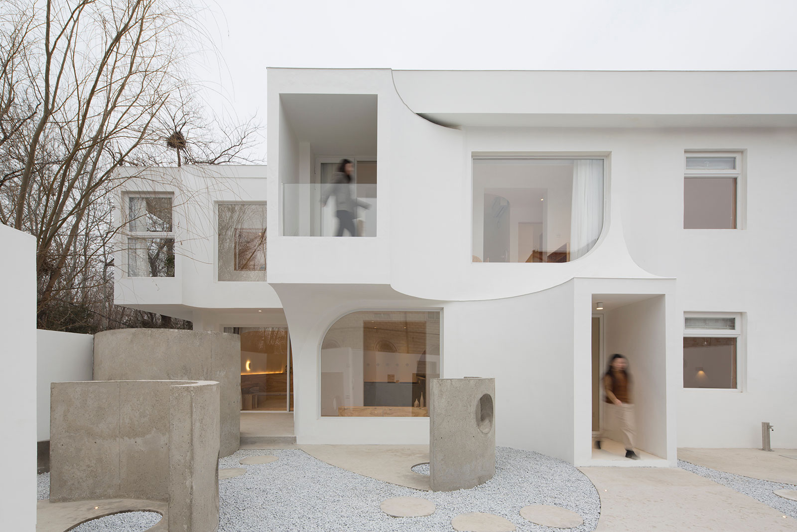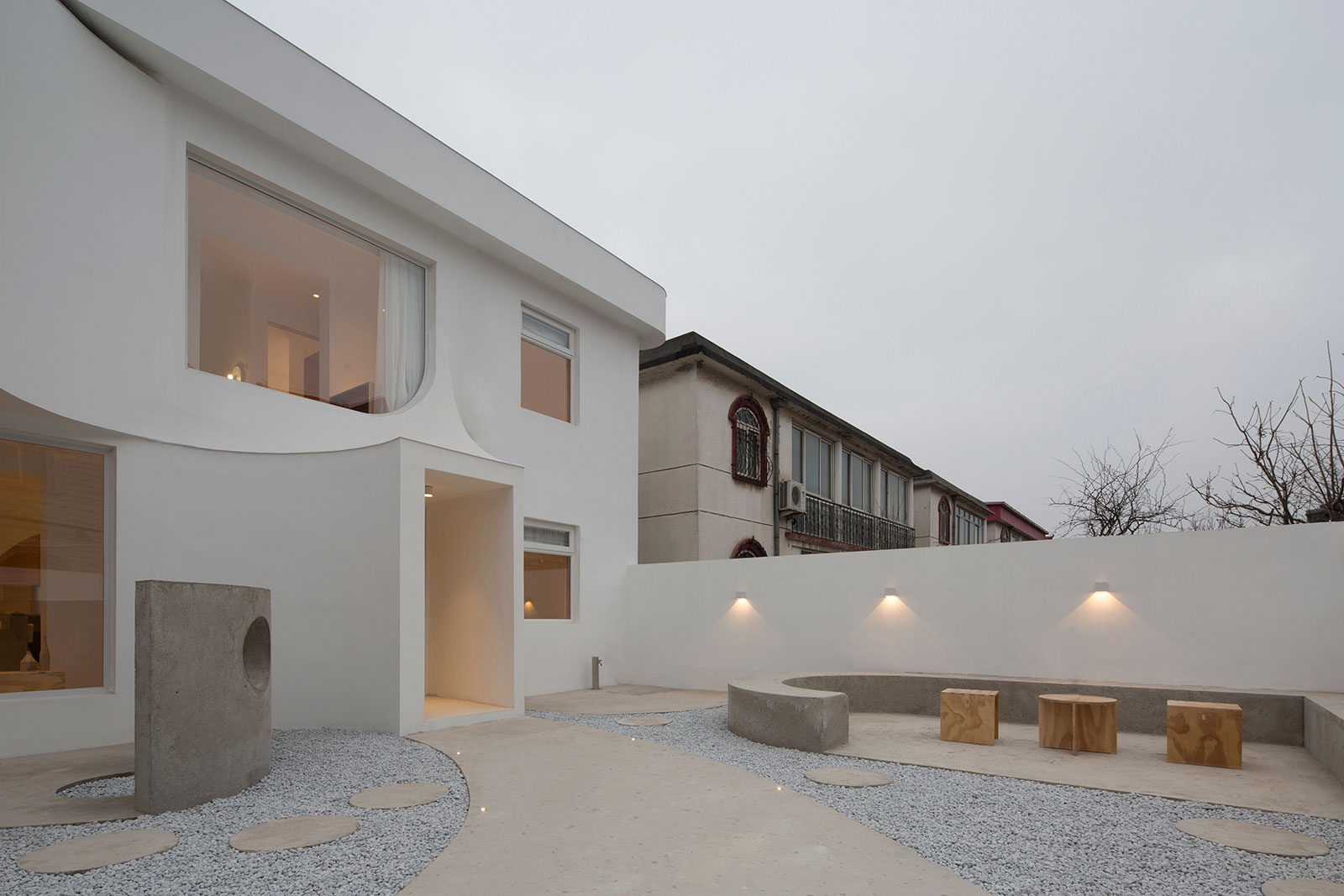 The rectangular courtyard of 100 square meters is divided into several small, semi enclosed courtyards in order to create an inner courtyard environment. Each courtyard will have a small tree as its protagonist (since completed in winter, the tree has not yet been planted), providing an organic connection between the courtyards. A series of interactions between the tearoom, guest rooms, and the courtyard are created under the multi-level space.