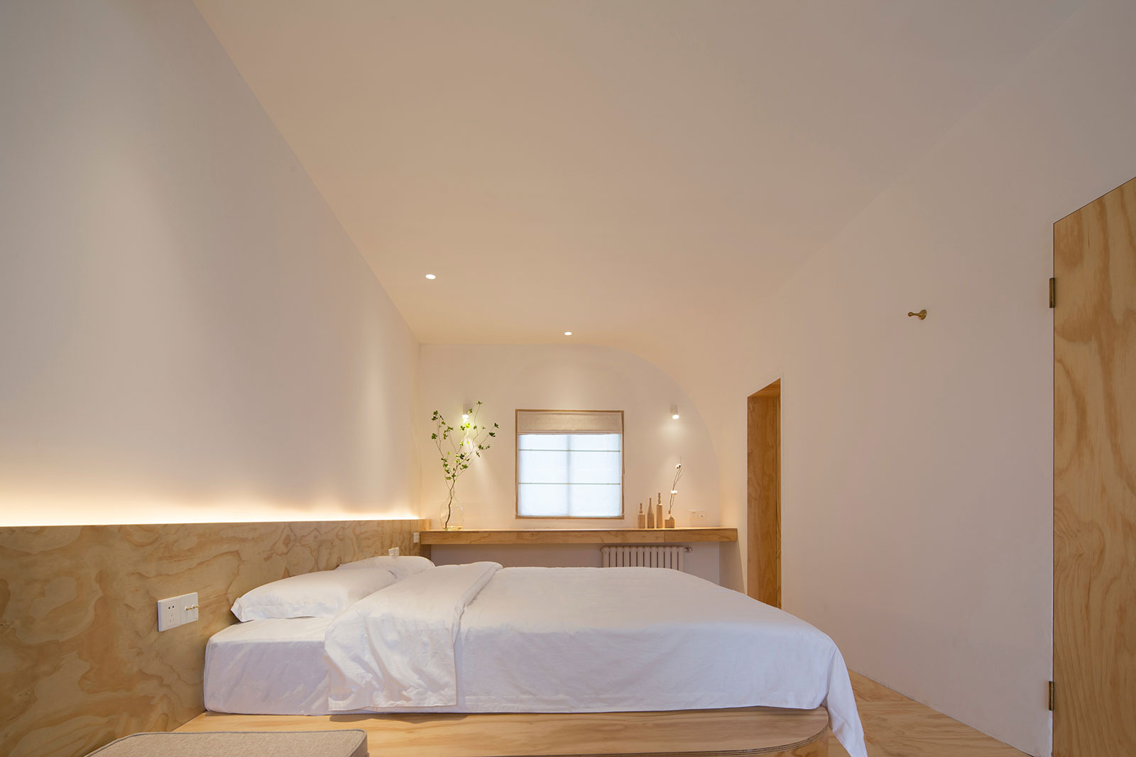 The rectangular 100 square meter courtyard is divided into several small, semi enclosed courtyards, each with a small tree as its protagonist, providing an organic connection between them. The building design language and interior are based on a quarter arc, flowing freely in space with a rigorous attitude, increasing the building’s tension through geometric composition. All of the furniture in the hotel was designed by Atelier d’More, emphasizing an assembled, prefabricated approach that turns construction into a game, allowing clients to even participate in the process.