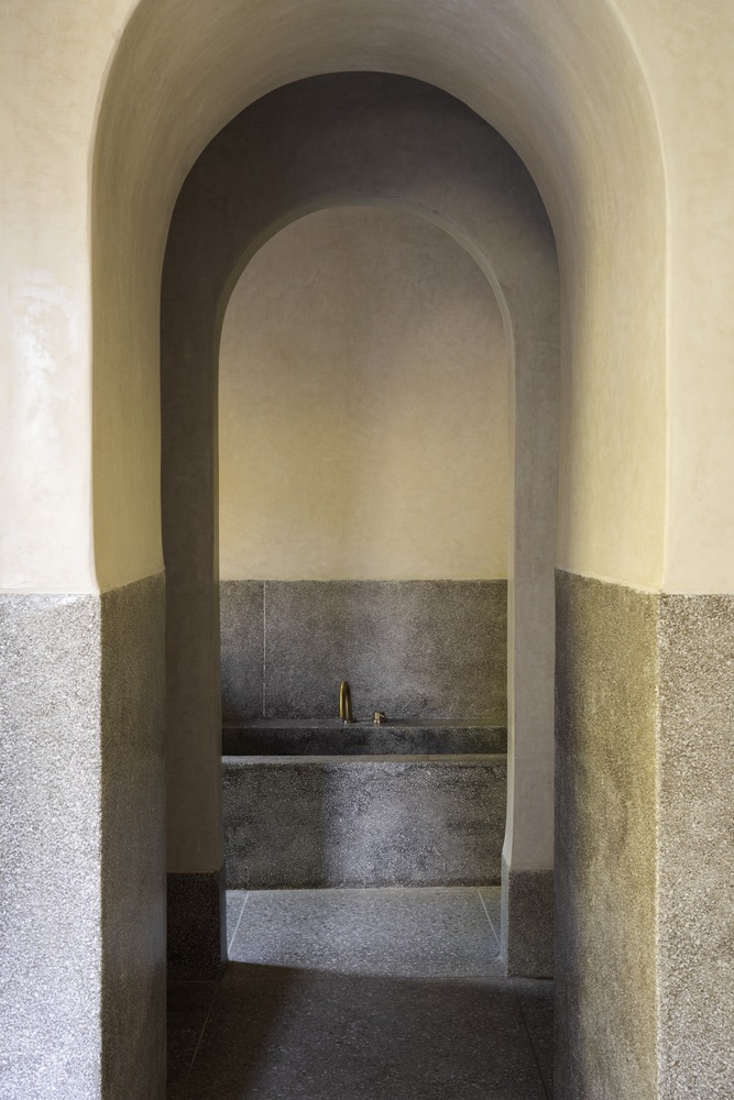 The exterior is comprised of various plaster finishes, handmade tiles, and local terrazzo for public zones, including the entrance wall defining its presence on the street. Highlights of brass denote transitions between various areas, from street to hotel, and from public to private spaces.