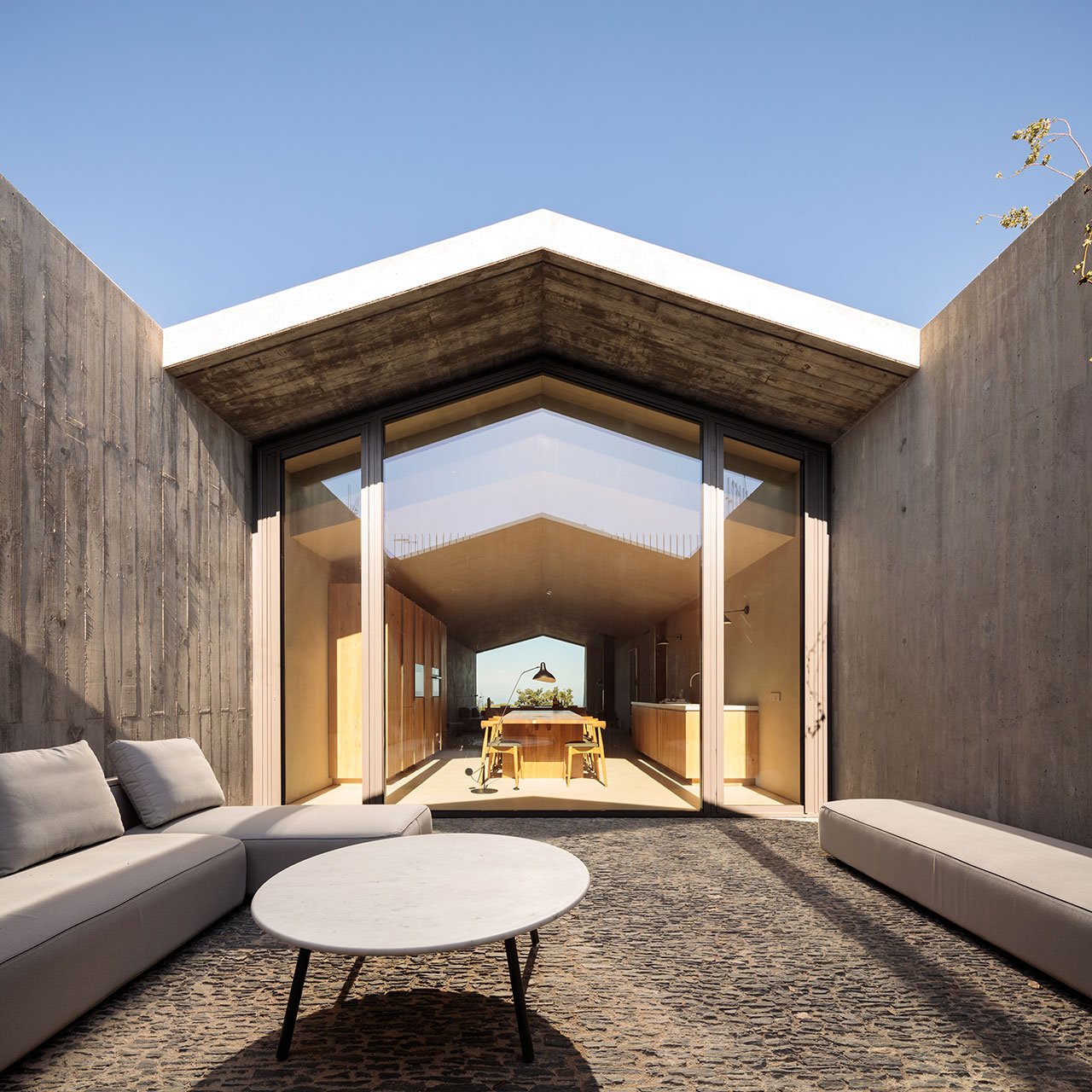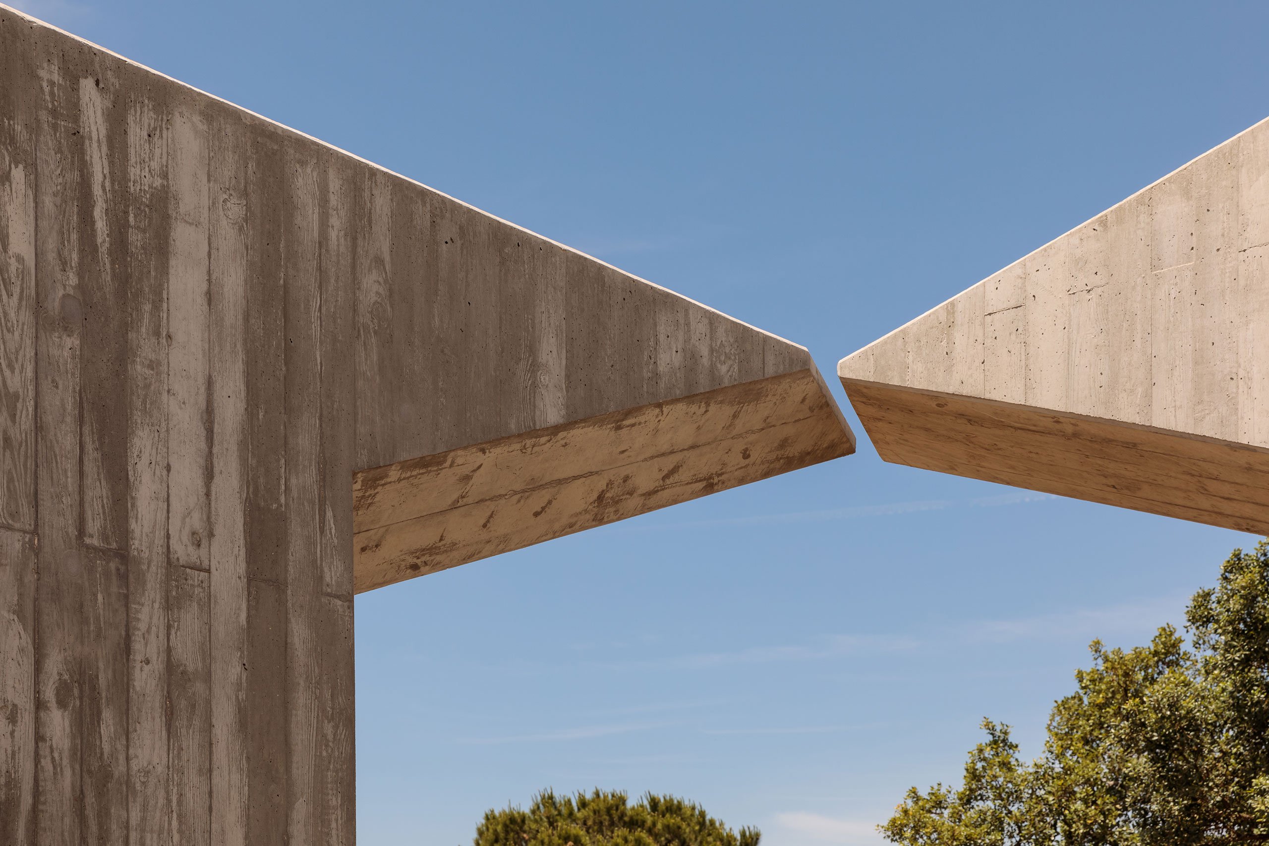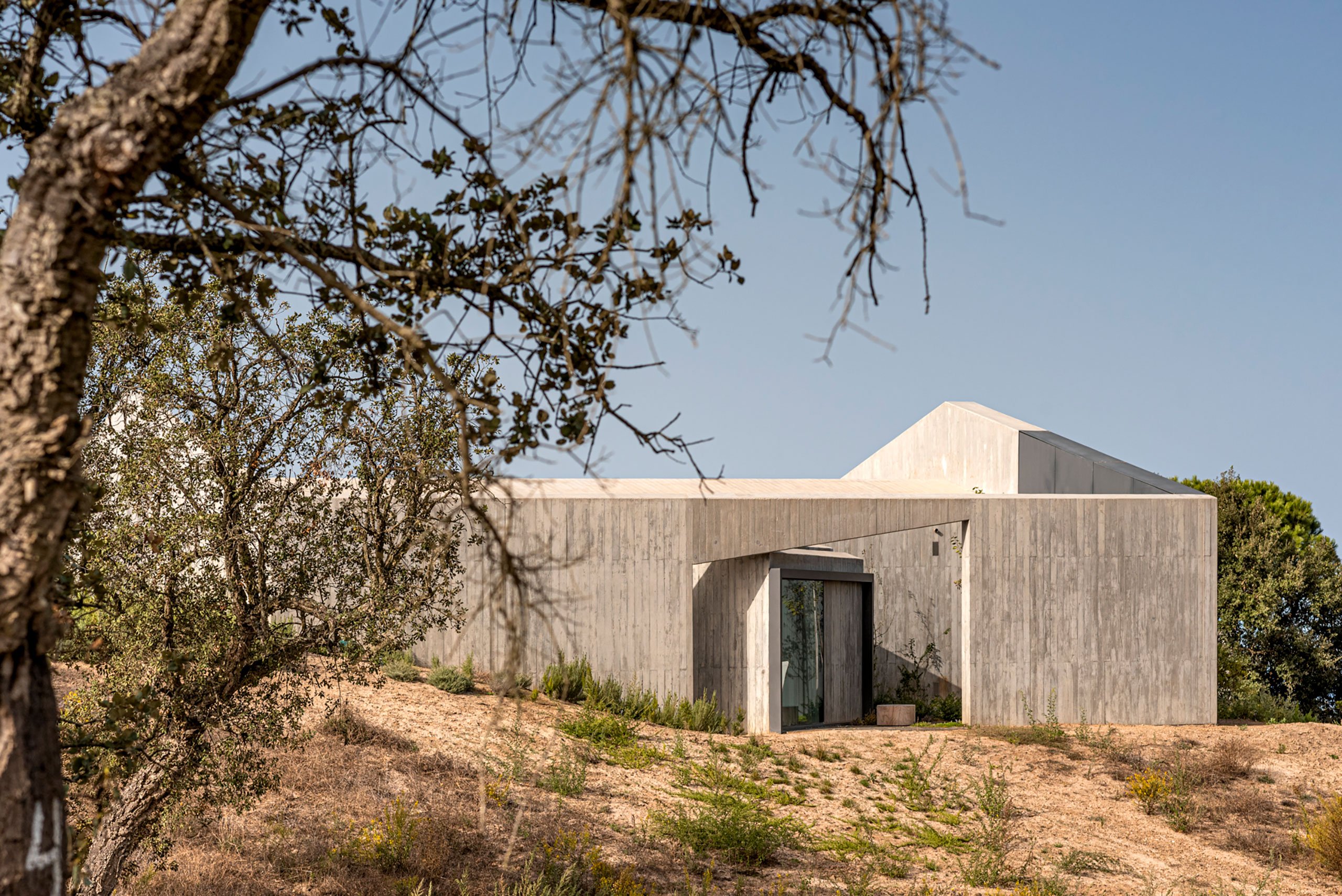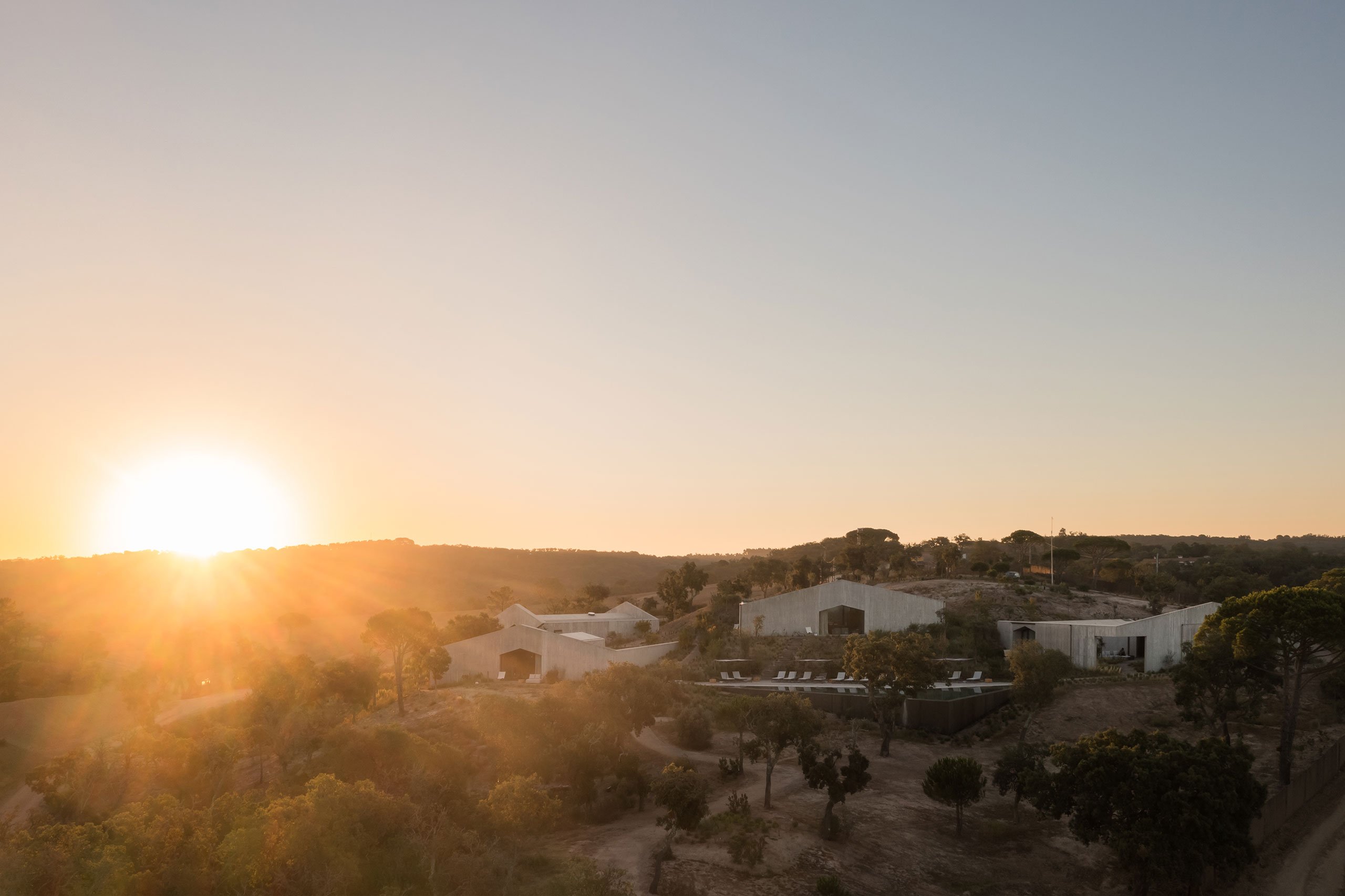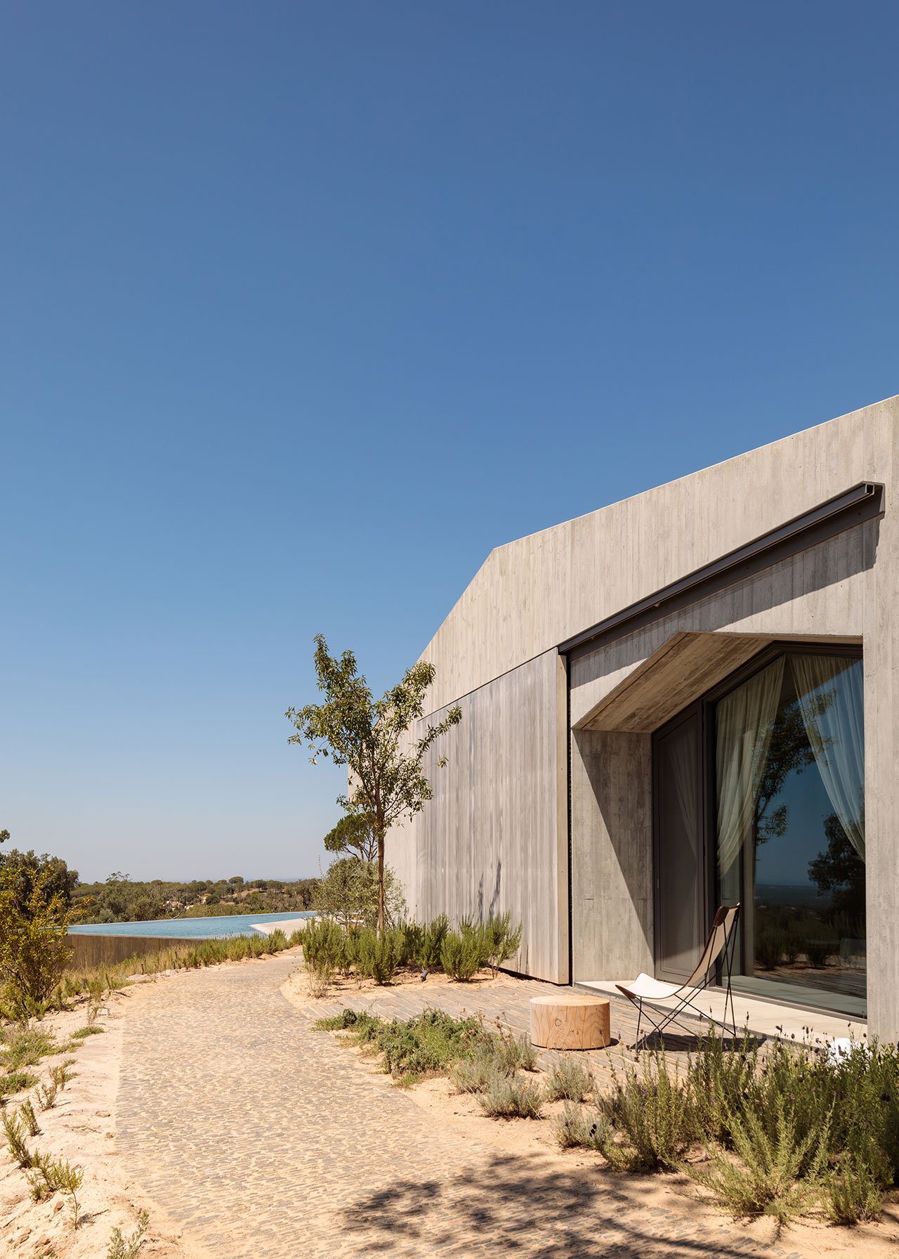 In response, Mateus applied a minimalist architectural language of clean lines and simple geometric forms, designing four identical house shaped concrete enclosures, each one containing a different arrangement of indoor and outdoor spaces. The properties are orientated towards a different direction to ensure uninterrupted views with a triangular-shaped infinity pool functioning as a pivot. Punctuated by large openings, in effect, the angular volumes comprise a series of sculptural installations that echo the hilly landscape which Mateus describes as “[architectural] ruins lost in time”.