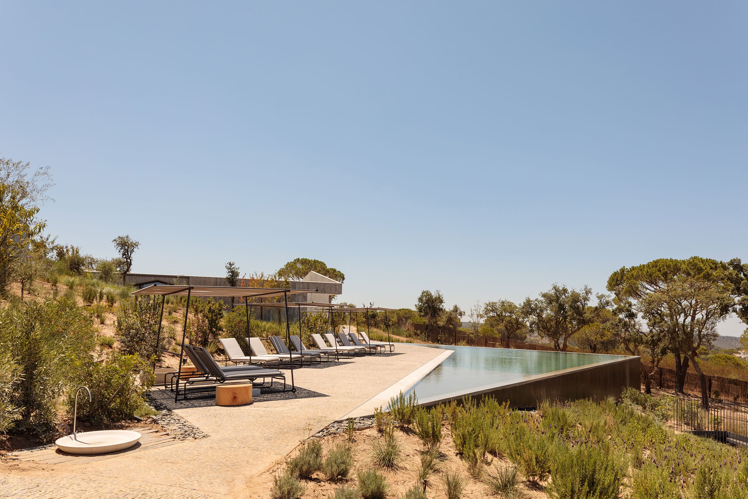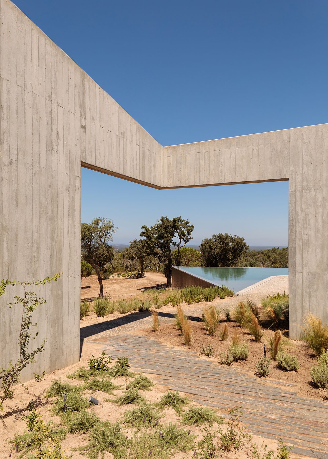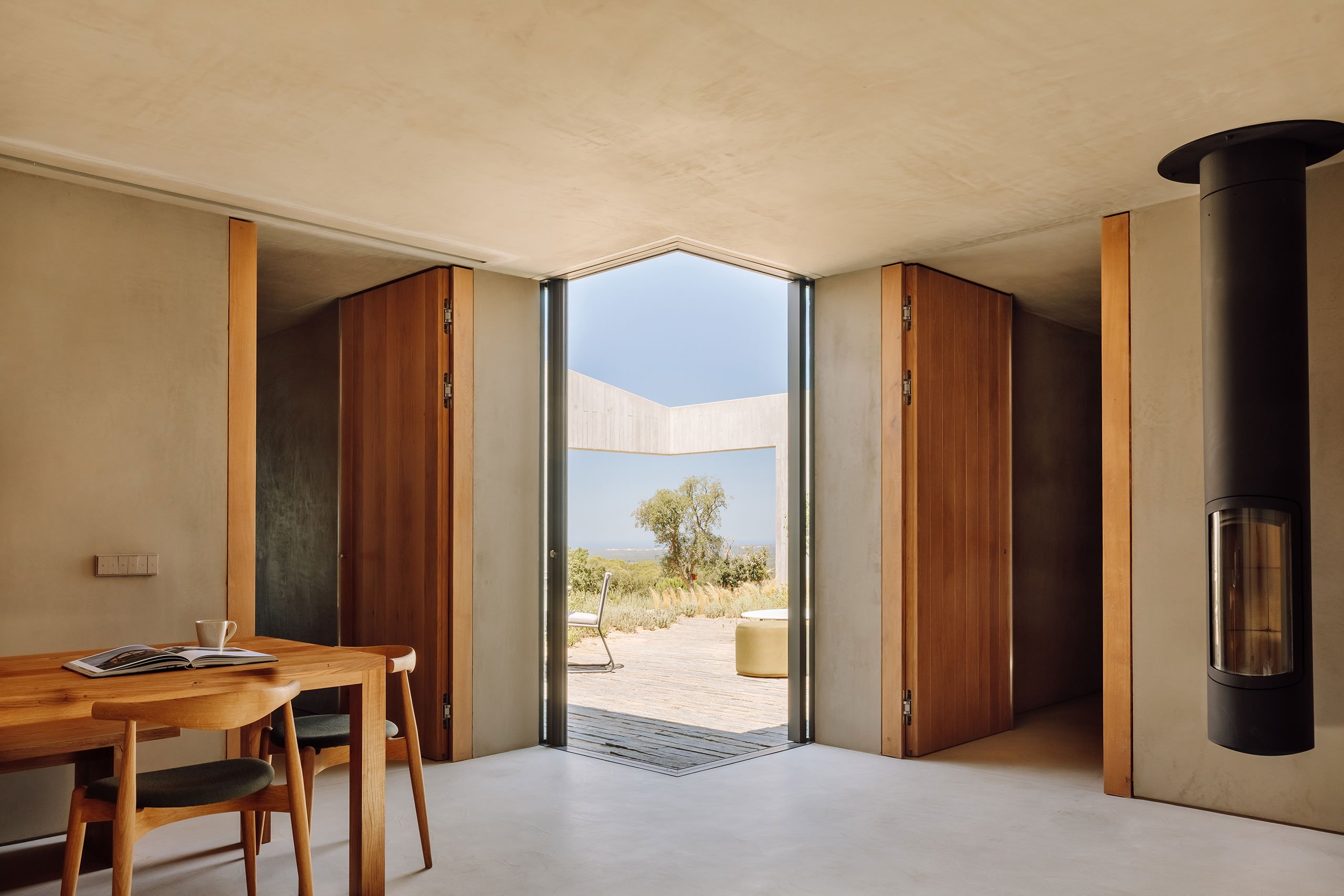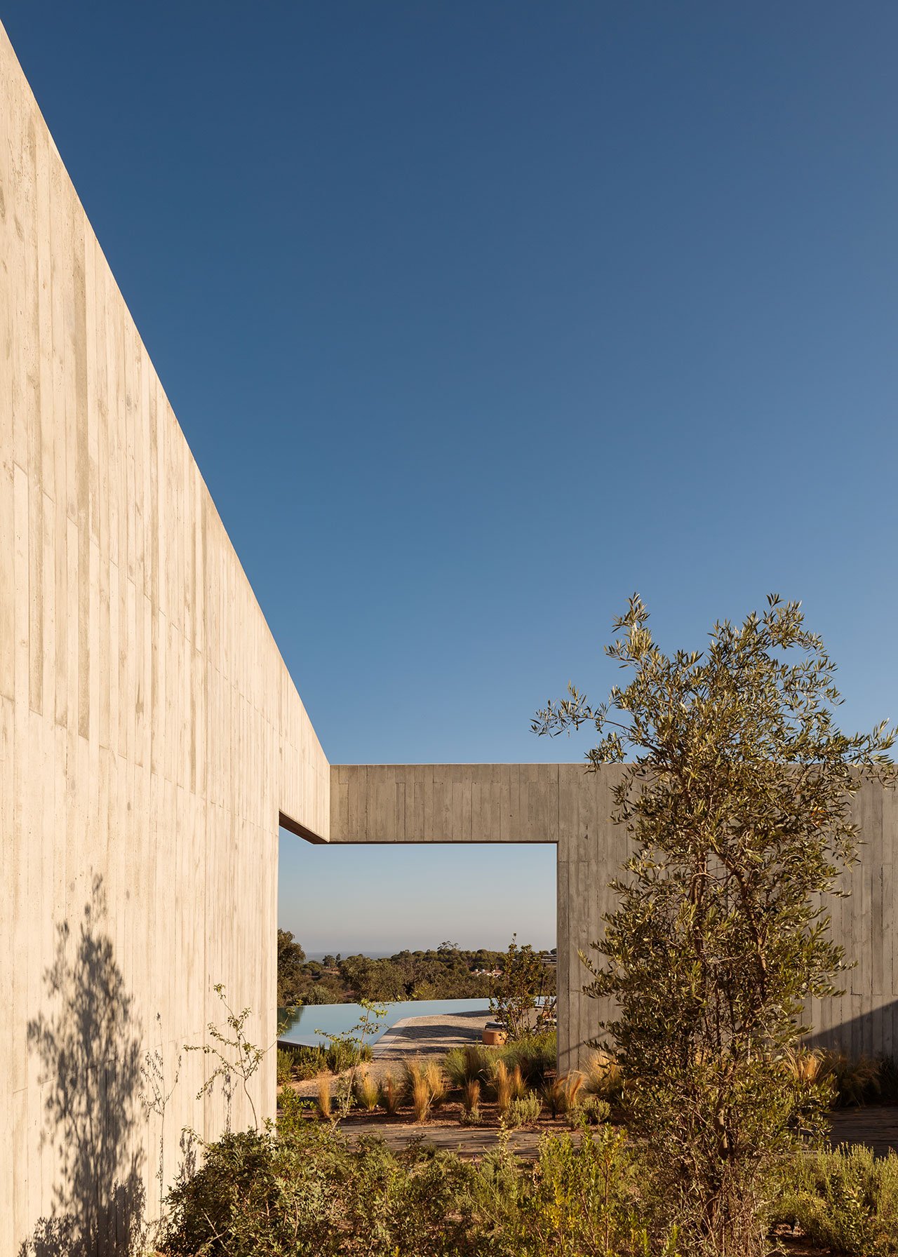 Conceived as a home away from home, the concrete houses were designed by Portuguese architect Manuel Aires Mateus to take full advantage of their location in between the countryside and the beach. Featuring a series of courtyards, or pátios in Portuguese wherefrom the project takes its name, the houses enjoy privacy but at the same time are intimately connected with the surrounding landscape, a medley of pine forests, olive groves and vineyards by the Atlantic Ocean. Starkly minimalist in architecture and soothingly ascetic in aesthetic, a homey sense of warmth nevertheless prevails thanks to the workmanship of local carpenters, stucco craftsmen and stonemasons, as well as personal touches like artworks and books handpicked by the owners. With carefully framed views of the surrounding nature from the interiors and sweeping ocean vistas from the communal swimming pool hovering above the coastal plain, Pa.te.os revels in Alentejo’s untamed beauty while fostering peacefulness and contemplation.