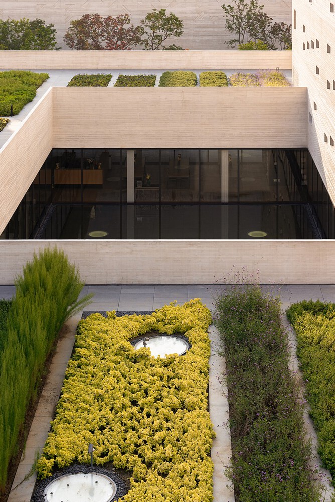 Considering the intensity of the functional programs and the high density of users, the architect decided to break one massive building into five individual buildings connected by flat roofed walkways. By breaking down and pulling apart, voids are created in the form of four gardens. Between the gardens and the solid volumes are the semi-outdoor walkways where the colonnades and their moving shadows define another kind of void. Atop the walkways, there is the fifth garden with carefully planted grasses and herbs—a pleasant retreat and gathering place, it also connects all the main functional spaces above and below.