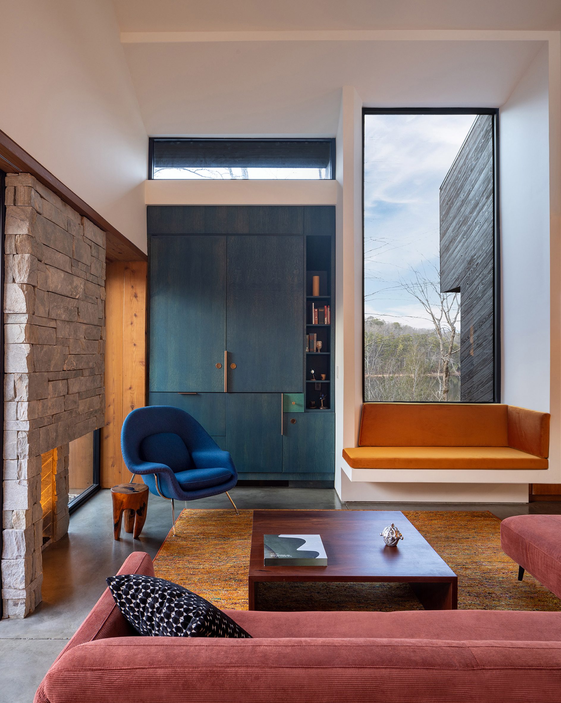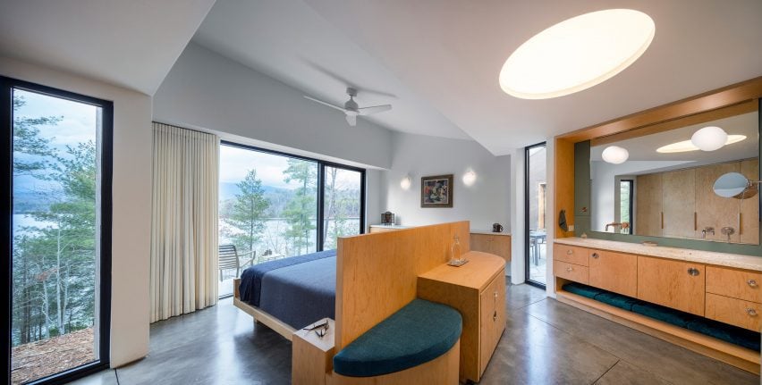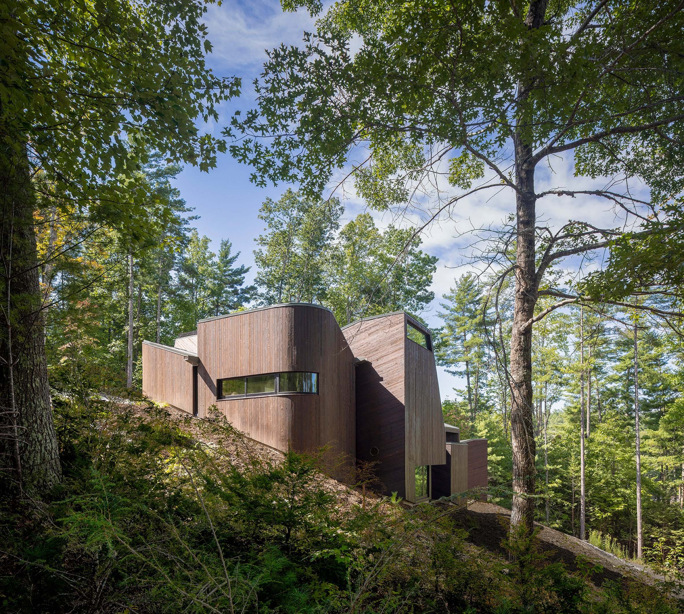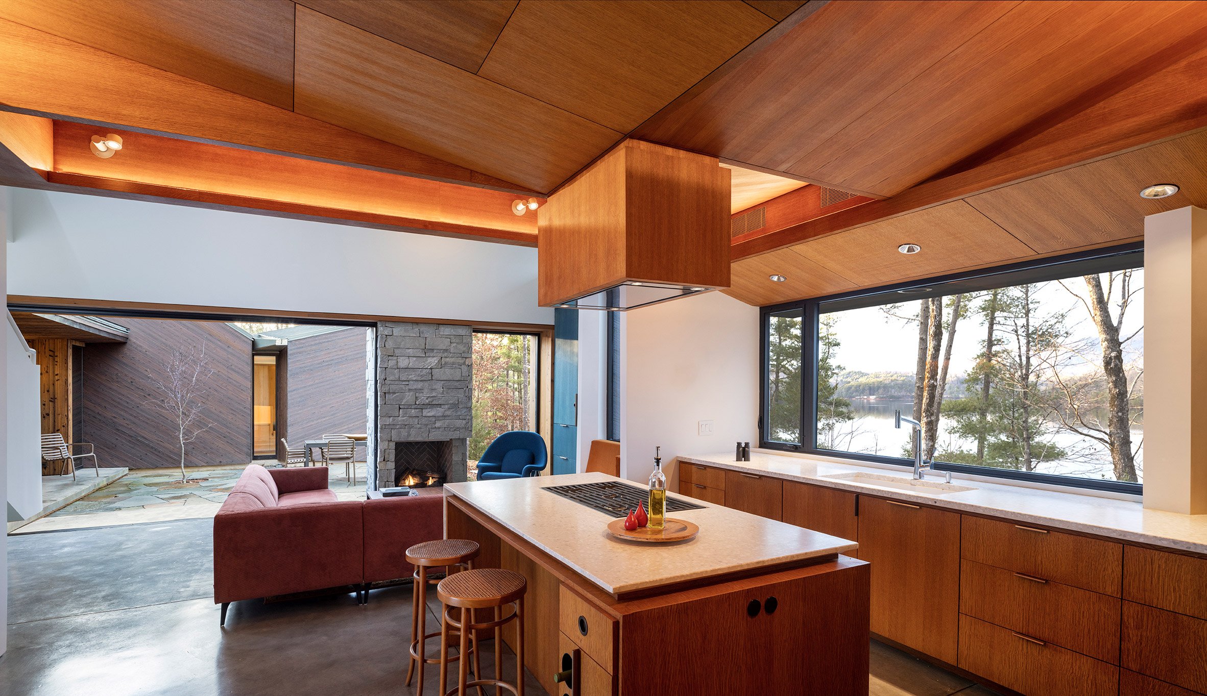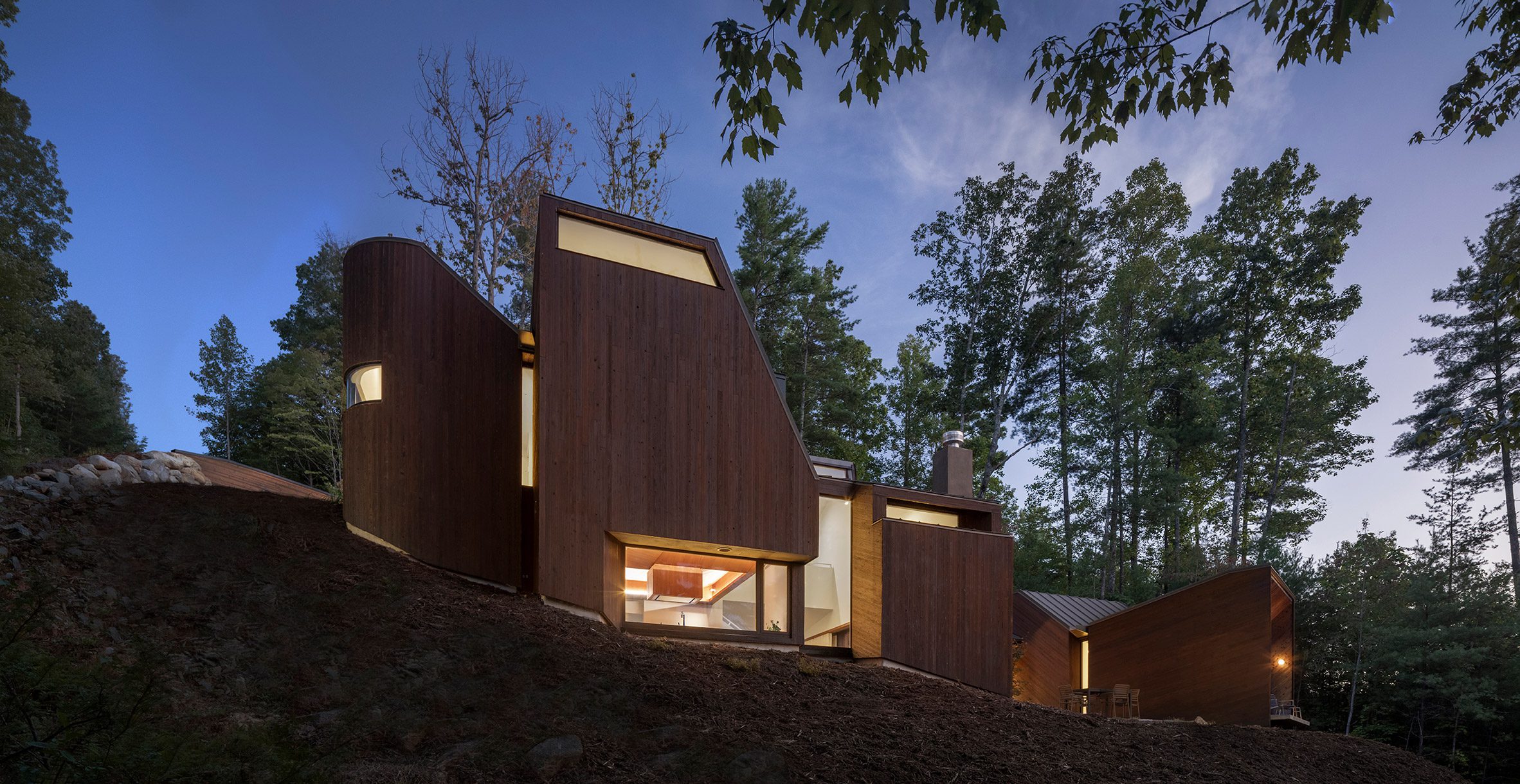On the exterior, the individual forms are wrapped in dark charred cypress and a patinated, standing seam zinc roof that reflects the browns, greens and greys of the forest and lake and are intended to weather over time.