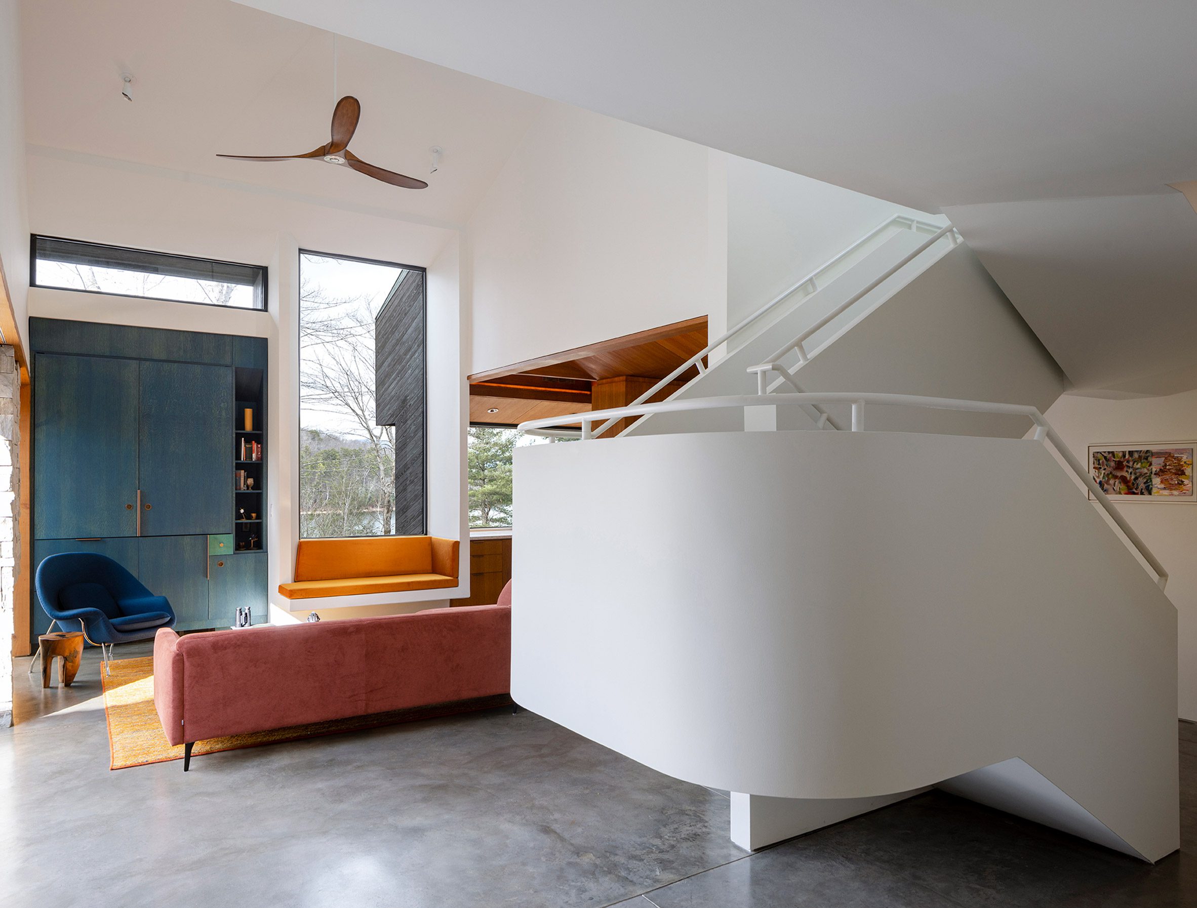 The home's primary entry is on the upper level, which holds guest bedrooms and a bathroom, where a sculpted cantilevered staircase lit by a skylight descends to the main level.