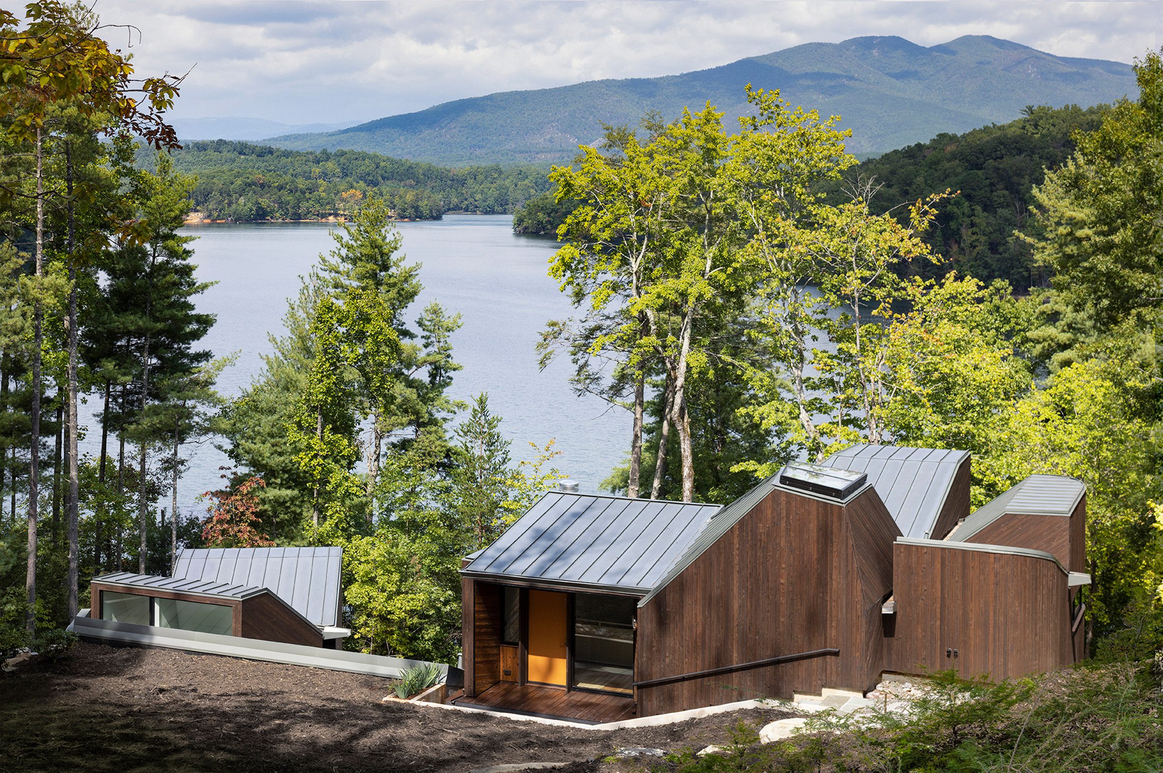 언덕위에 여러개의 돌덩어리들이 모여 있는 형상이다. 노스캐롤라이나 레이크 하우스는 건축주의 은퇴한 삶을 담기 위한 주거공간으로 다양한 이야기를 품고 있다. 그중에서도 자연과 동기화 되기 위해 가장 유사한 형상과 공간으로 건축을 구현했다.