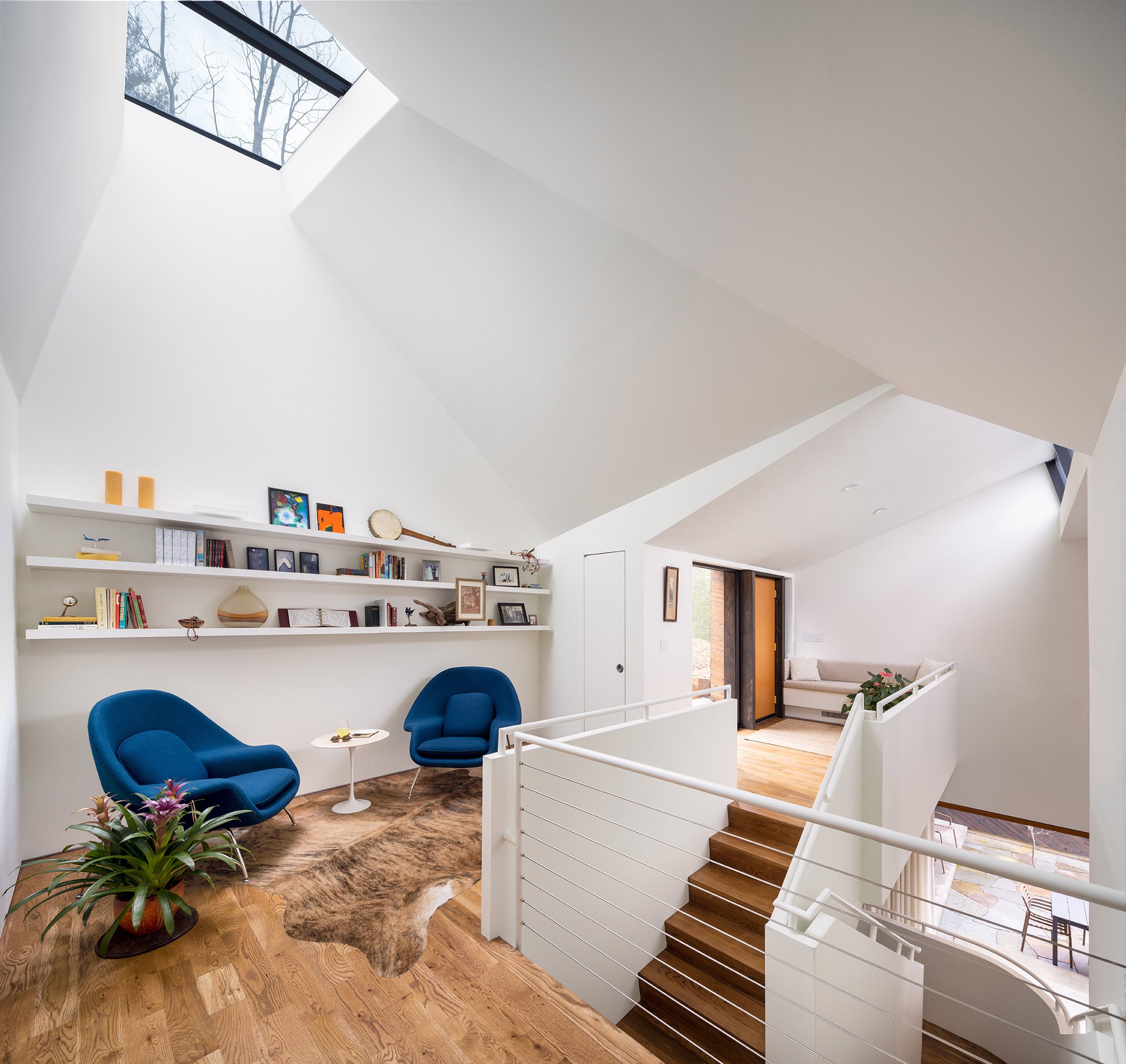 Inside, the rooms are fractals of spaces: angled geometry, clerestory windows and skylights let light wash down the all-white walls, while each space frames views toward the lake.
