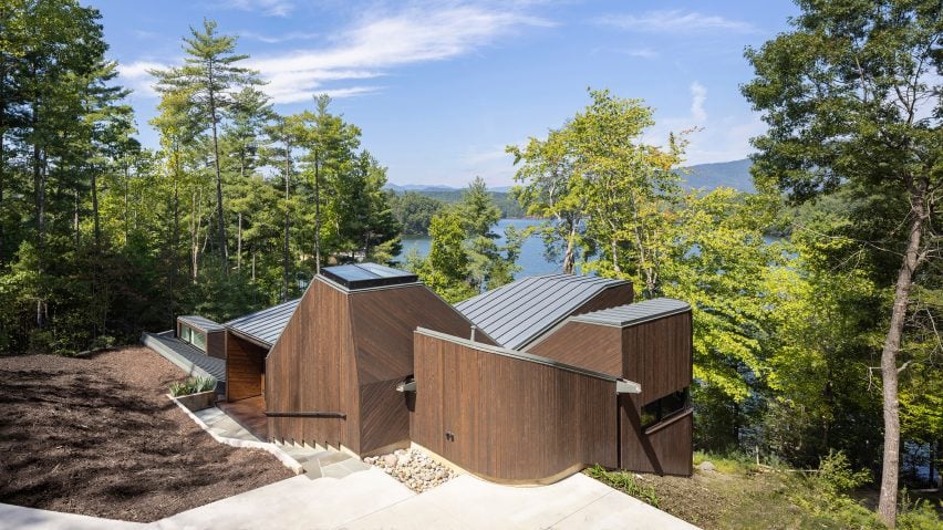 New York based studio Fuller Overby has created a North Carolina home clad in charred cypress that cascades down a hill to a lake in North Carolina.