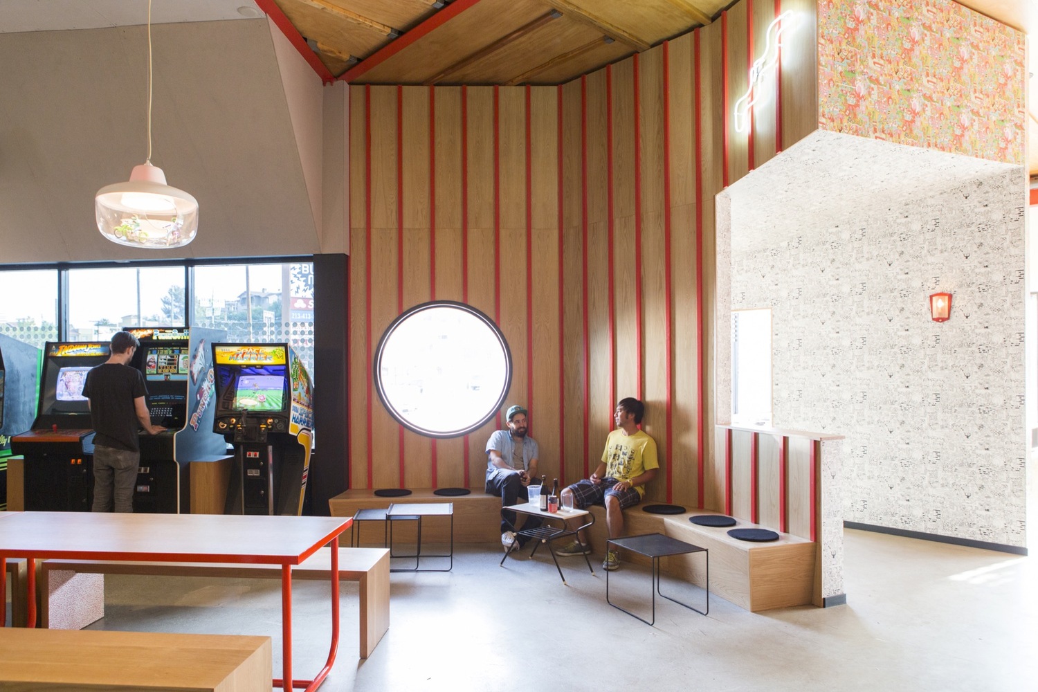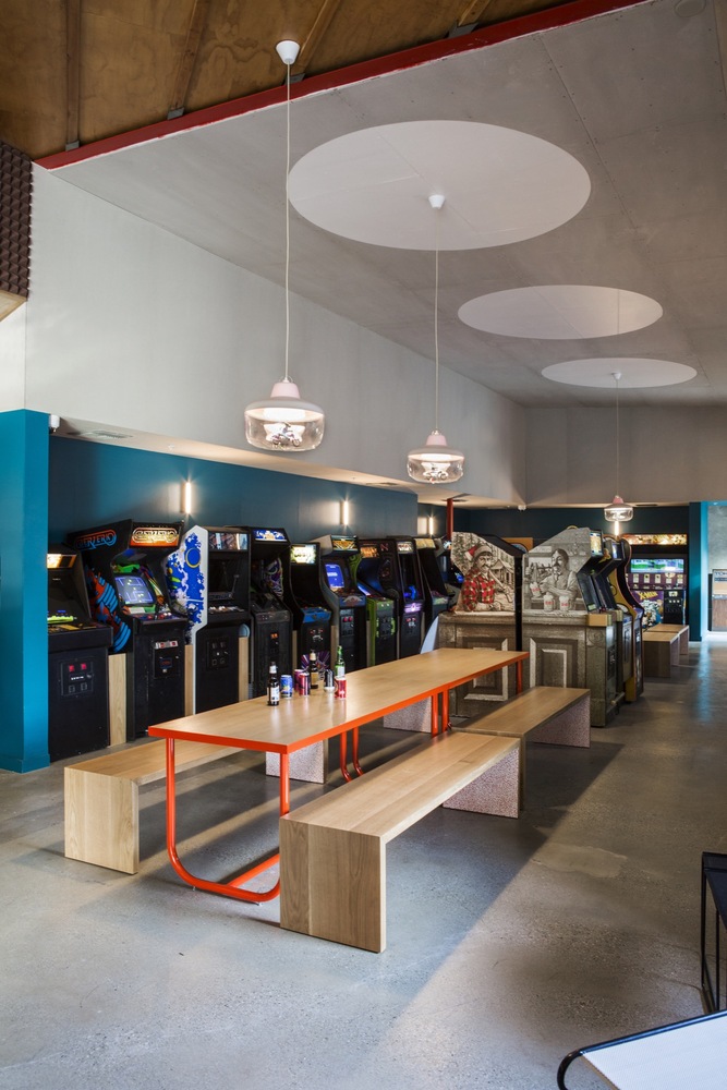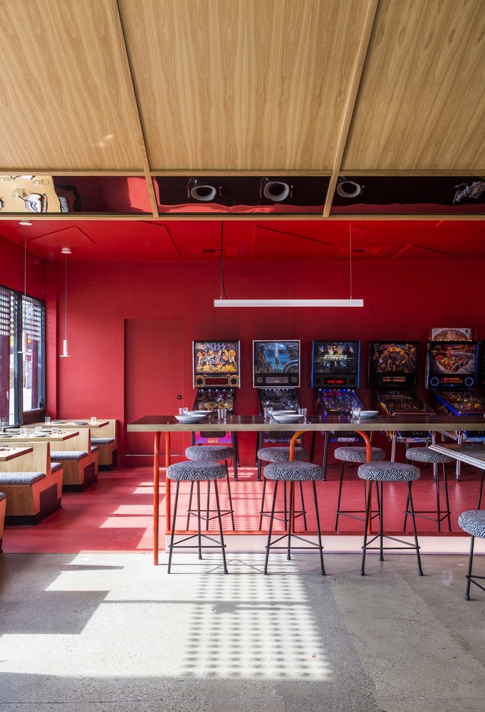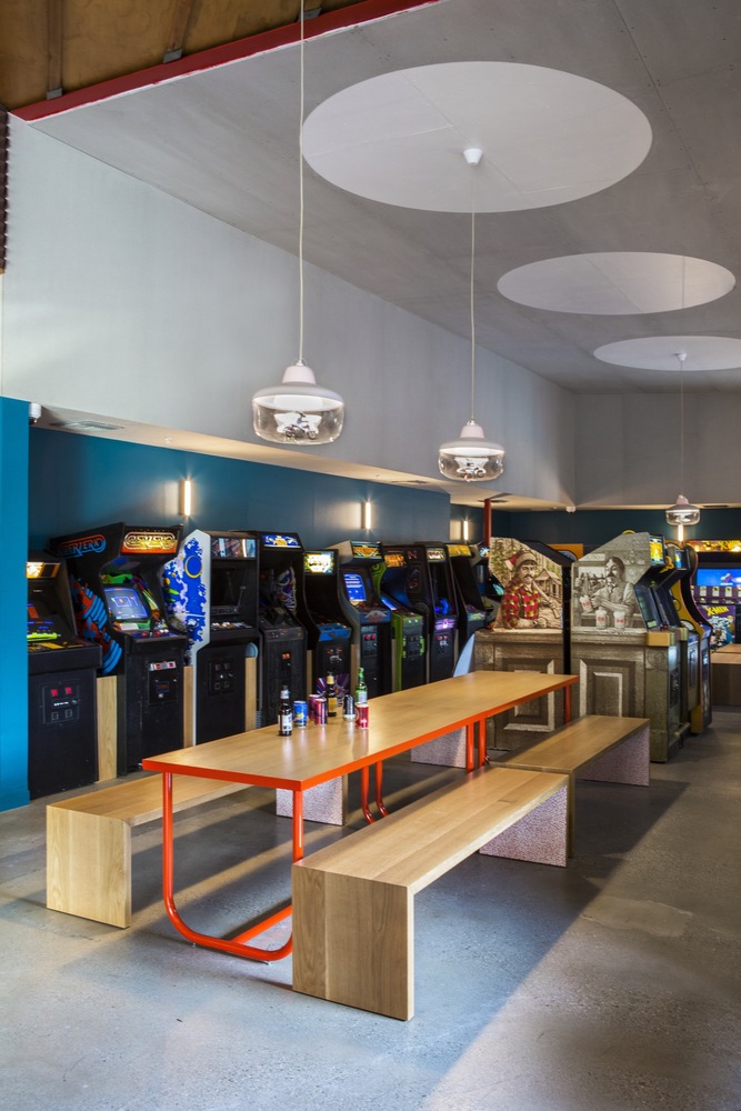 A full service restaurant and bar with a vintage arcade. Button Mash is intended to be an integral and vibrant neighborhood hub for all ages with a design that showcases a careful curation of arcade games and stellar creative cuisine.