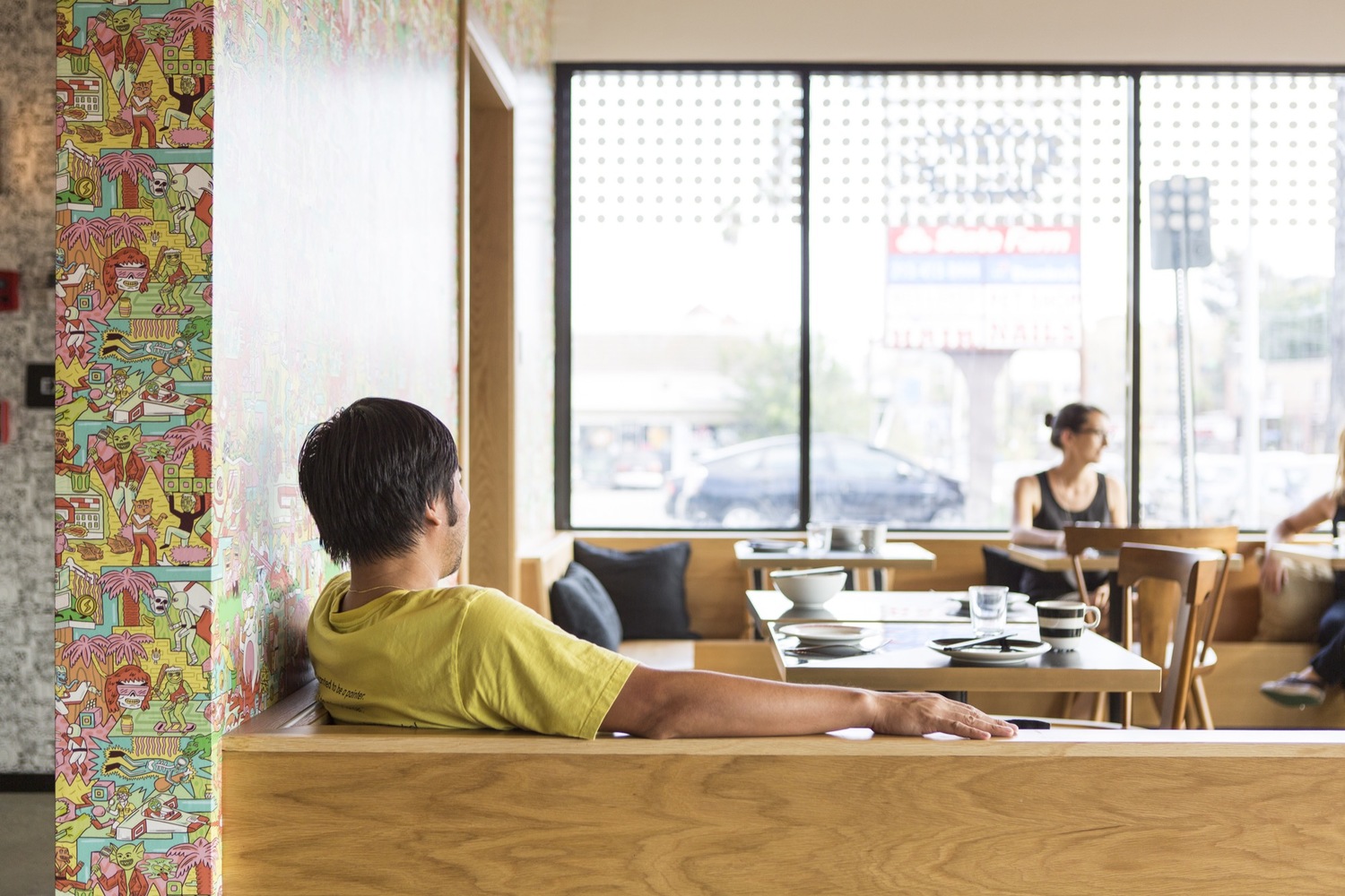 Located in a ubiquitous strip mall along Sunset Boulevard in Echo Park, the neighborhood is rich with a varied history and recent transformative change. The overall design is rooted in multiple LA centric time periods with nods to the 1980s and 1990s in material and color choices, mixed with the local haunt feel resonant in film noir classics like “Chinatown”. These inspirations and influences intertwine with post-modern design and pop cultural references to create a maximal timeless experience- an Elysian Drift.