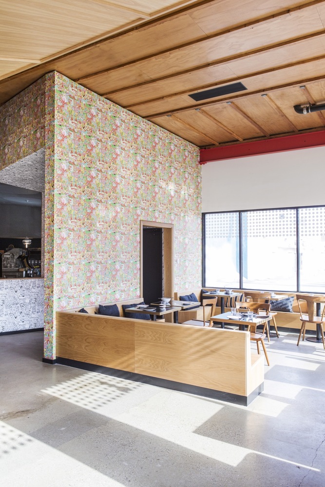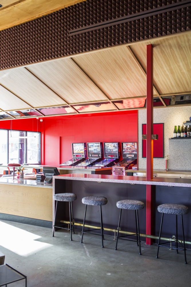 On the interior banquettes are covered with camel colored vinyl and plywood paneling; smokey mirror, marmoleum, and dark brown are all nods to the noir mystique and a contemporary version of police academy haunts of the past. Interior details reflect a mash-up of both local real and fictionalized influences juxtaposing post modern laminate with brass foot rails, marmoleum and oak wood paneling, and vermilion powder coated steel with camel colored vinyl. Unusual material exploration is playfully scattered throughout the space from painted battens on wood paneling, hand-painted artwork to pyramidal acoustic foam and 3D coffered ceiling patterns made of homosote.