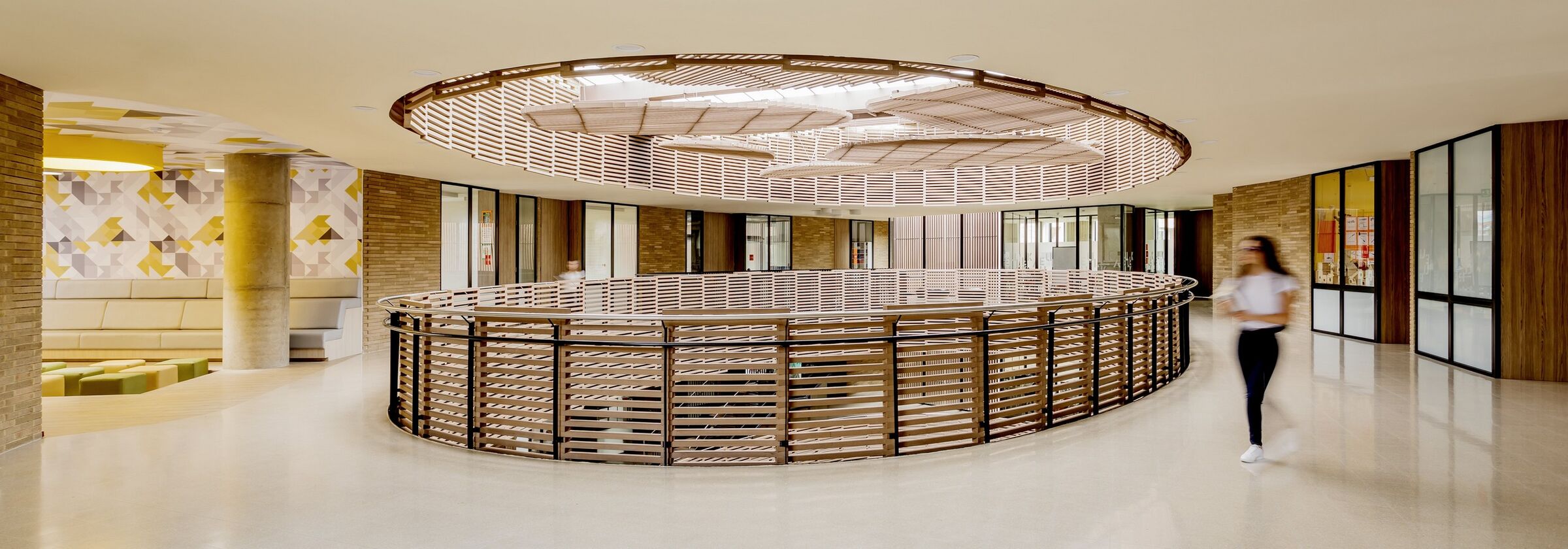 The design of the Eureka Centre Building for the Anglo Colombian School performs as a common ground where research, experimentation, the search for ideas and learning processes, among others, come together in a cyclical system of learning; hence, the concentric construction that surrounds them.