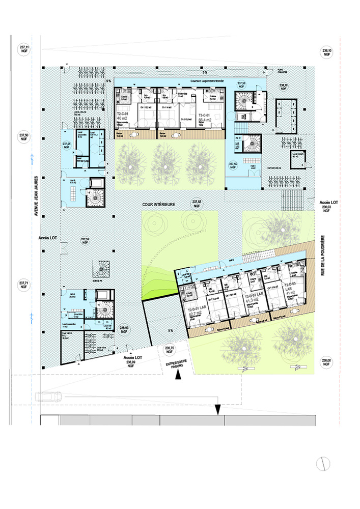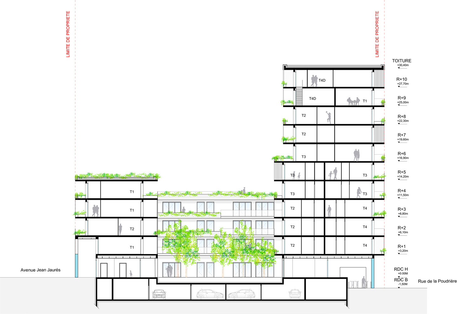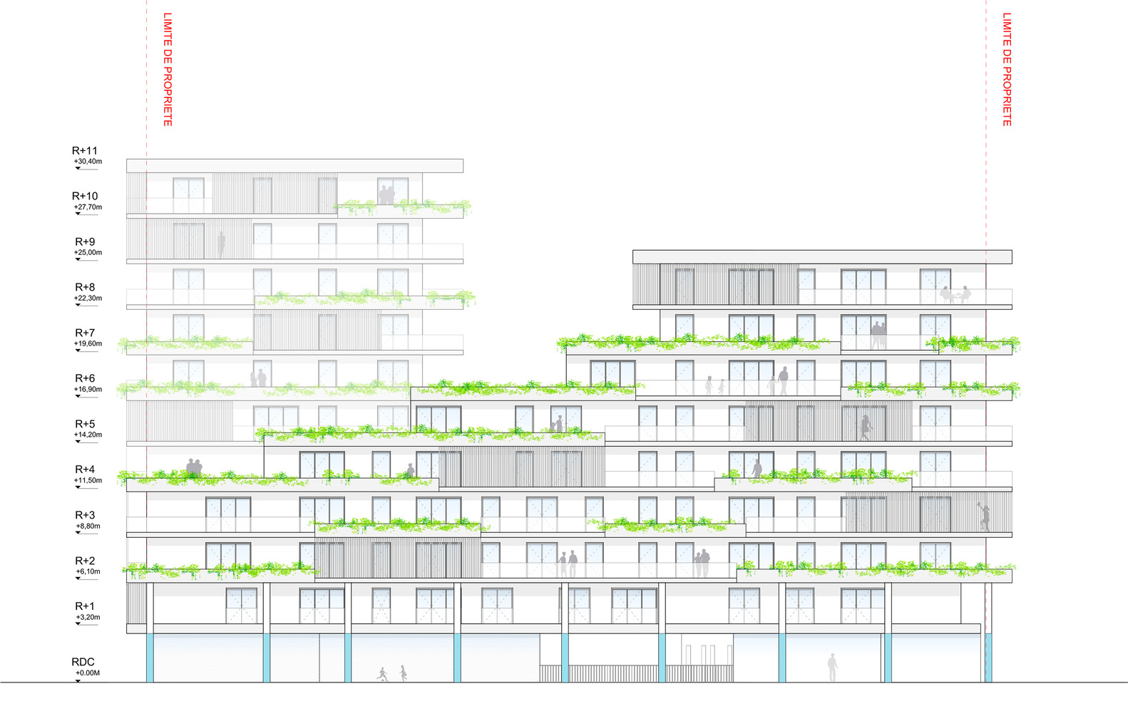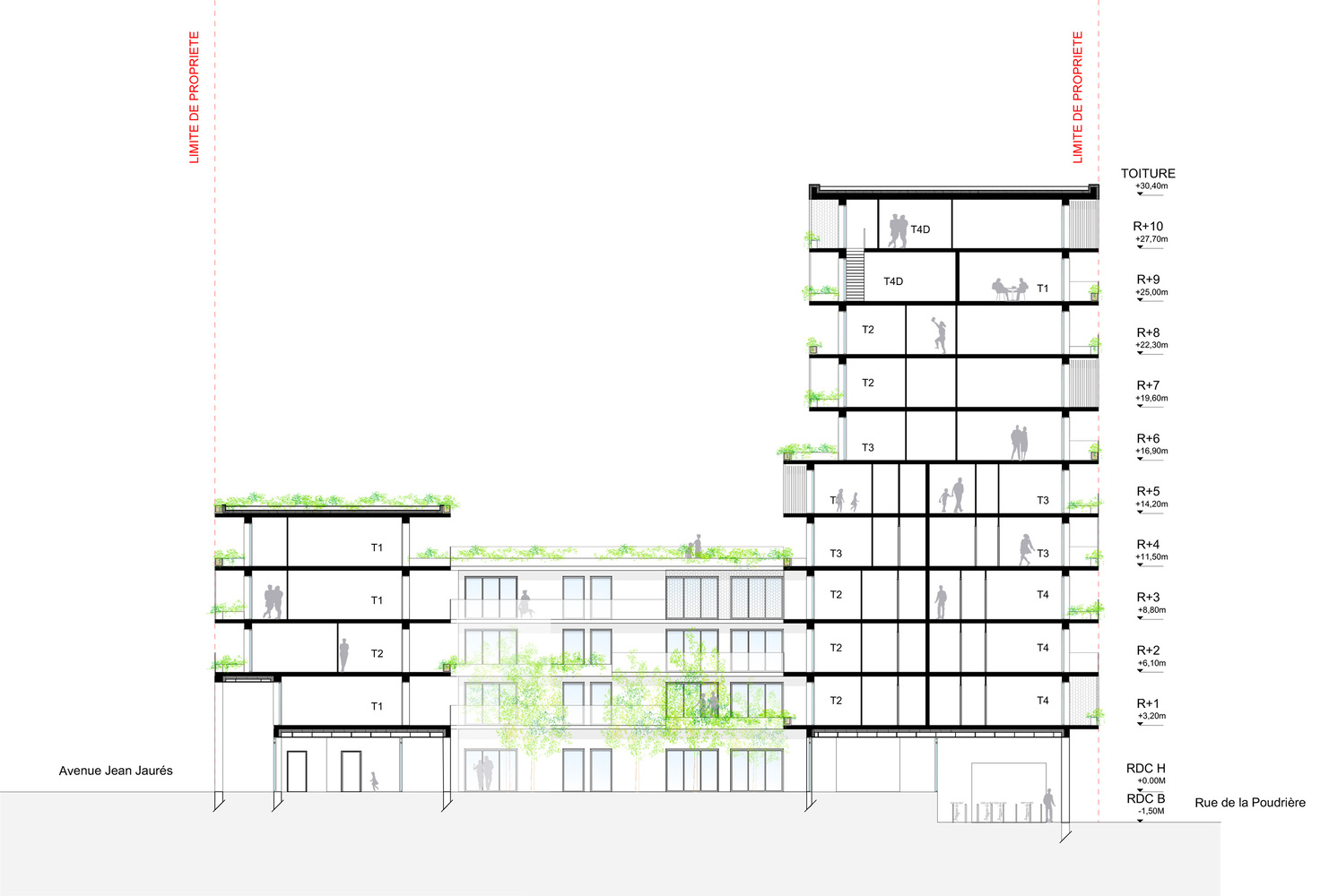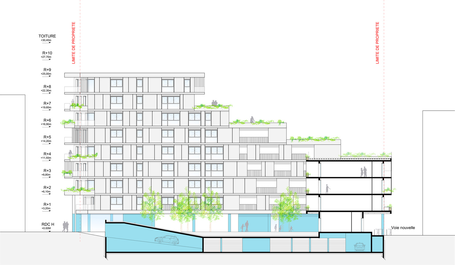 The ground floor’s transparency links Avenue Jean Jaurès and the eco district that develops towards the east. This creates views in several directions, all the way to the communal courtyard that opens onto the future community building, which will be constructed at the same level as the “Halle de l’Etarmat.”