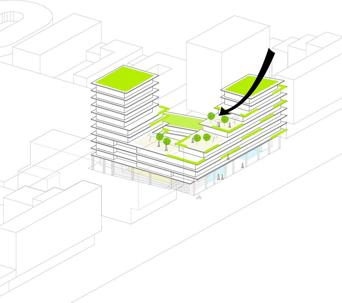 The detail on the volume’s tiers creates a varied silhouette and also multiplies the different possible uses of the rooftop space.