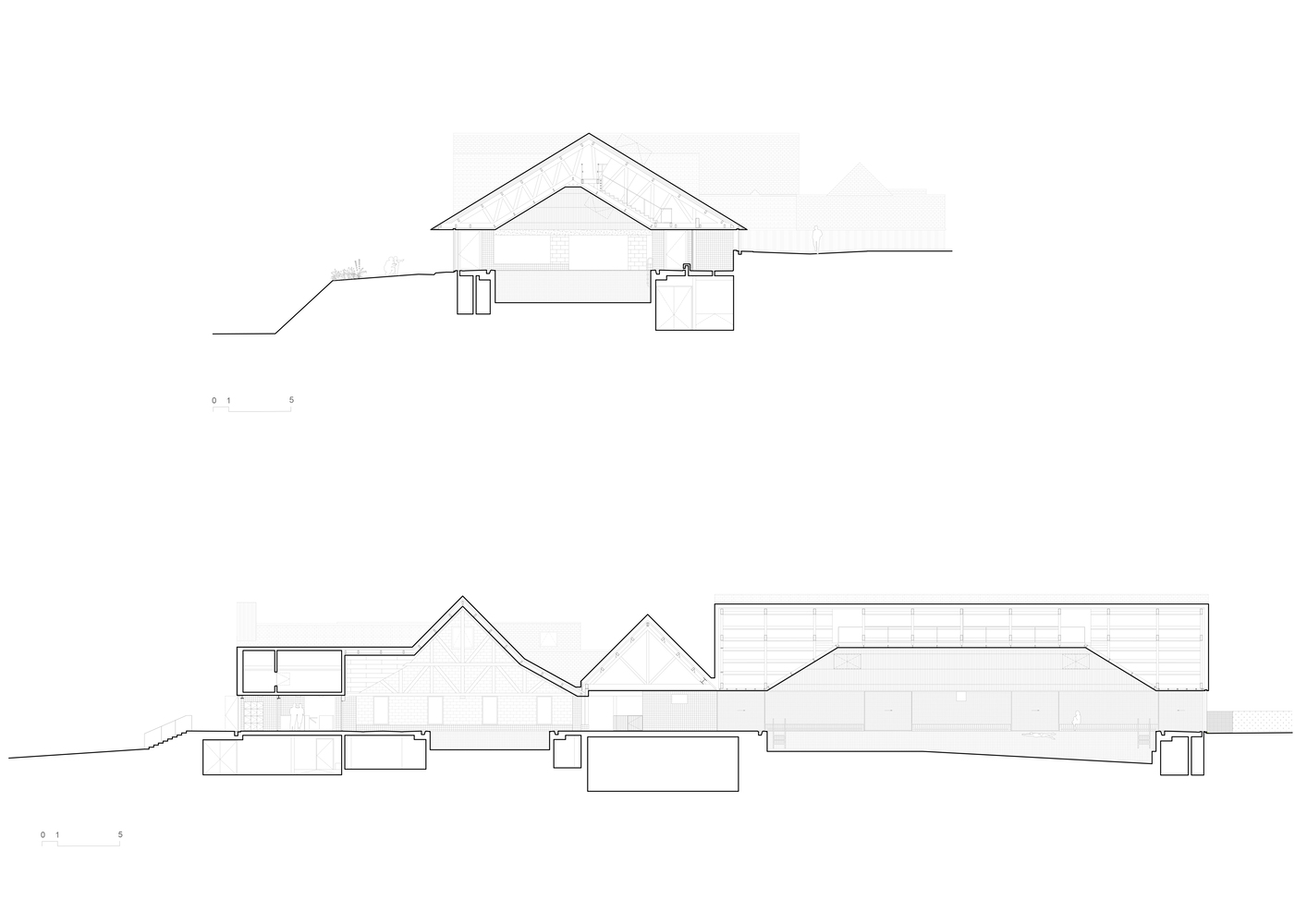 The new pool is integrated into the continuity of the existing one by offering the abstraction of a large volume of slates, leaving the pools' surrounds very open to the landscape.