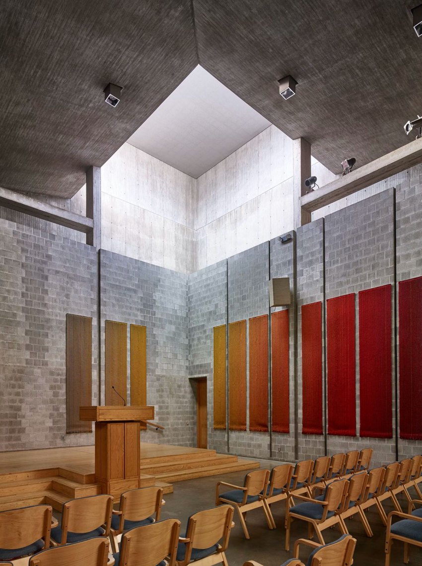 The spatial configuration of the church, like many of Kahn’s works, was defined by a series of interconnected geometric forms. The central worship space is octagonal, surrounded by triangular spaces accommodating the ancillary functions of the church, such as the choir and the organ. The inherent flexibility of this design allowed the central space to be utilized for a variety of congregational needs, showcasing Kahn’s keen understanding of multi-functional spaces.