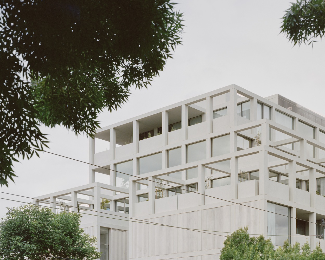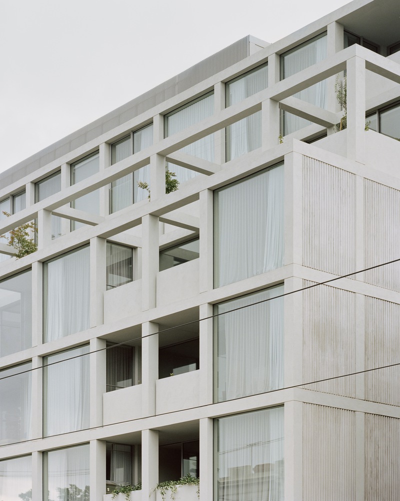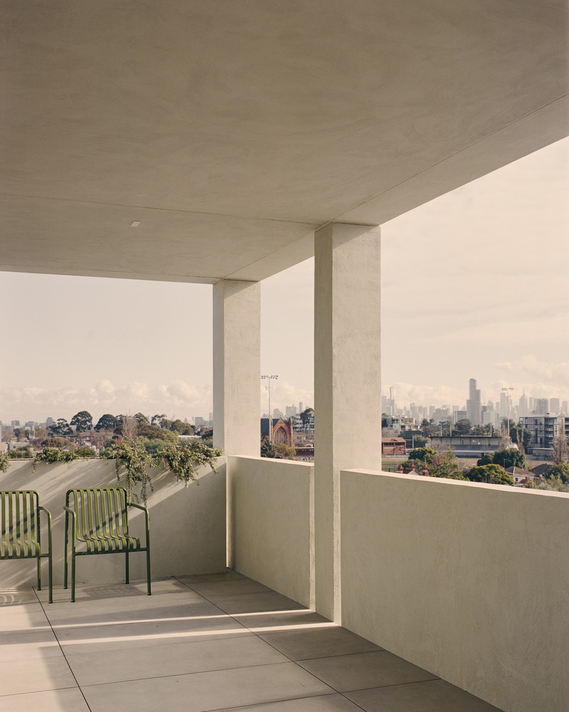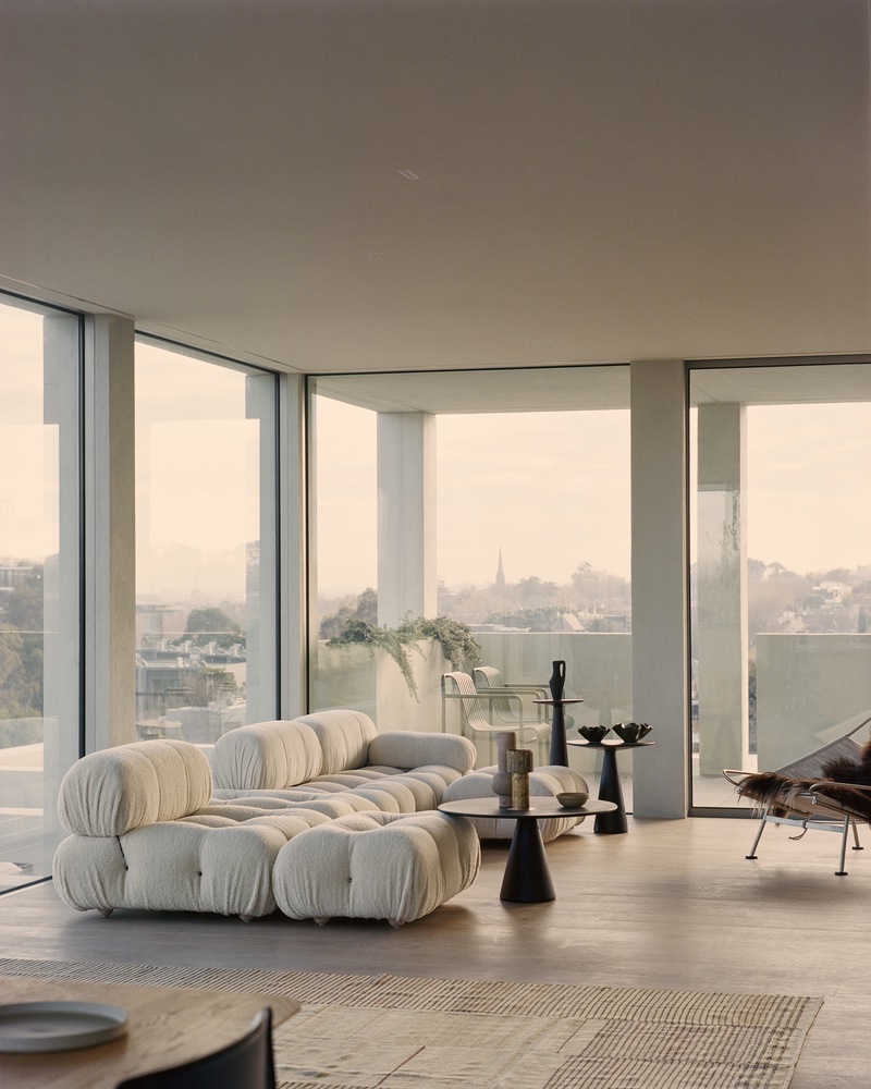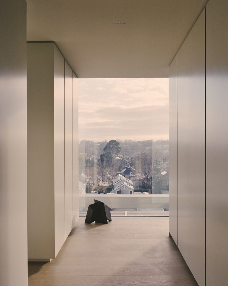 The façades to the east and south are highly refined and detailed, while those to the north and west gradually step back, wrapping around and dissolving the form with the use of the framing. The effect is calmness through consistency and balances through repetition. Through lush planting, Acre worked to find ways to soften the rectilinear grid of the building, while offering each apartment an aspect of green. They achieved this by designing climbing structures that over time will see greenery climbing and draping from the large gridded façade. This is a building that breathes. The pinnacle is the soaring 13-meter void in the center, clearing a vertical pathway for the private residential lobby. As each level recesses, the building is punctuated by clear glazing offering sweeping views across Armadale over the city skyline. In doing so, large terraces reveal gardens and open spaces to further soften the distinctive exterior.