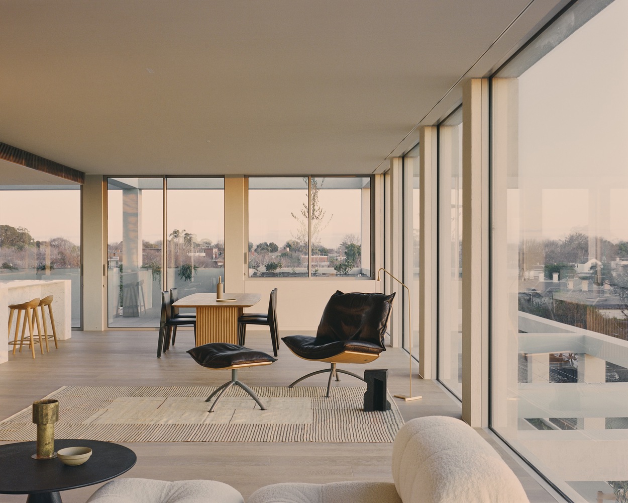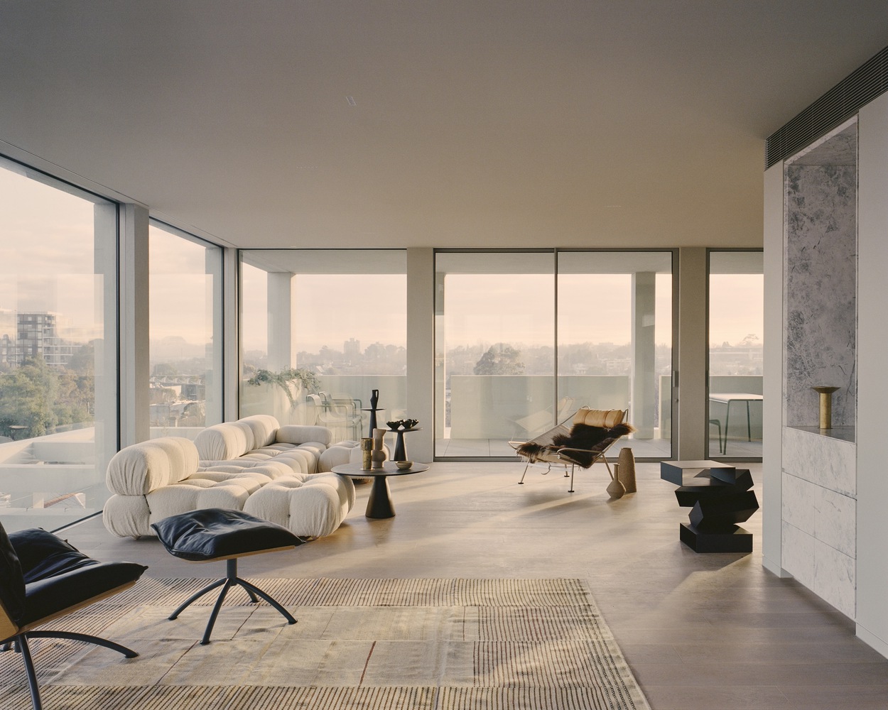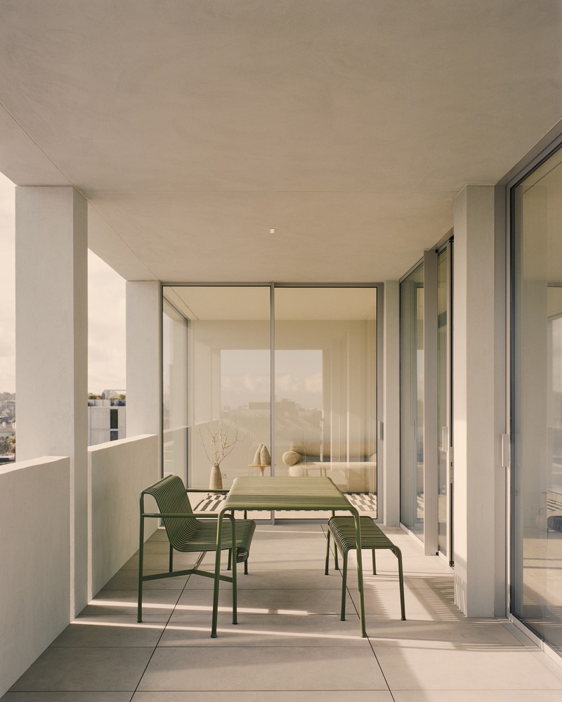 The apartment planning process was underpinned by biophilic design principles and the desire to provide each home with an axis to external views and ventilation. The resulting ambiance is dramatic. As you enter each apartment and journey through each room, the omnipresent natural light offers a sense of calming expansiveness. The building steps back, and the interior planning works in tandem with the external grid, affording many of the secondary spaces Juliette balconies. By having this strong relationship between the exterior and the internal spaces, the interior spaces speak for themselves and take center stage with framed views beyond.