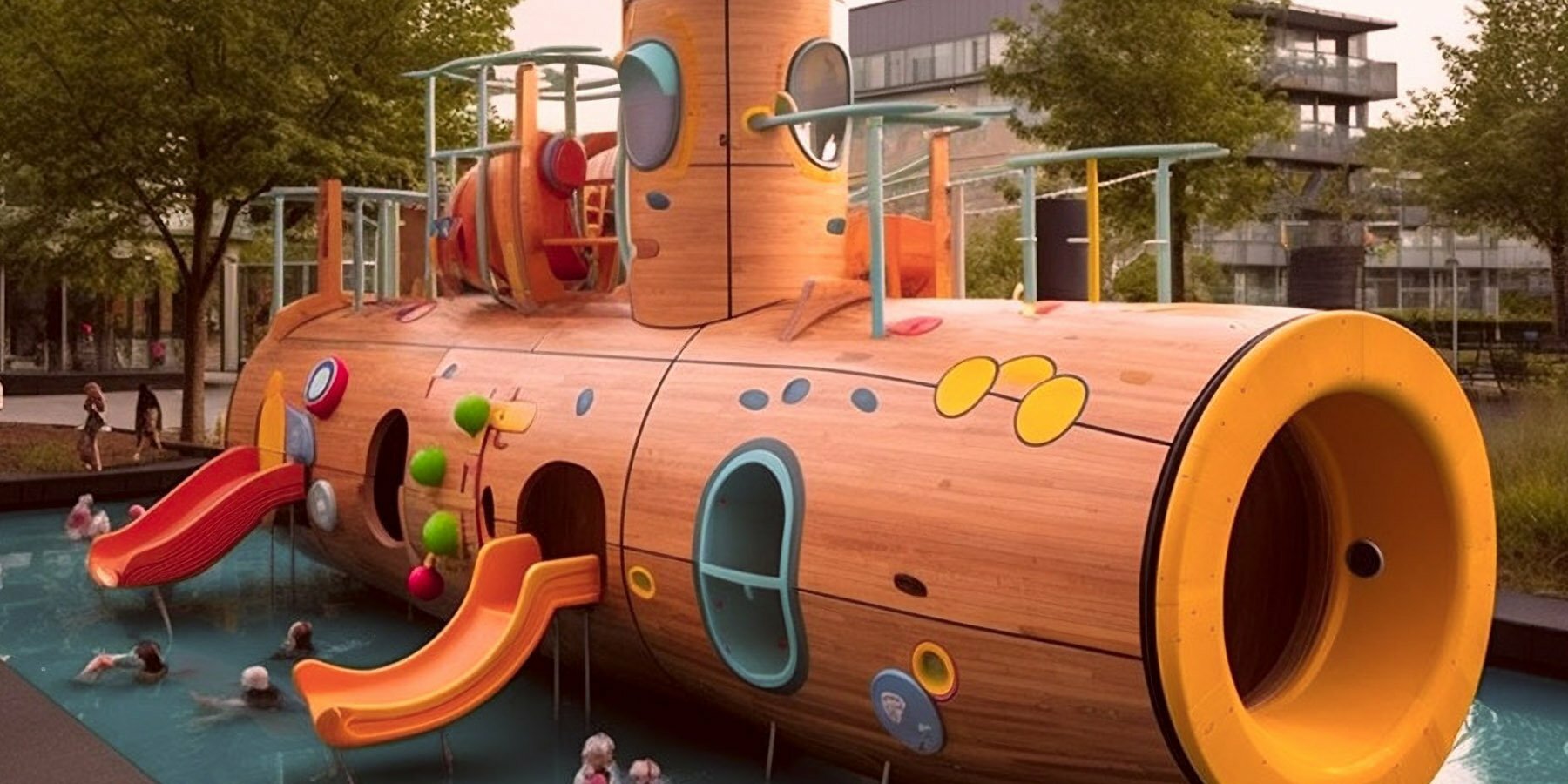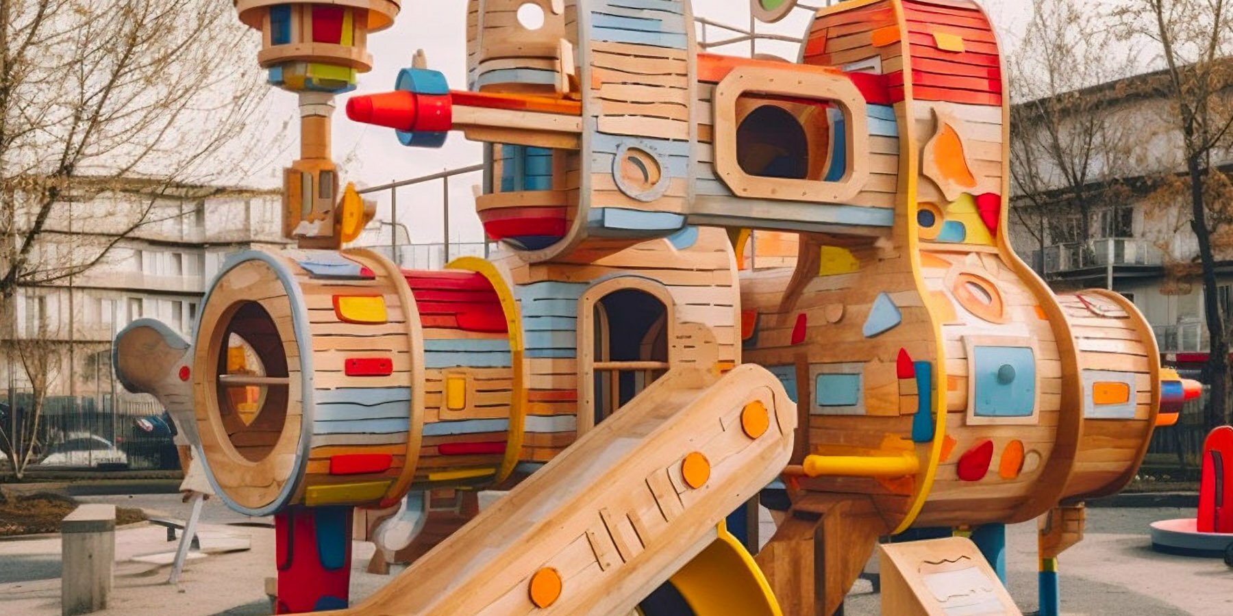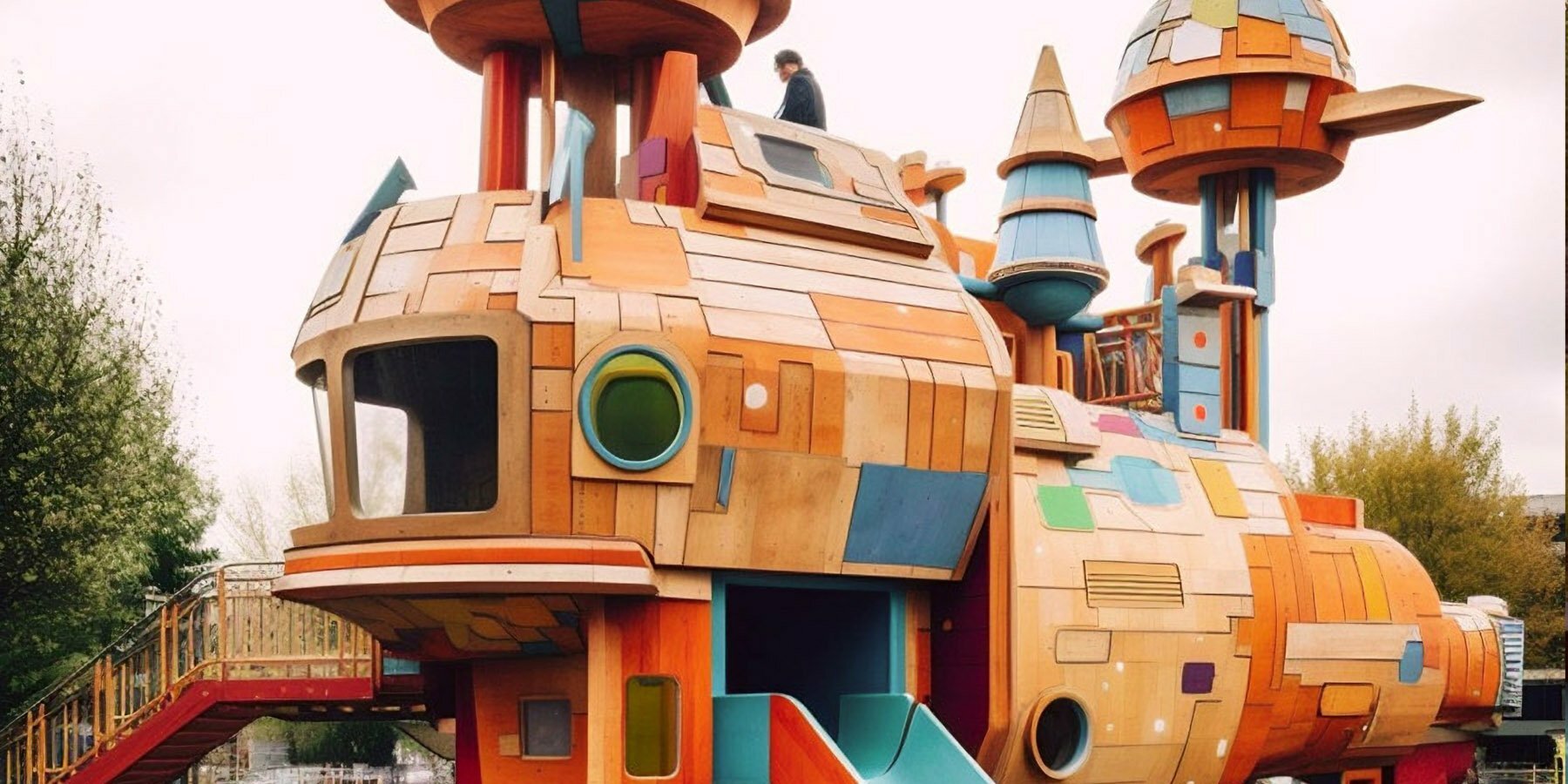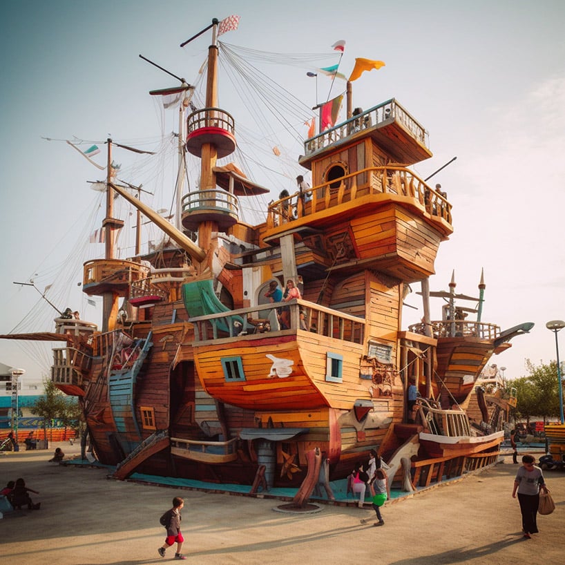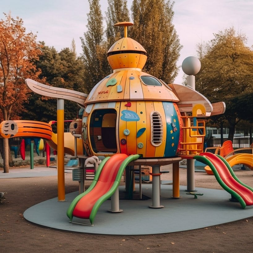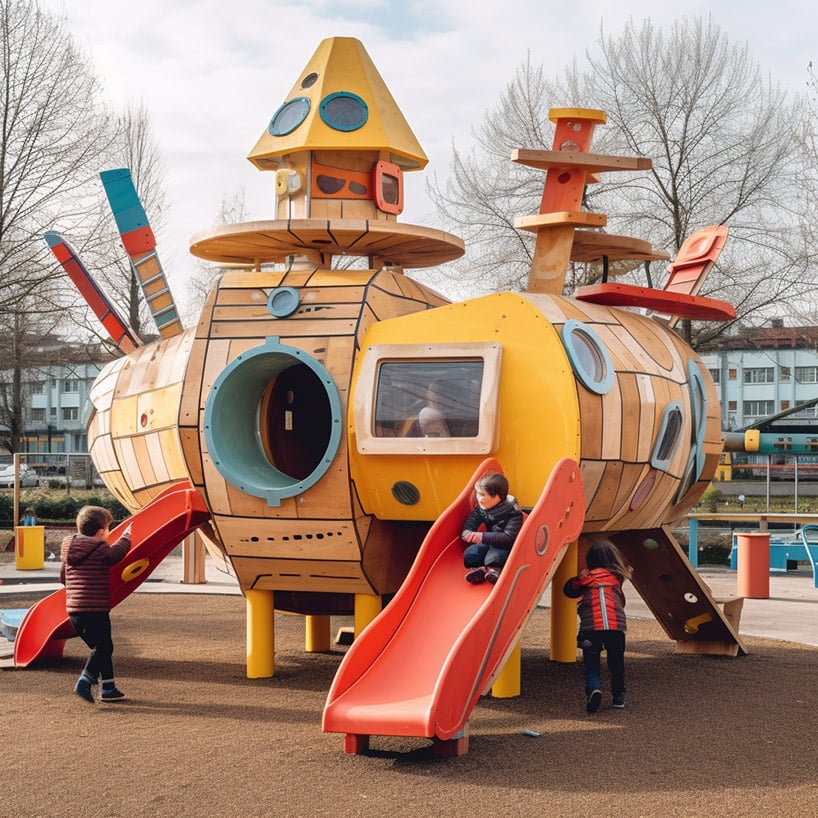 vibrant AI series conceives children's playgrounds as spaceships, boats, and zeppelins