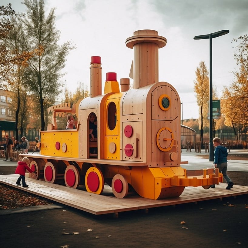 Madrid based multidisciplinary creative Emilio Alarcón conceives ‘Evocative Playgrounds’, a digital art project that reflects on children’s playgrounds bringing various play structures of different scales to life. Drawing from the design of spaceships, locomotives, boats, and zeppelins, the artist utilizes Midjourney text-to-image generating software to construct structures of vibrant colors primarily imagined as wooden volumes that include elements and accessories made of metal and plastic. By the means of artificial intelligence and a careful iterative process, the series illustrates several arrangements dedicated to children’s recreational games.