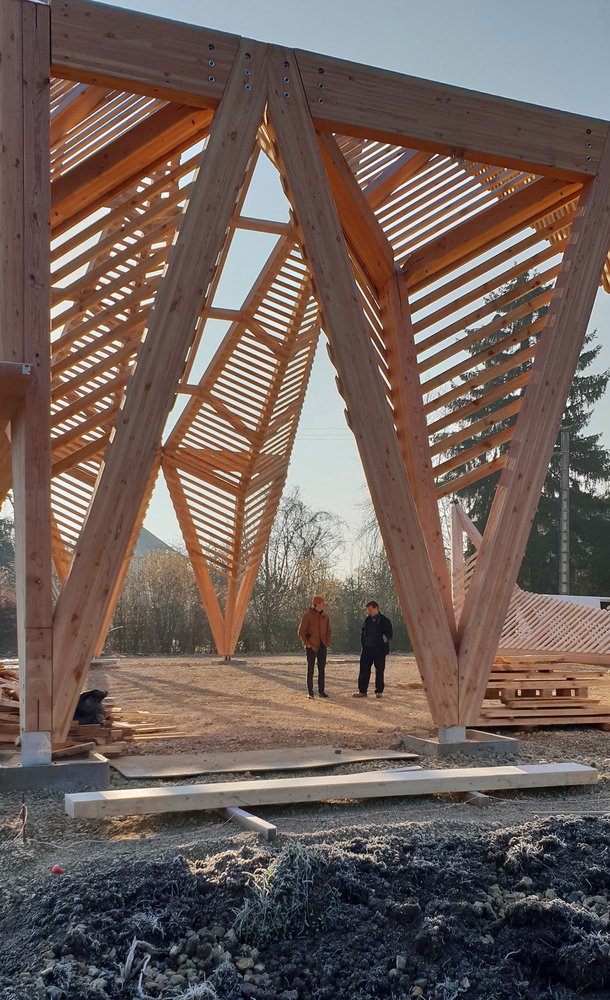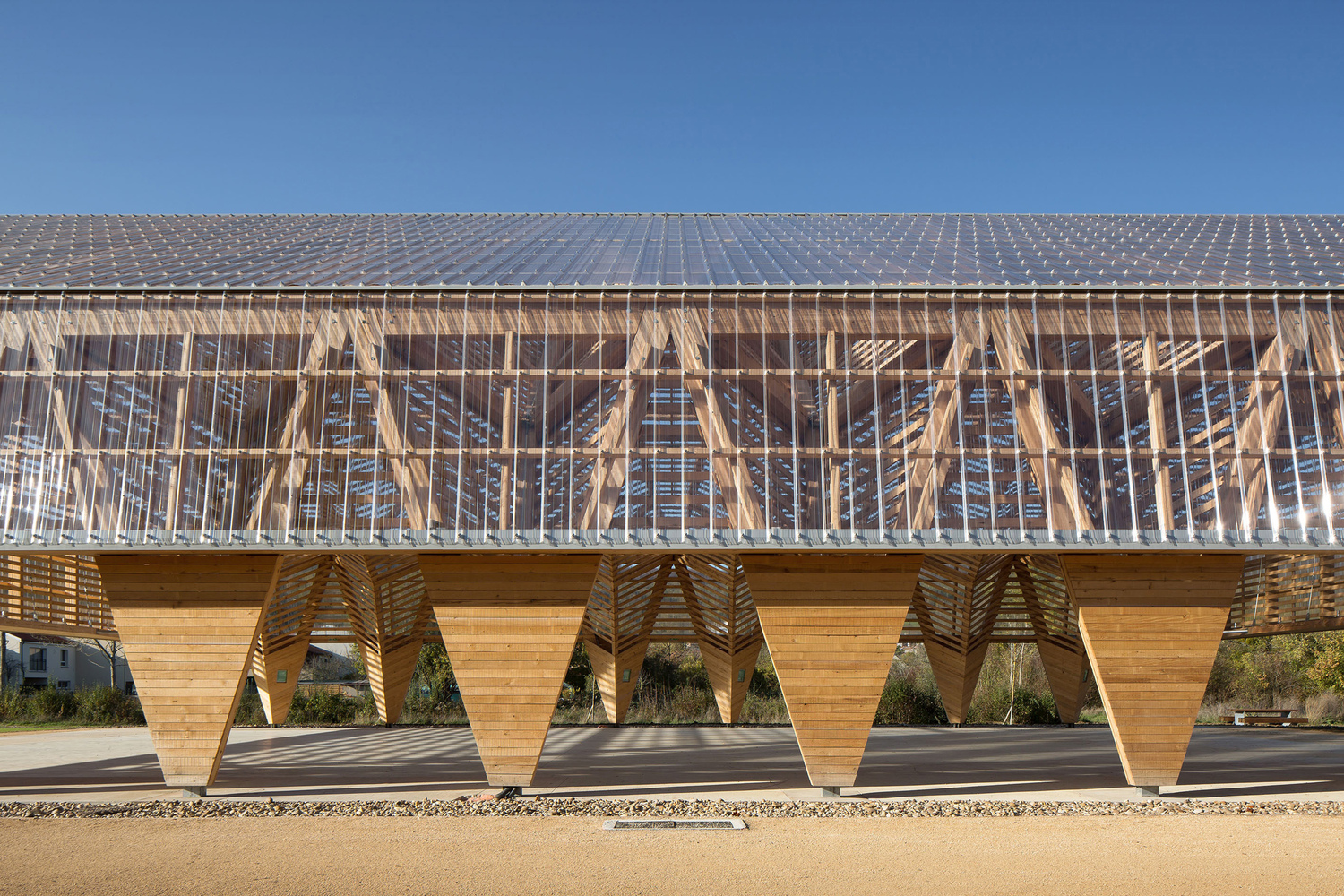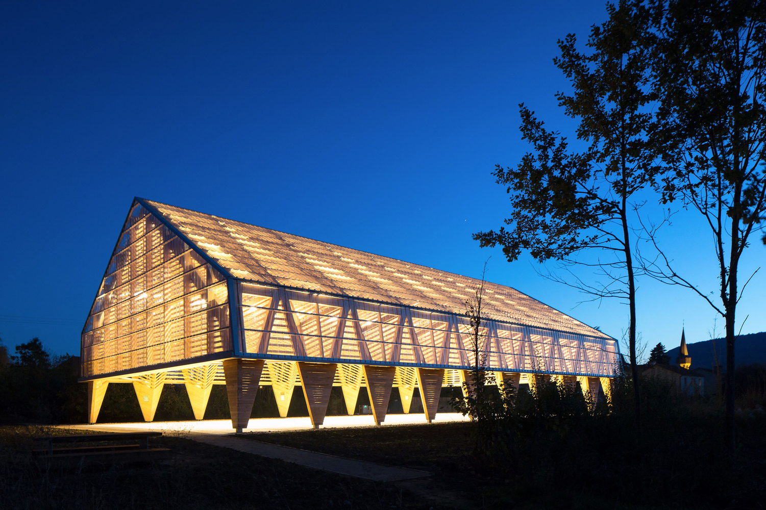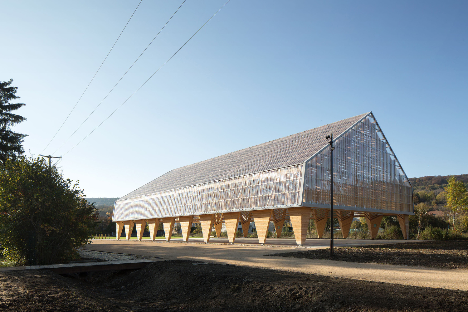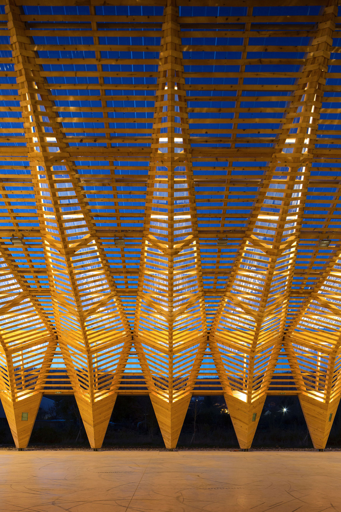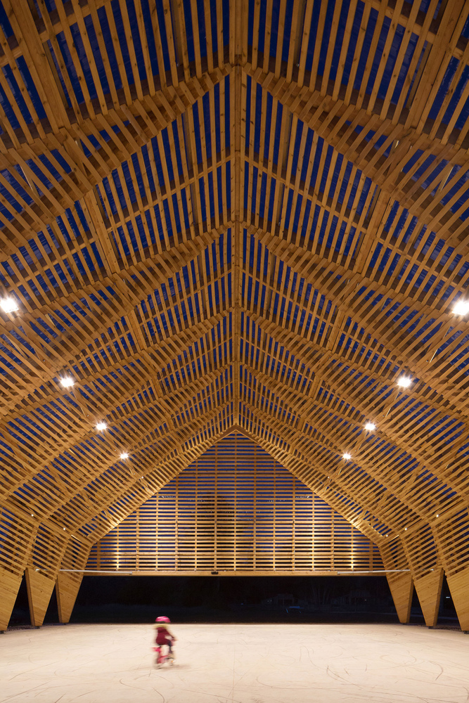 The main structure is made of glue laminated Douglas fir. The cladding and timber shell are in black pine coming from a communal forest. Finally, the roof is covered in transparent polycarbonate boards. And it extends vertically to cover the facade until 3 meters high.