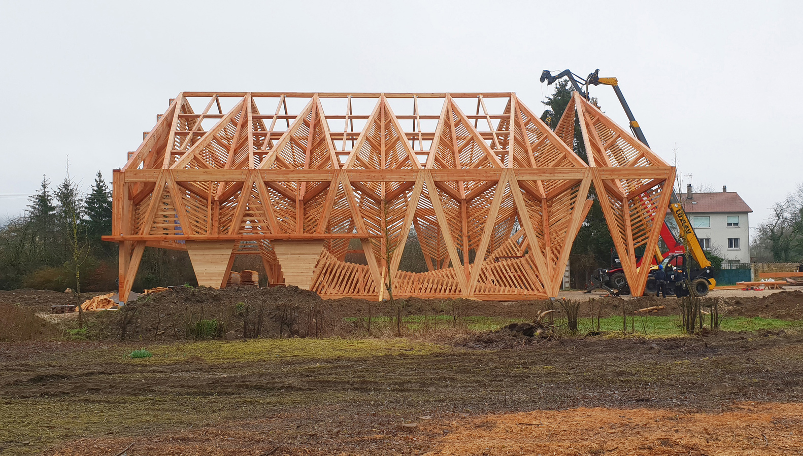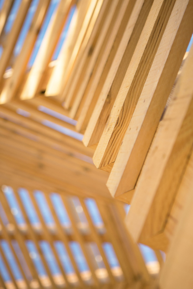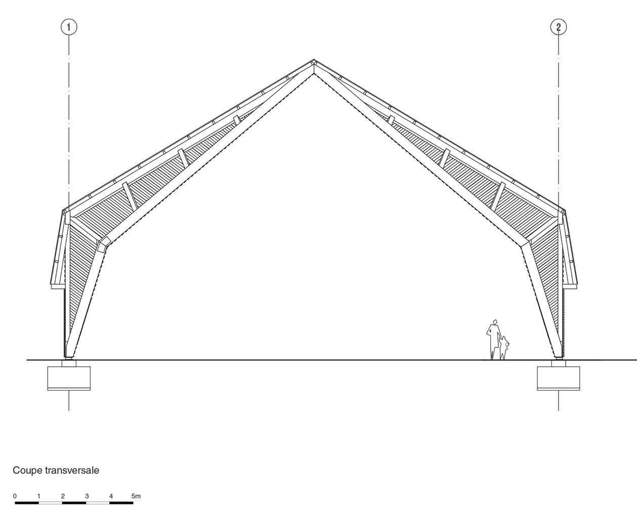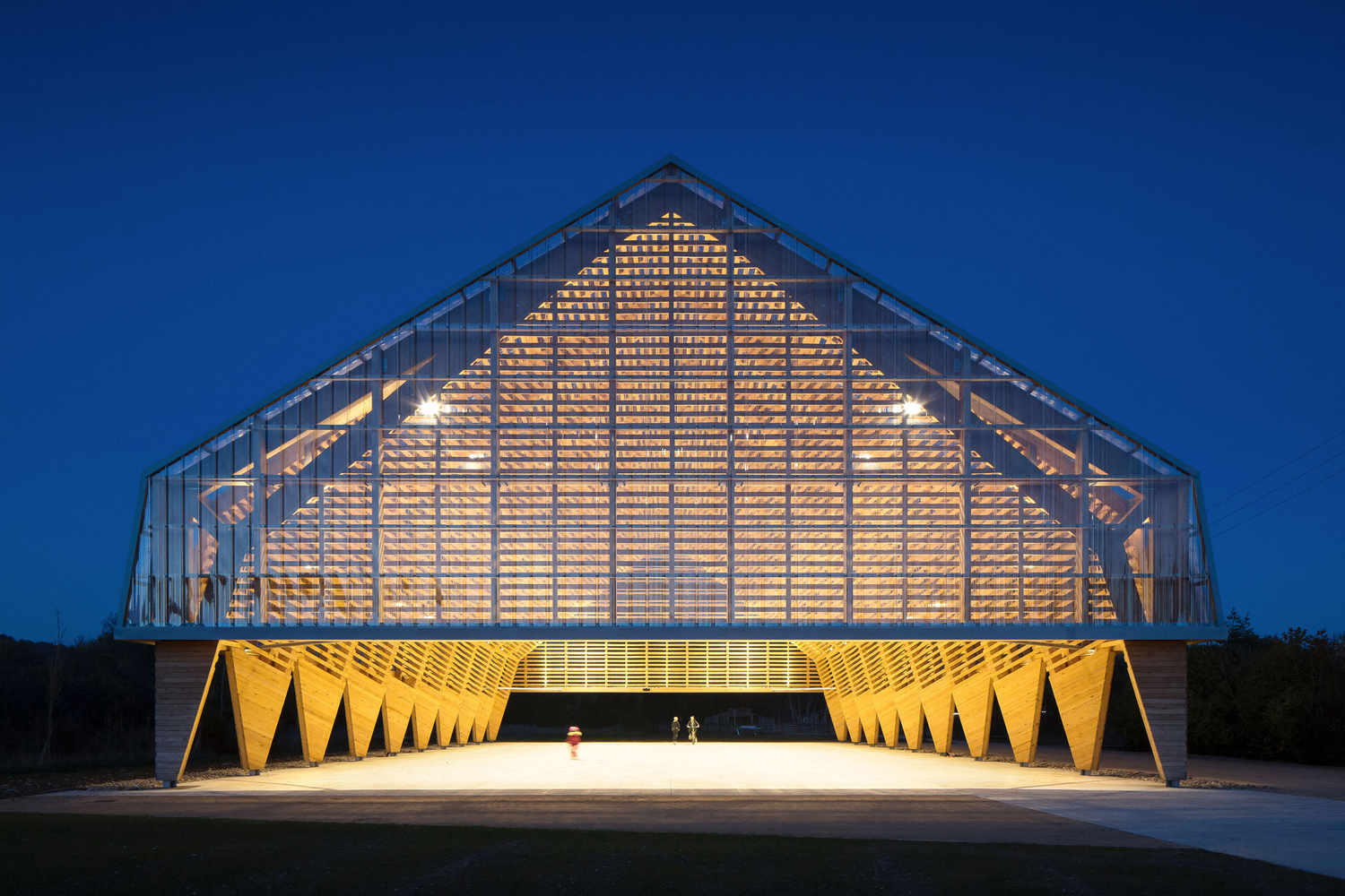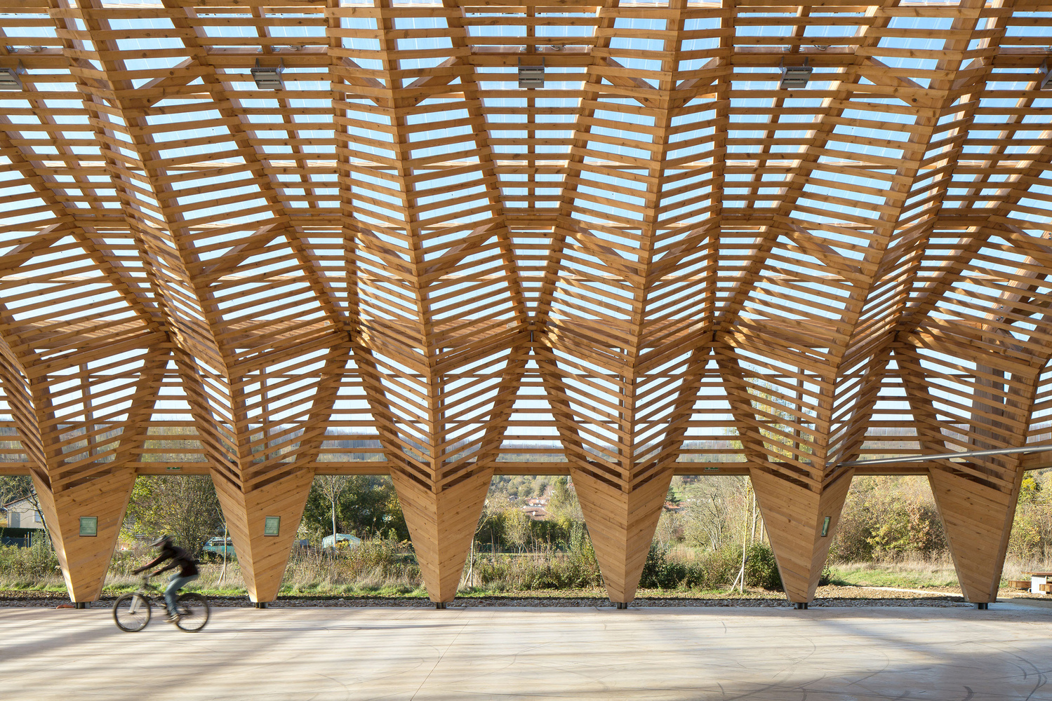 The main structure is made of glue laminated Douglas fir. The cladding and timber shell are in black pine coming from a communal forest. Finally, the roof is covered in transparent polycarbonate boards. And it extends vertically to cover the facade until 3 meters high.