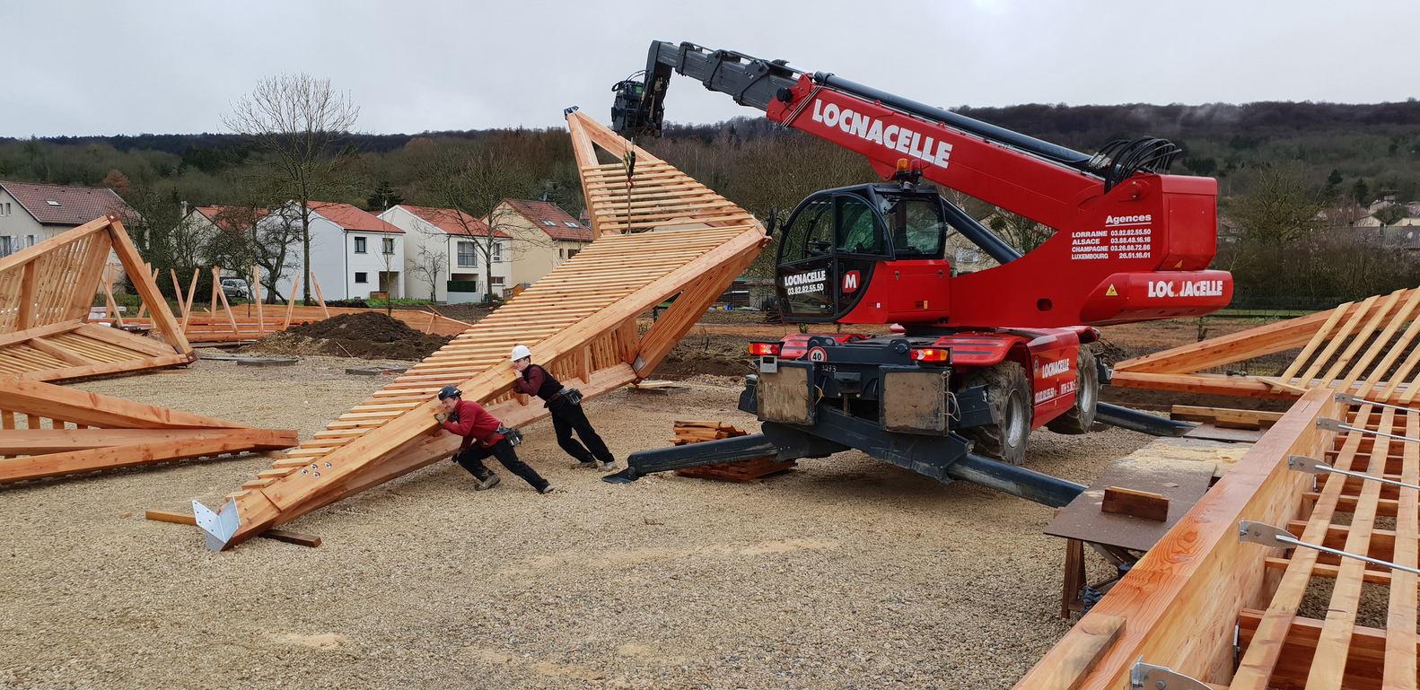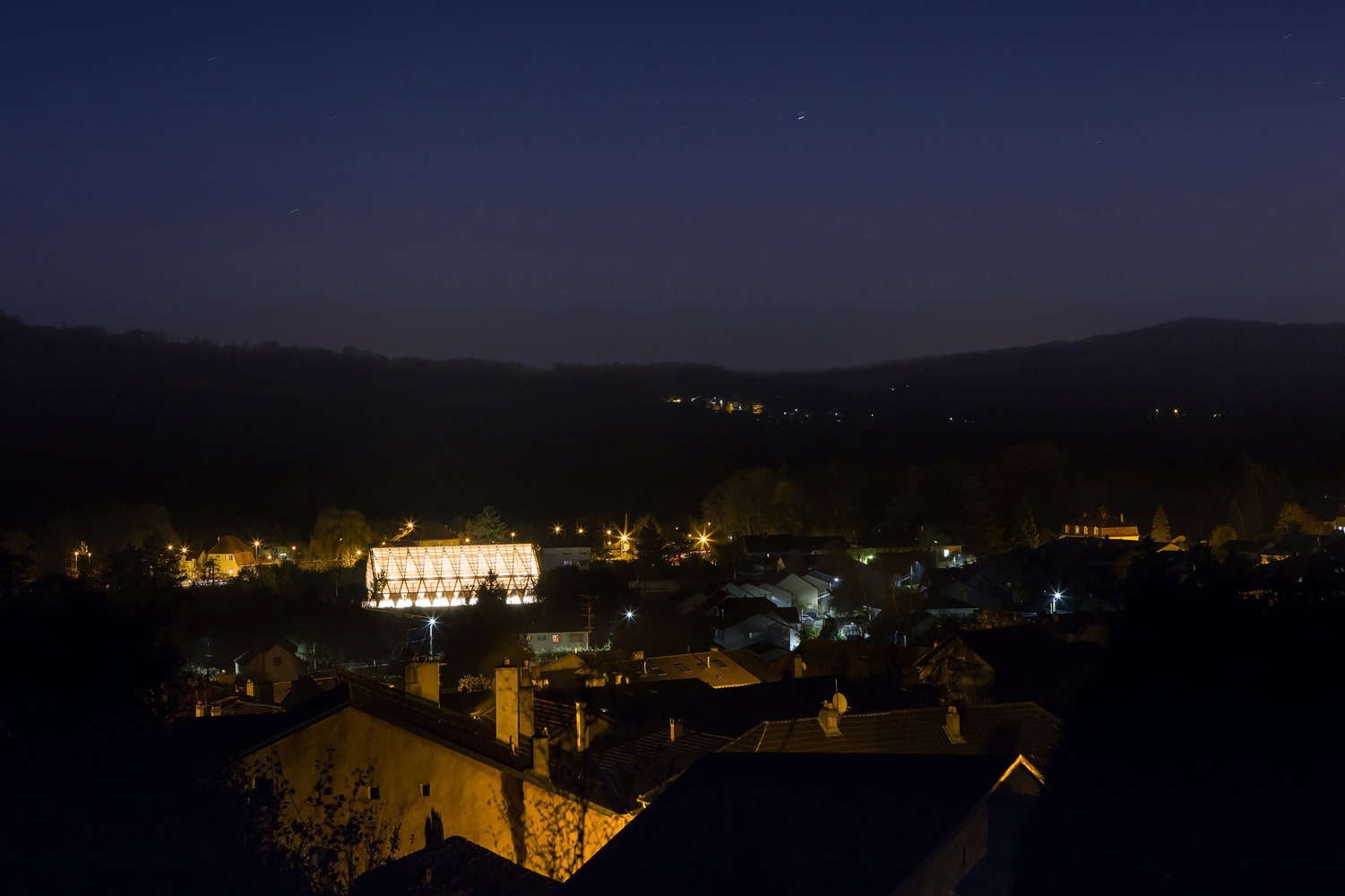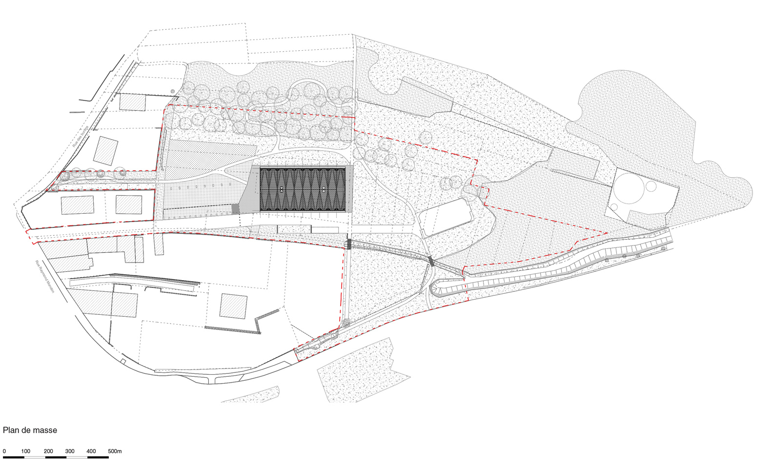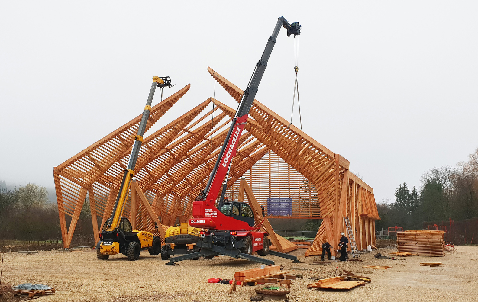 The main structure is made of glue laminated Douglas fir. The cladding and timber shell are in black pine coming from a communal forest. Finally, the roof is covered in transparent polycarbonate boards. And it extends vertically to cover the facade until 3 meters high.