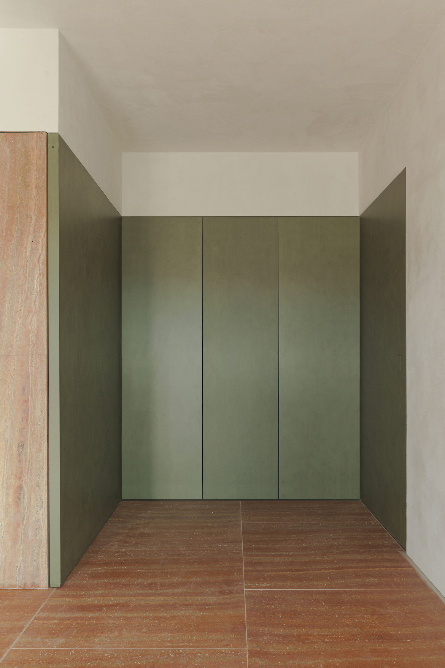 Distinctive material choices, colors, and textures are what sets this project apart. The predominance of terracotta on the floors and façade helps the structure merge with its environment, while elements of exotic Iranian Travertine marble, brass, and olive green joinery provide contrasting textures, creating an atmosphere in tune with the location. The house employs a steel frame structure, a modern adaptation of the traditional ‘Balloon Frame’ system popular in the United States. Galvanized steel profiling serves as the load bearing structure, supporting the façade and room divisions. For additional structural support, large metal frames are used, accommodating 18-meter openings and ushering quality light into the day spaces.