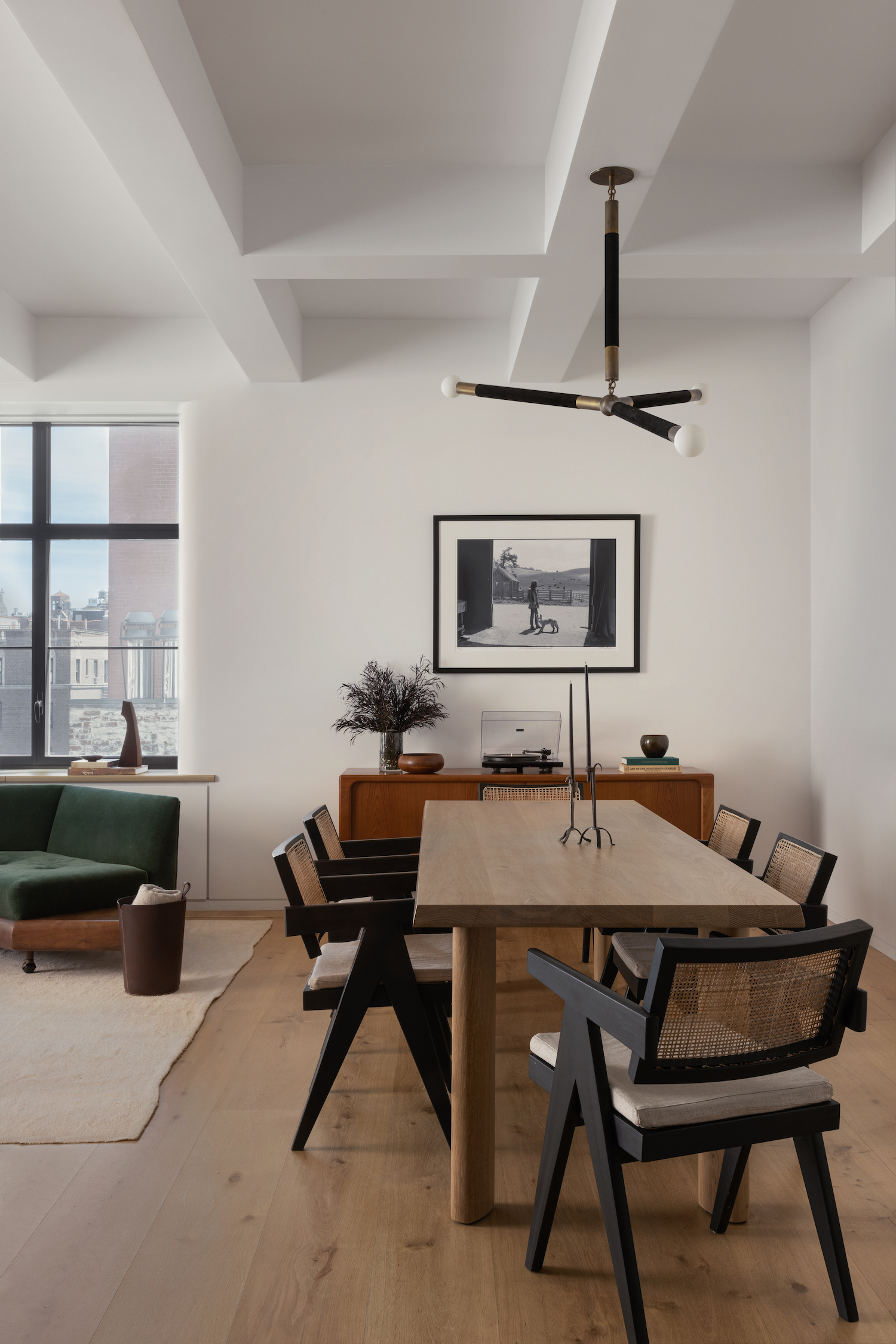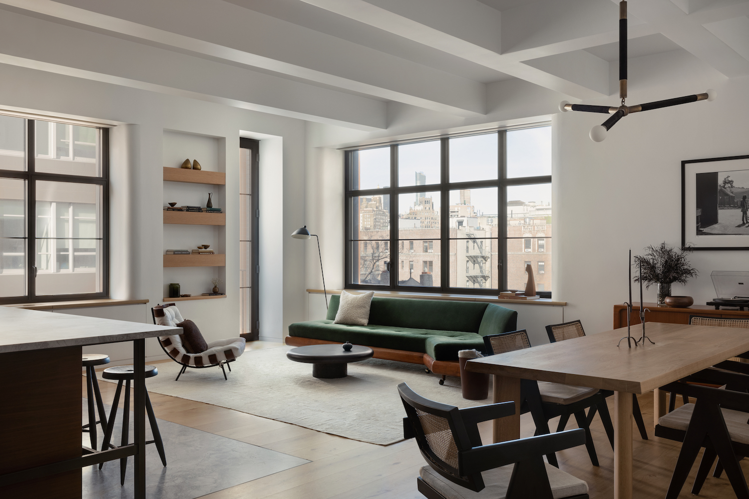 Morton Street is a minimal apartment located in New York, New York, designed by Westbourne Studio. In a harmonious blend of materials and styles, mineral plaster, mid century furniture, and contemporary lighting converge to form a striking and tranquil haven. The thoughtful integration of these elements results in a space that is both visually striking and conducive to relaxation. The use of mineral plaster, with its natural and textured appearance, added depth and character to the space. This choice of material establishes a strong foundation for the overall aesthetic of the space. Mid-century furniture takes center stage, imbuing the sanctuary with a timeless appeal. The clean lines and organic shapes of notable mid-century pieces, such as the Pierre Jeanneret dining chairs, contribute to an understated elegance. Each piece is thoughtfully selected to enhance the overall ambiance, while providing comfort and functionality.
