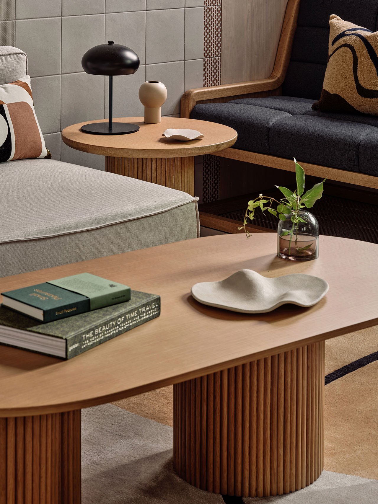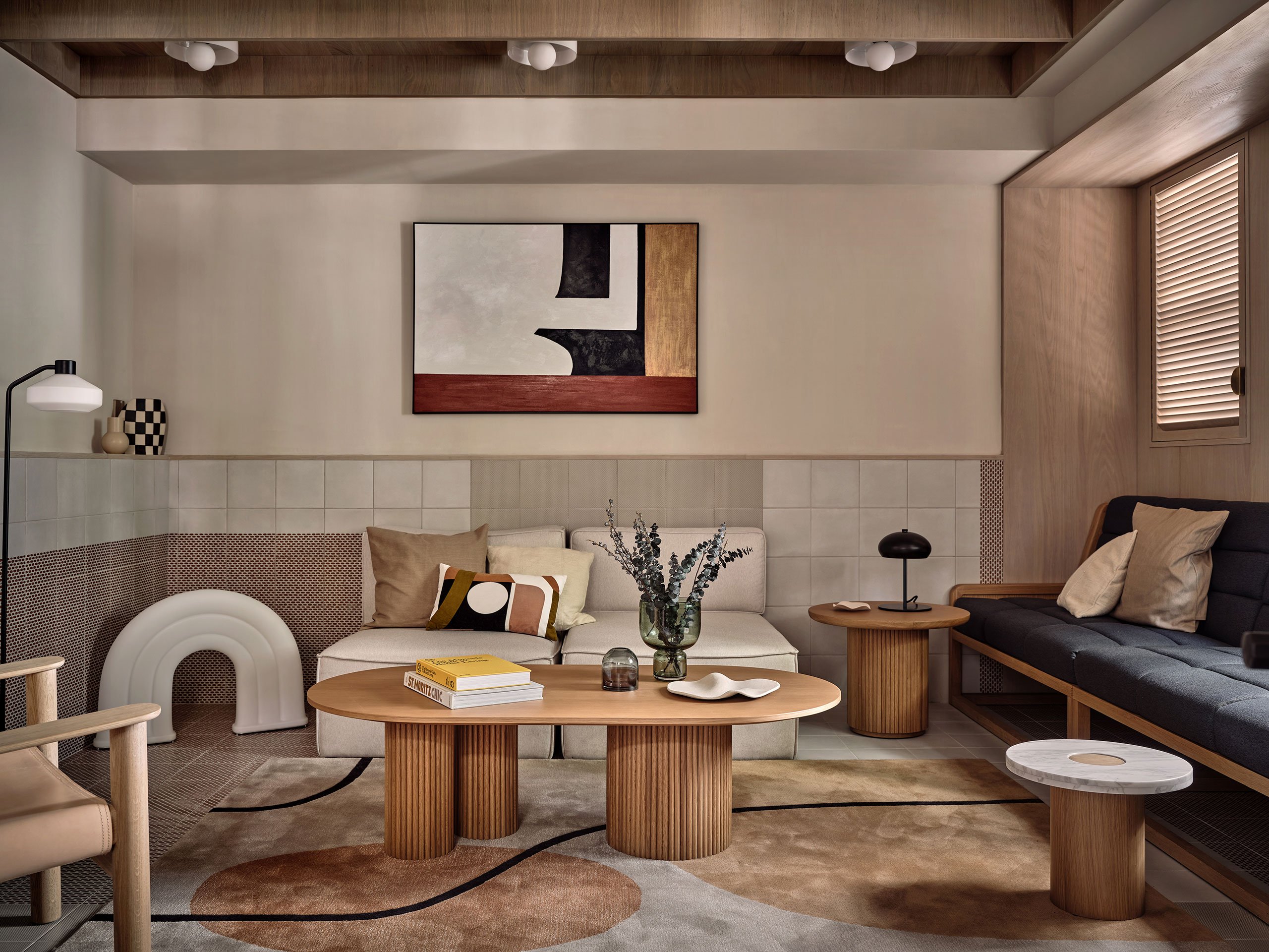 First in line is the Collector’s Room, a cosy space swathed in neutral beige tones featuring a light oak communal table perfect for congregating around to chat or work, with patio doors leading to a small terrace centred on an olive tree. Through the lift lobby, the Arcade is conceived as a playroom where guests can chill and play games, while the inviting Music Room takes on the role of a parlour with three custom-designed sofas. Throughout, ceramic floor tiles, hand-rendered plastered walls and wood-panelled ceilings create a soothing ambience and instil a sense of craftsmanship while a curated collection of artworks and objects that echo the geometric forms and muted colours of Linehouse’s interior design reinforce the scheme’s eclectic simplicity while adding character.