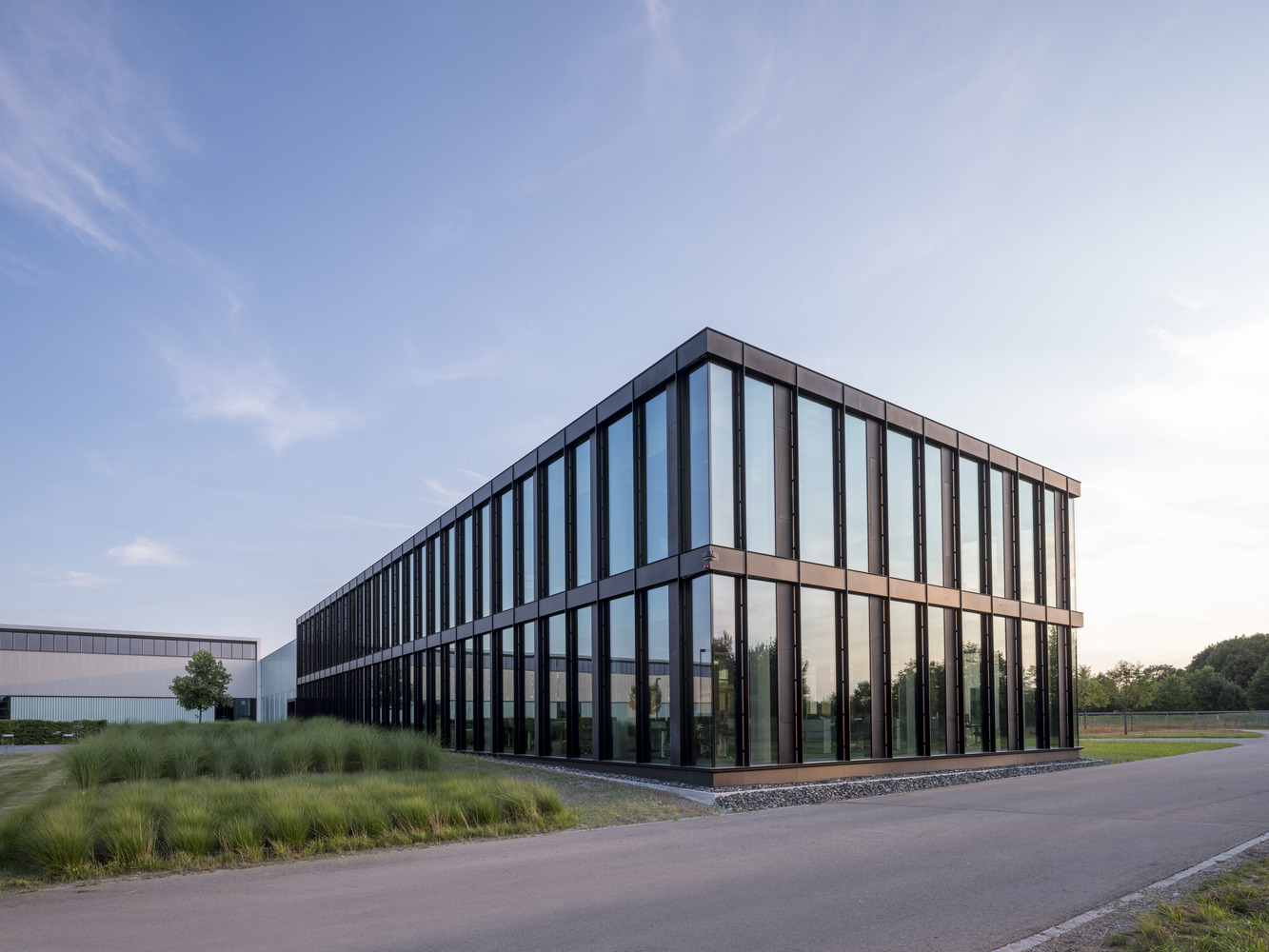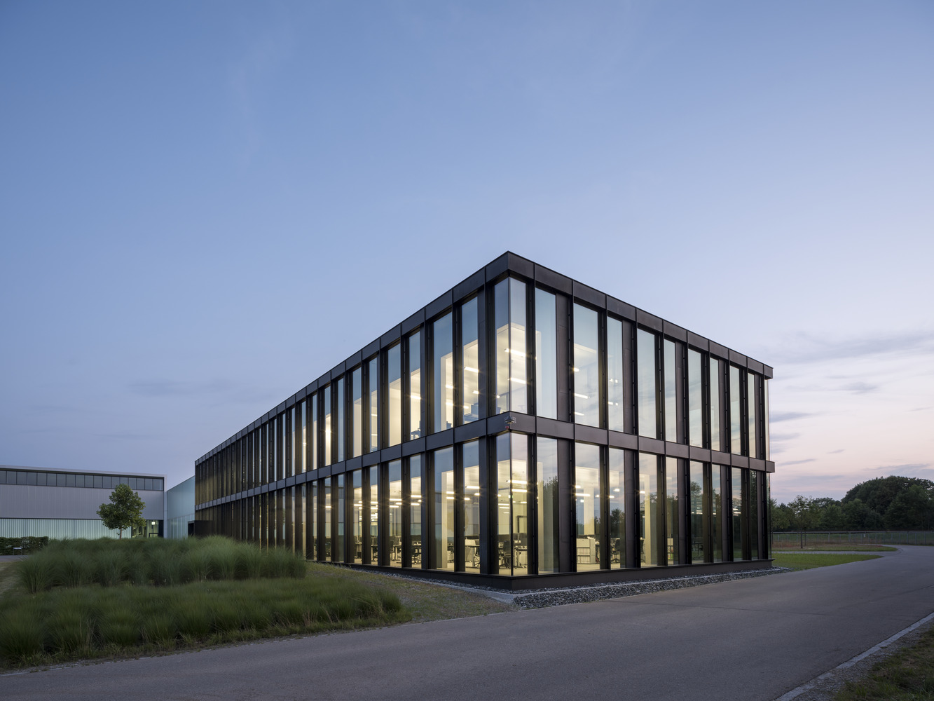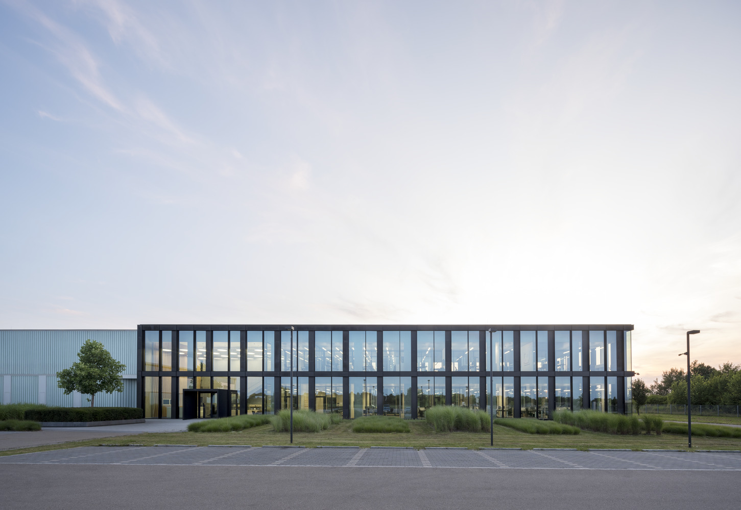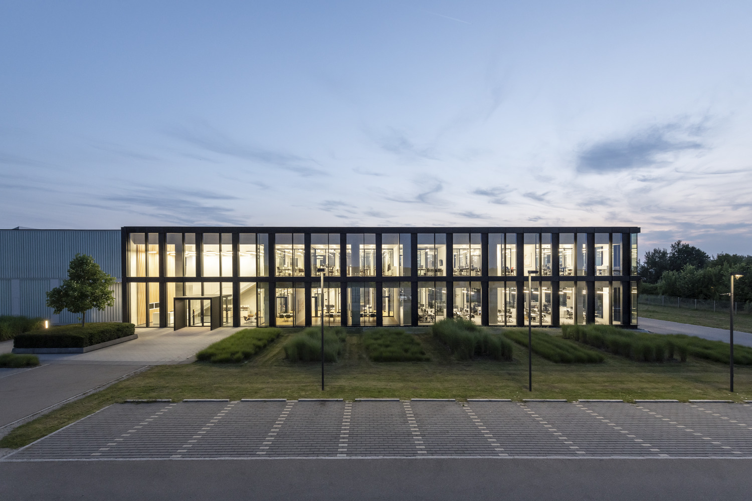 The extension marks the office building even more clearly as a representative area and introduction to the expansive ensemble of production halls. The new building is attached to the existing building, which required some architectural interventions there as well. In the spirit of sustainability, the existing front wall was detached and reused, and the extensive green roof was also expanded.