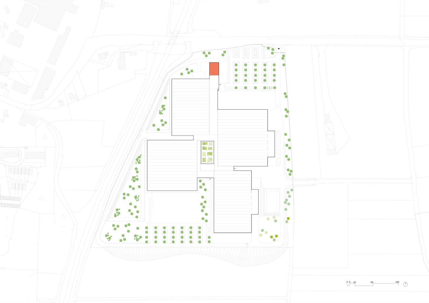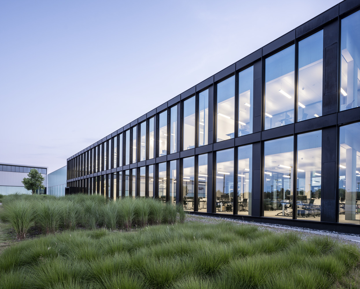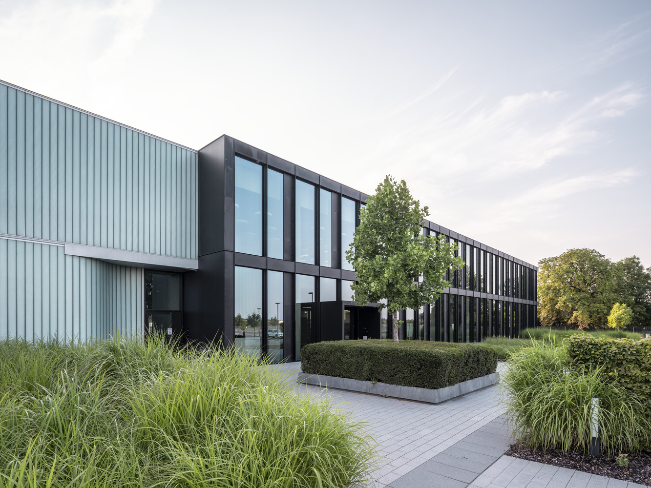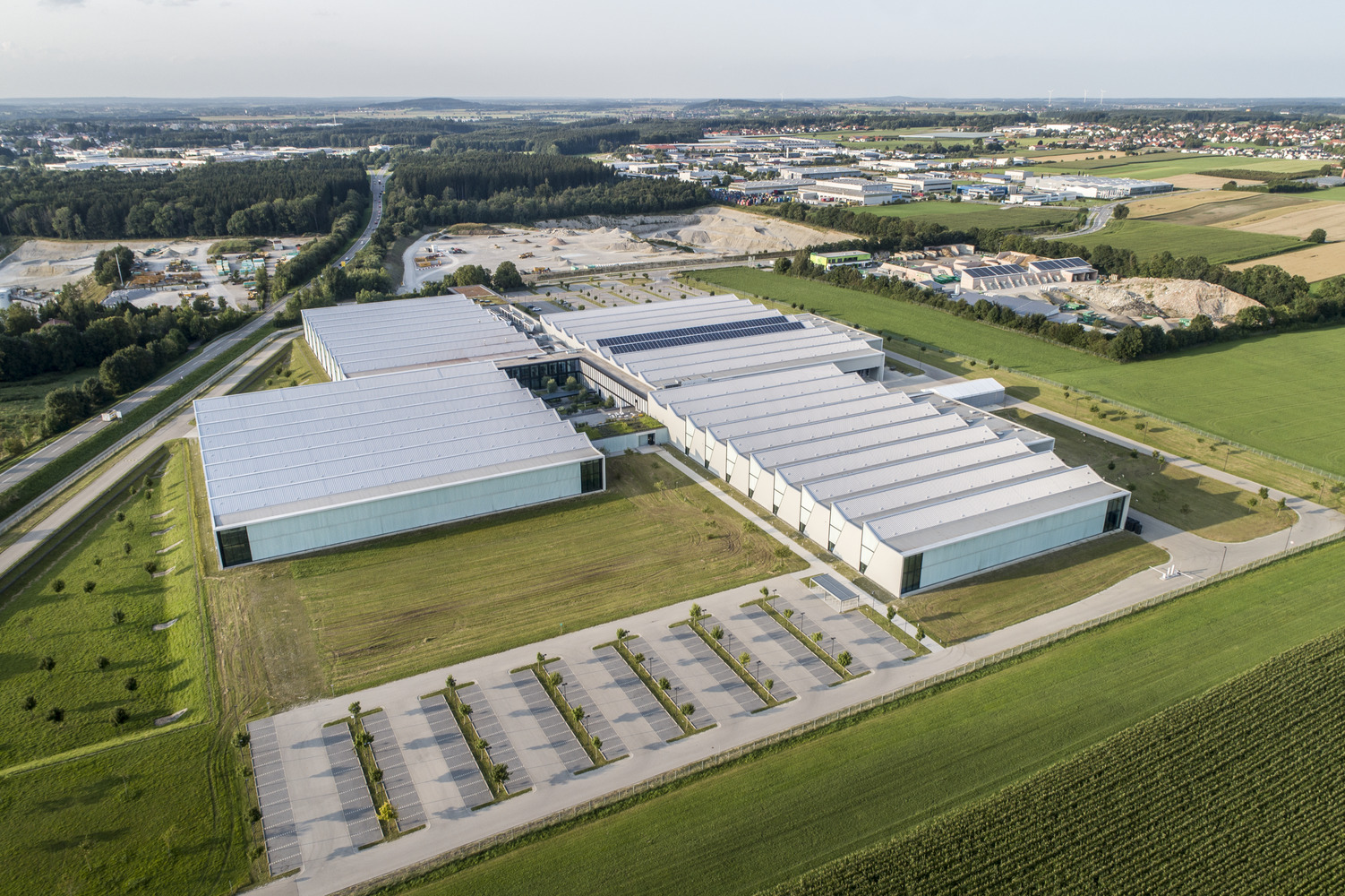 The extension marks the office building even more clearly as a representative area and introduction to the expansive ensemble of production halls. The new building is attached to the existing building, which required some architectural interventions there as well. In the spirit of sustainability, the existing front wall was detached and reused, and the extensive green roof was also expanded.