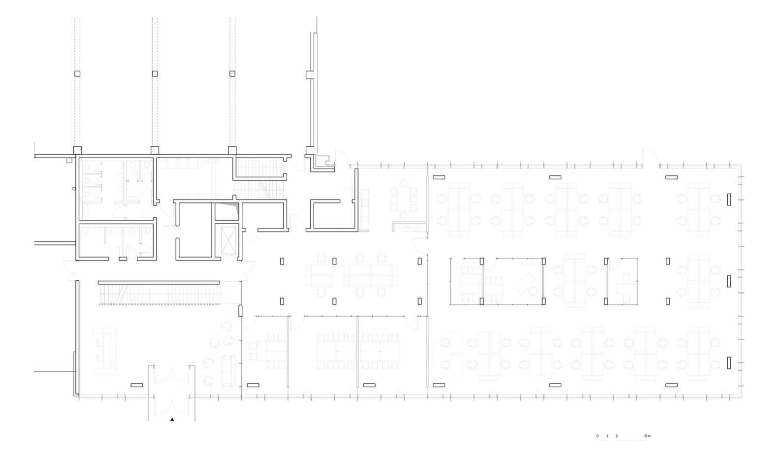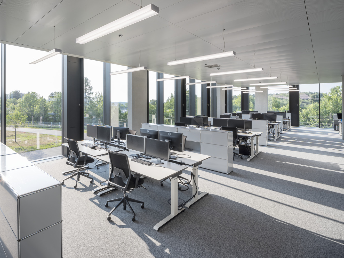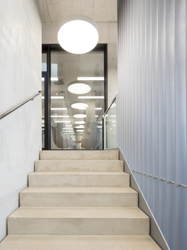 The aluminum post and mullion façade with its extensive openings allows for a high degree of transparency and permeability in the interior spaces, and together with the glass walls continues the main feature of the existing building. External sun protection and ventilation flaps that can be opened manually ensure a comfortable working environment. The office spaces that can be used quite flexibly allow for different forms of working: from communicative open spaces to concentrated individual work or a private conversation in a phone box.
