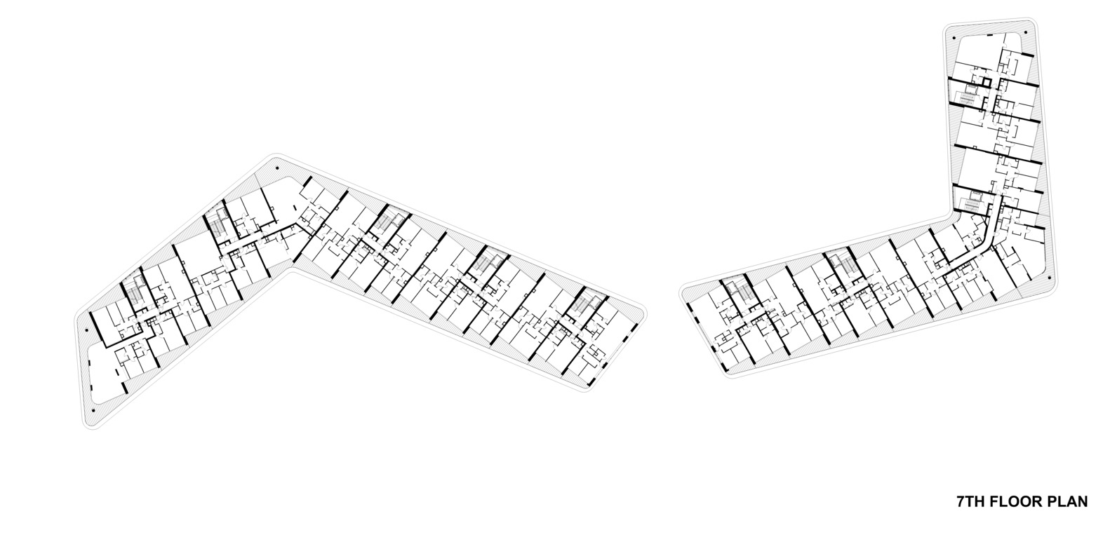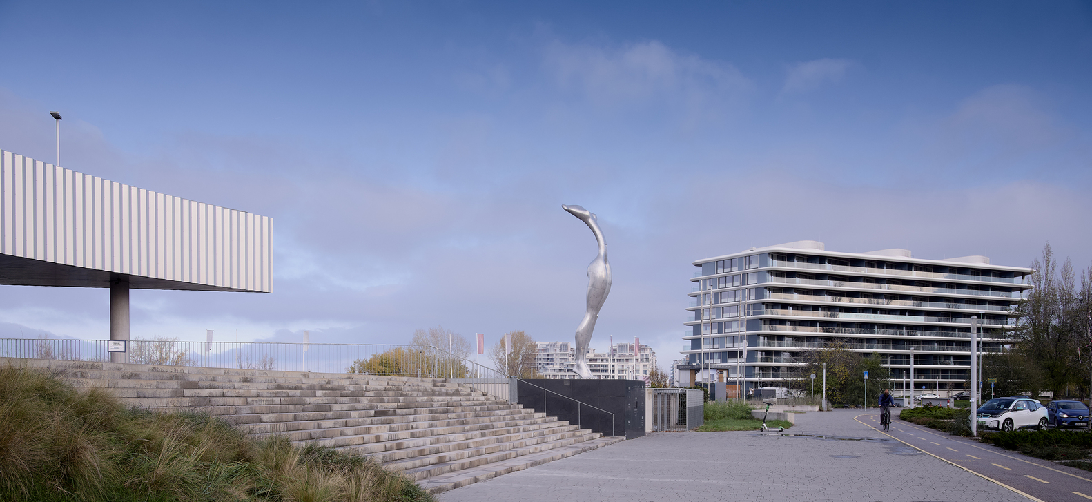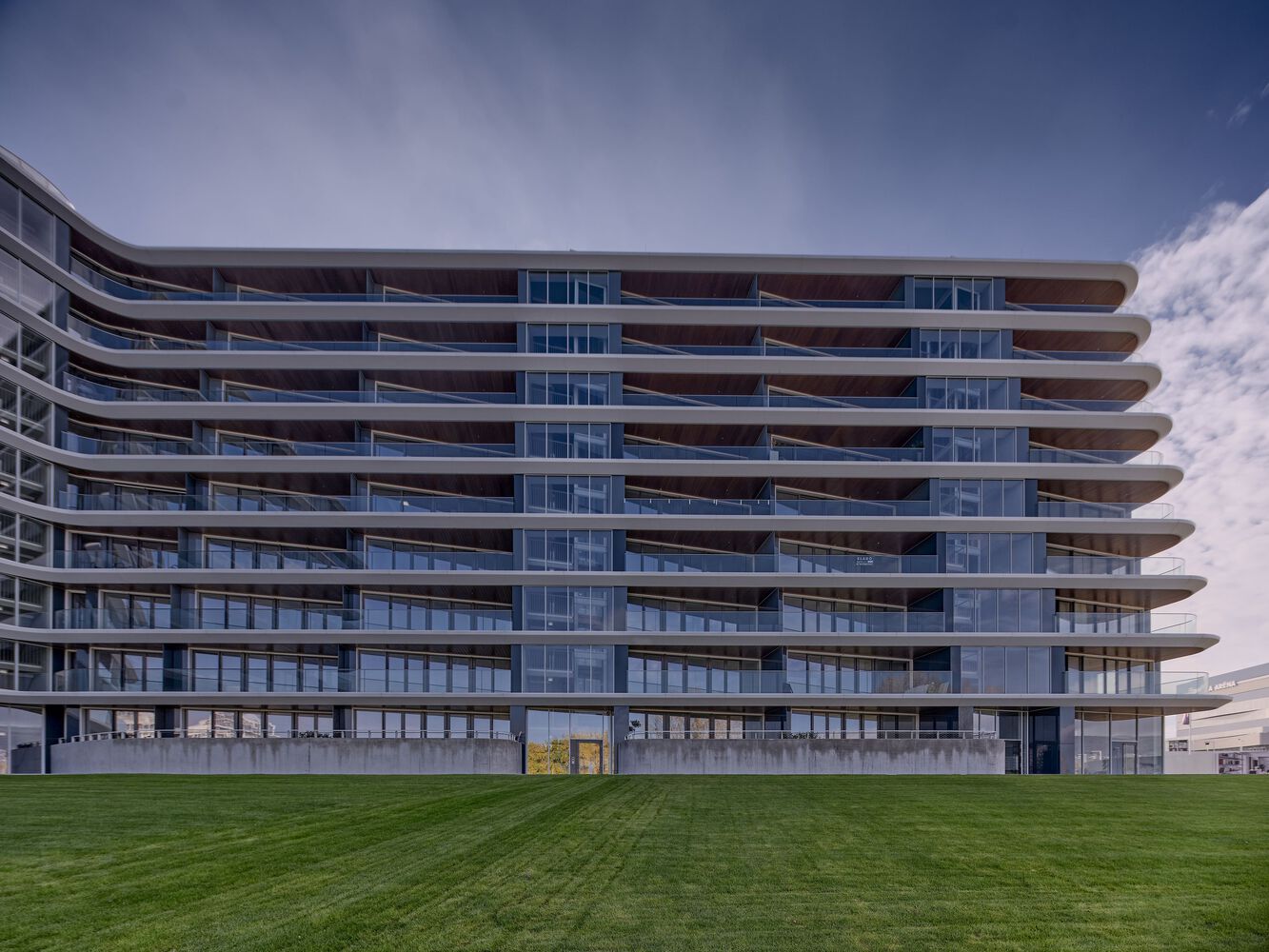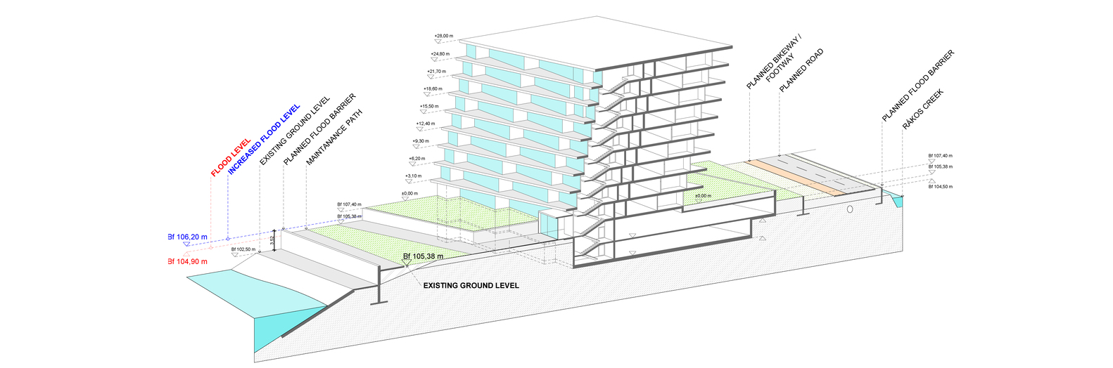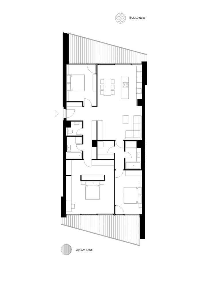 Concept. The architectural concept was first approached from an urban point of view, mapping scale and mass and urban connections. The aim was to design not just a condominium with an attractive façade, but a building that could be viewed from multiple angles and distances, responding to both the natural and built urban environment with equal detail. As a solution, a building volume consisting of two connected superstructure parts was created, which on the one hand follows and exploits the strange geometric features of the site and on the other hand reacts dynamically to the adjacent mass of the National Swimming Centre.