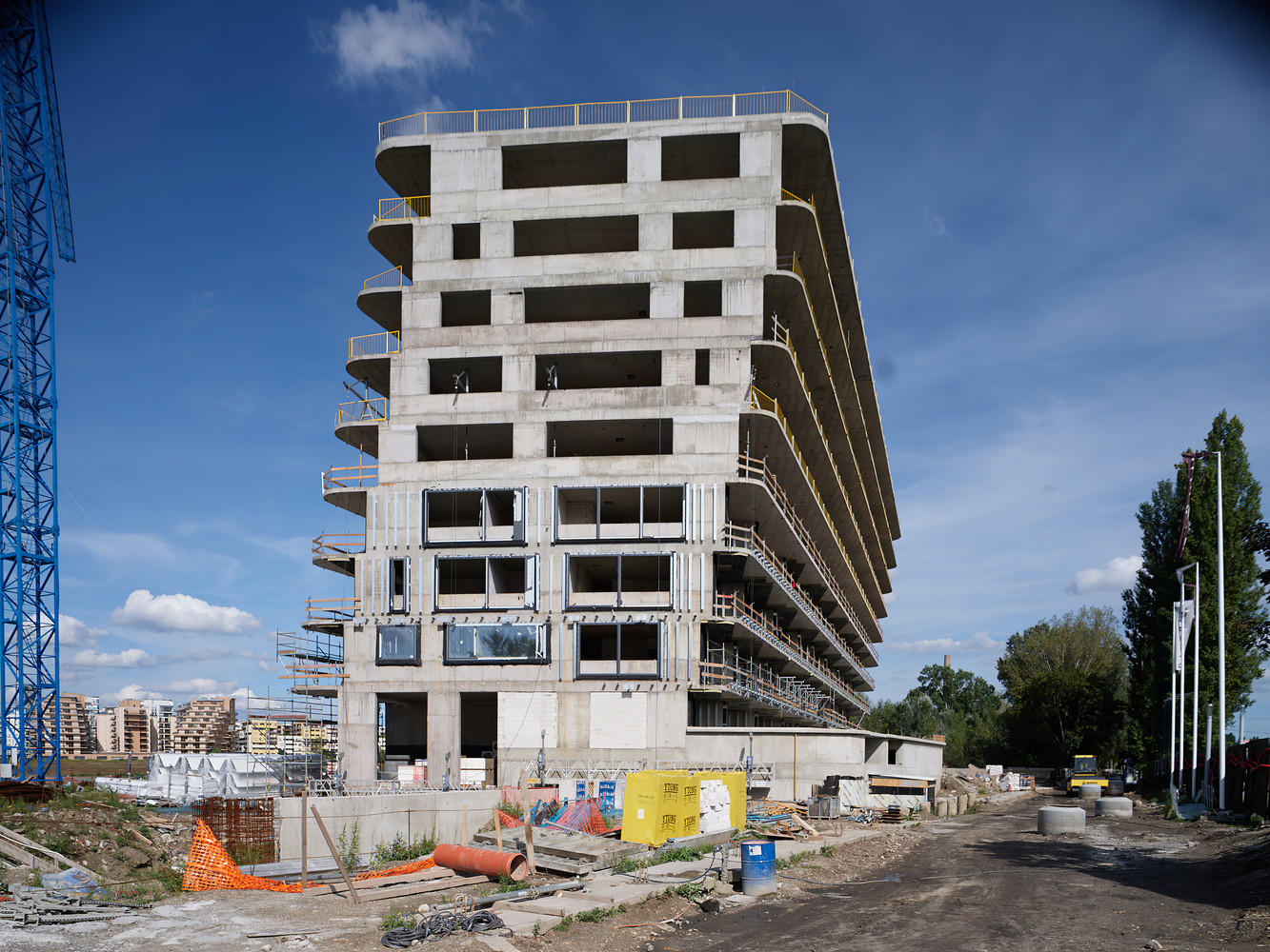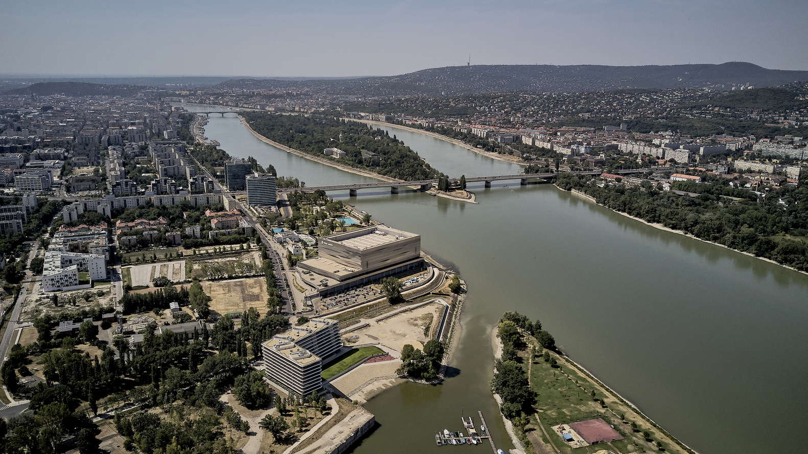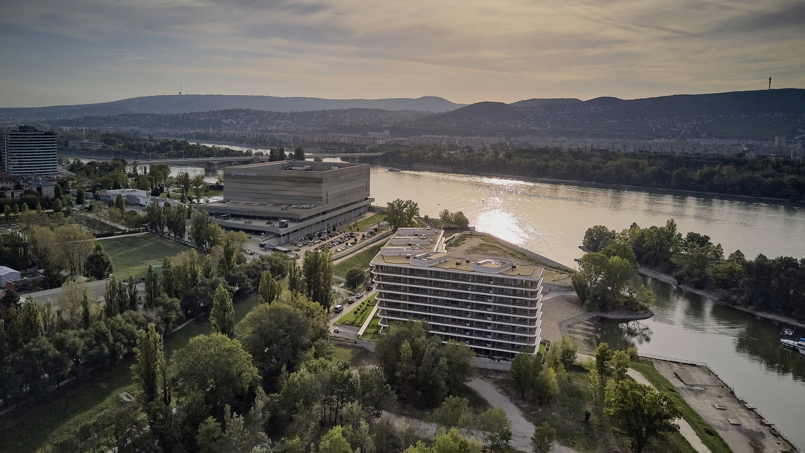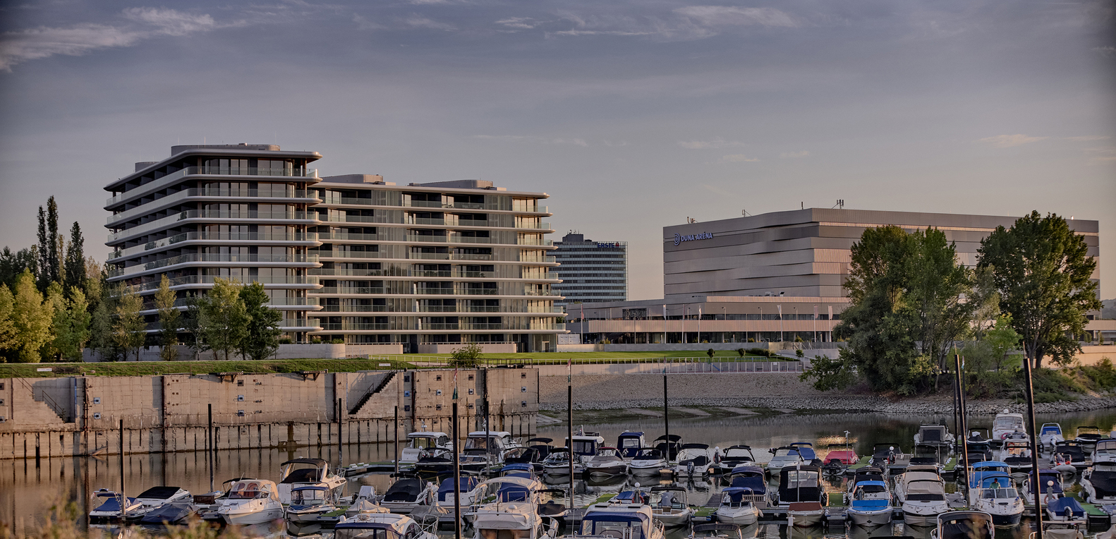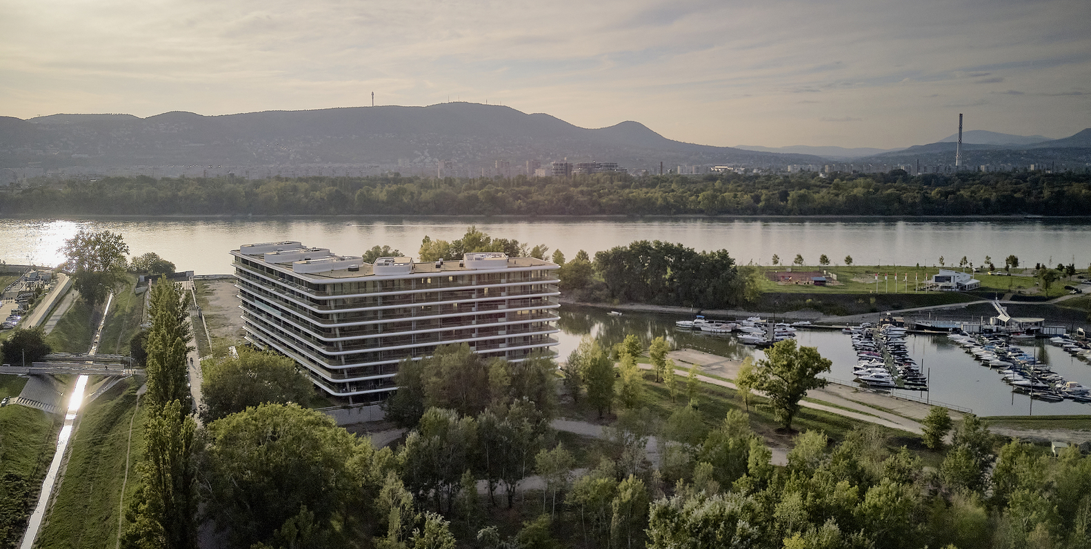 Location. The site is located north of downtown Budapest on the southern side of the FOKA Bay, a former industrial area and harbor, which was created around the 1960s as a result of gravel mining and named after the former operator and abandoned in the 1990s. The aim of the invitation to tender launched by the developer in 2016 was to draw up a complex development plan for a residential building with around 360 apartments and its surroundings, to be built on a unique industrial "brown site" to revitalize with a direct connection to the Danube and a panoramic view.