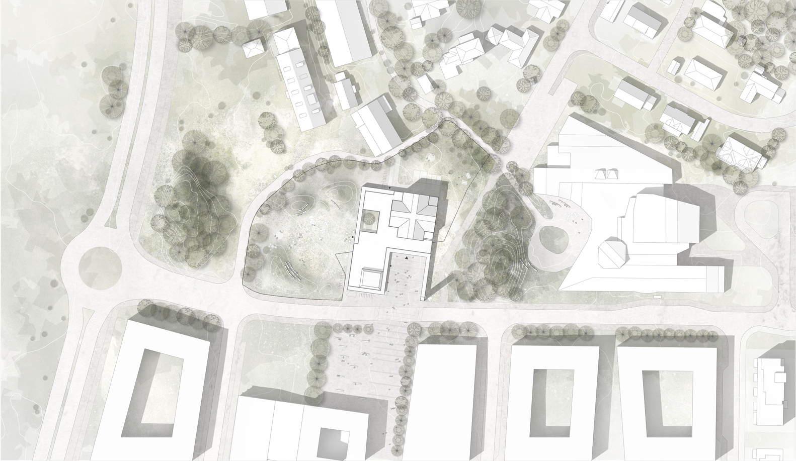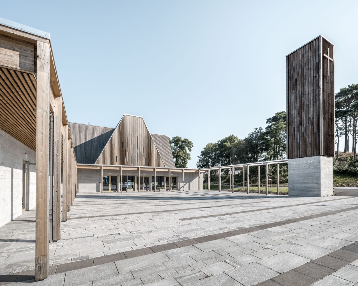Main Gesture. The church’s nave is placed as a direct extension of the main street axis. Opposite the town hall, the two buildings form a new plaza with a continuous green park as a backdrop. The church, along with the new urban and recreational space, redefines the identity of Sola.