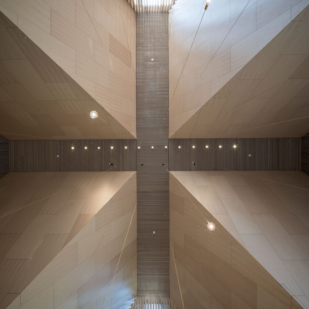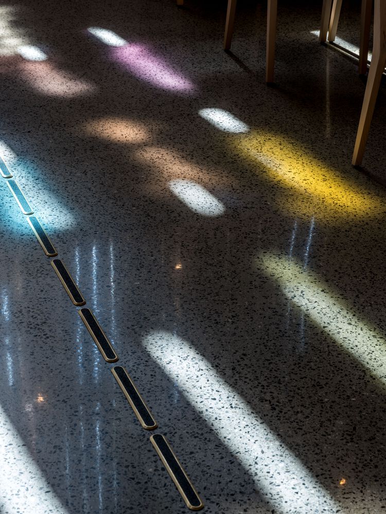 The Nave. The nave is designed as a symmetrical space providing a calm and balanced experience. The north wall of the main nave is designed with a gradual filtration of the northern light providing depth and a clear direction in the nave. The diffused northern lights throughout the height of the room provide a sacred and poetic atmosphere. Behind the altar, a huge art piece by local artist Marie Buskov is installed, giving the church its identity and a spiritual atmosphere.