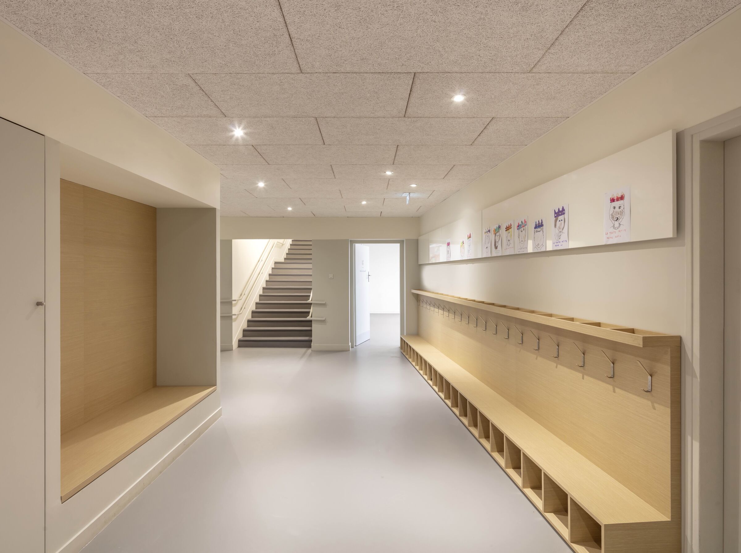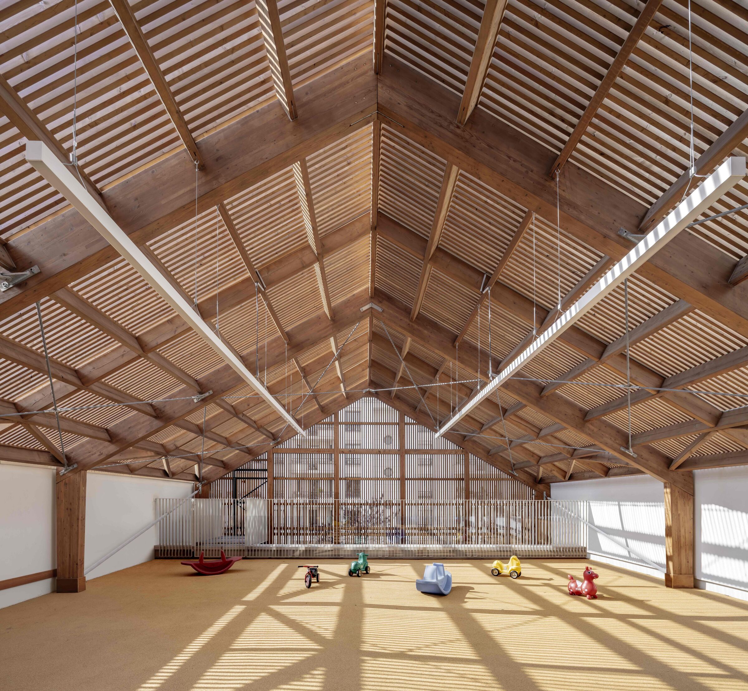 A new wood clad building marks the entrance to the nursery school and crèche and offers a pleasing contrast to the adjacent wing’s white plaster facade. “By means of a simple elevation and a double-sloped roof, the volume of the entrance acts as a landmark for the centre,” says Antonio Virga. The “wood house” works as a natural meeting point and a shared space for all users. “The symbolic figure of the house, clad in wood, allows the architecture to be clearly appropriated by the children, their parents, and the teachers,” says the architect.