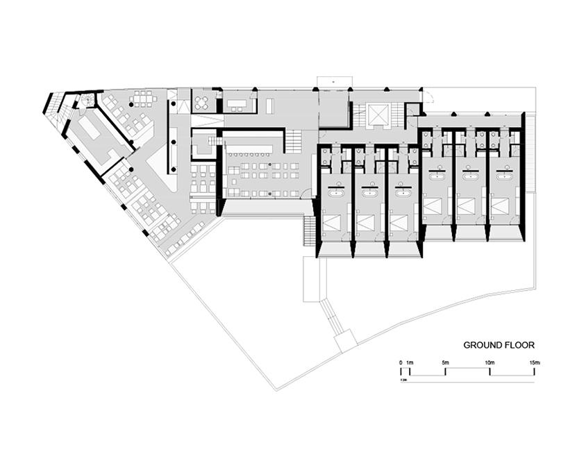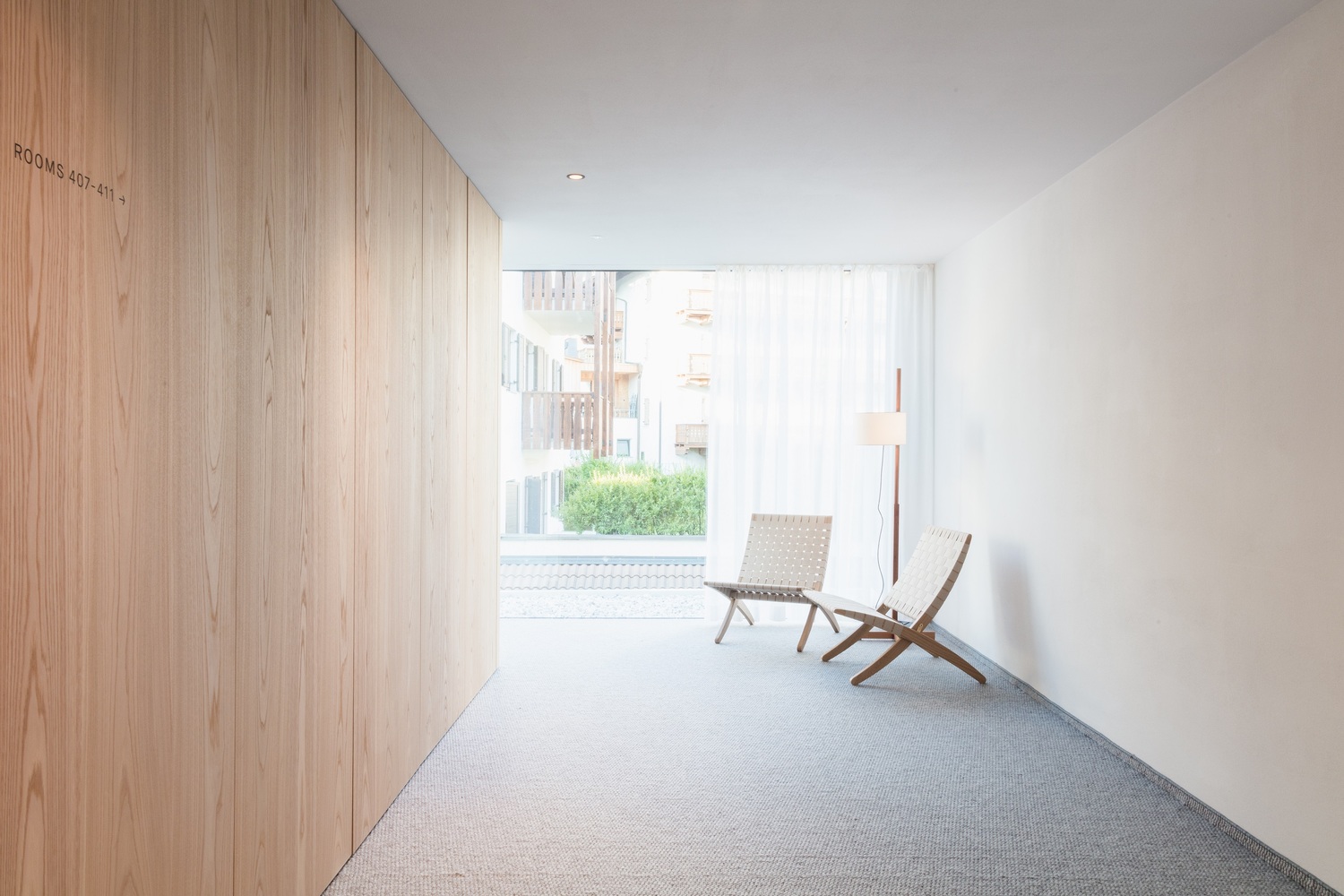 Tradition and culture are key elements in the design of the Hotel. Simple and functional interiors with open layouts are combined with local materials such as chestnut wood or local Stones and textiles. Public spaces like lobby, bar and restaurant are located on the ground floor. The Bar connects to a wide and sunny terrace with impressive views towards the Sciliar mountain. The underground level hosts the wellness facilities, Spa and beauty.