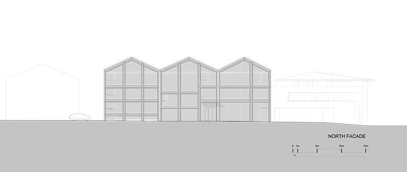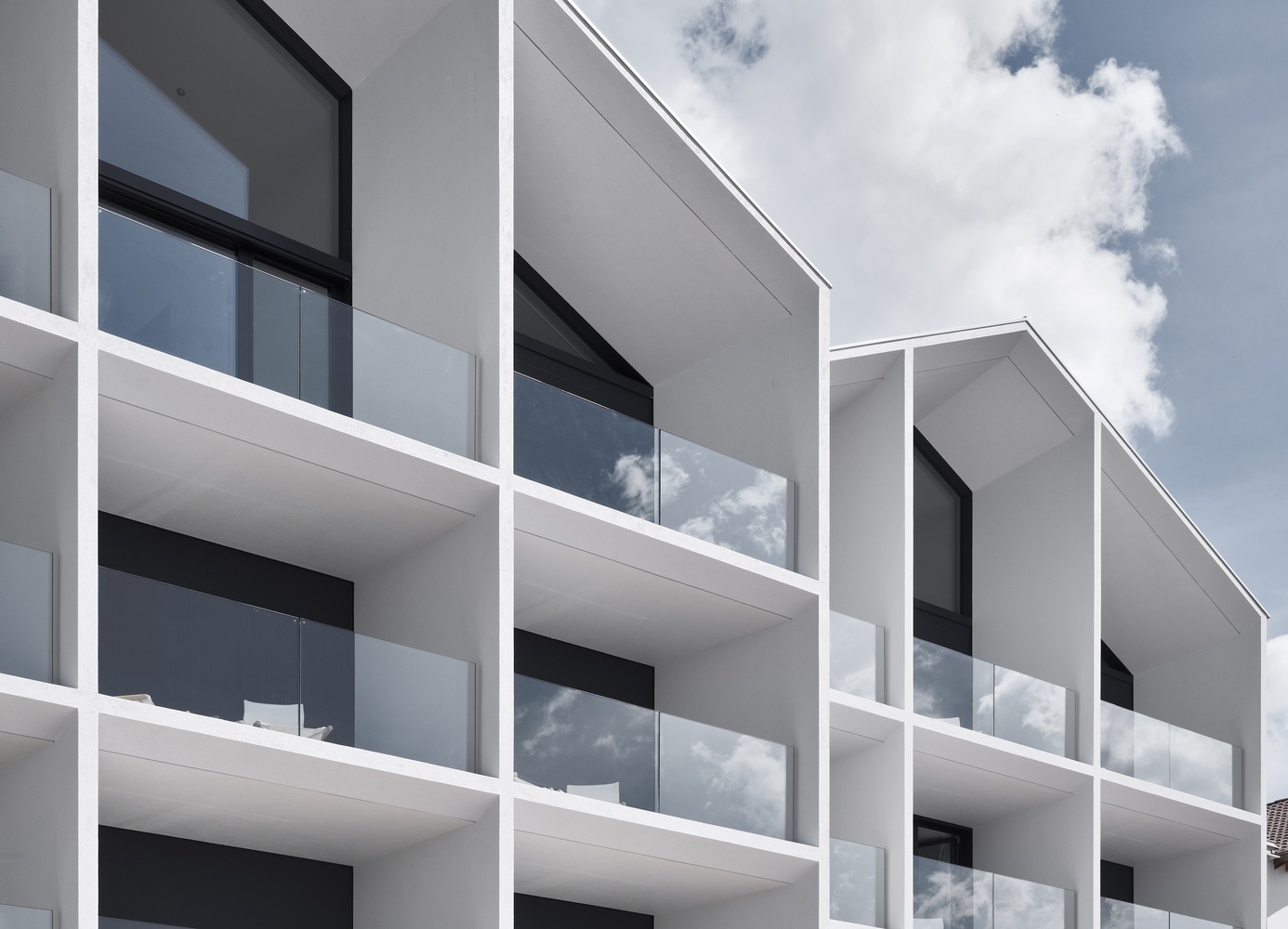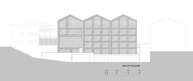 The expressive exoskeleton facade changes according to orientation and program. At the north/east facade, with mostly corridors and public spaces, the almost sculptural structure is less depth. At the south facade the tapered geometry has more depth and creates loggias with natural shading. The bright grey color of the chalk containing render of the facade is inspired by the rocks of the surrounding mountains.