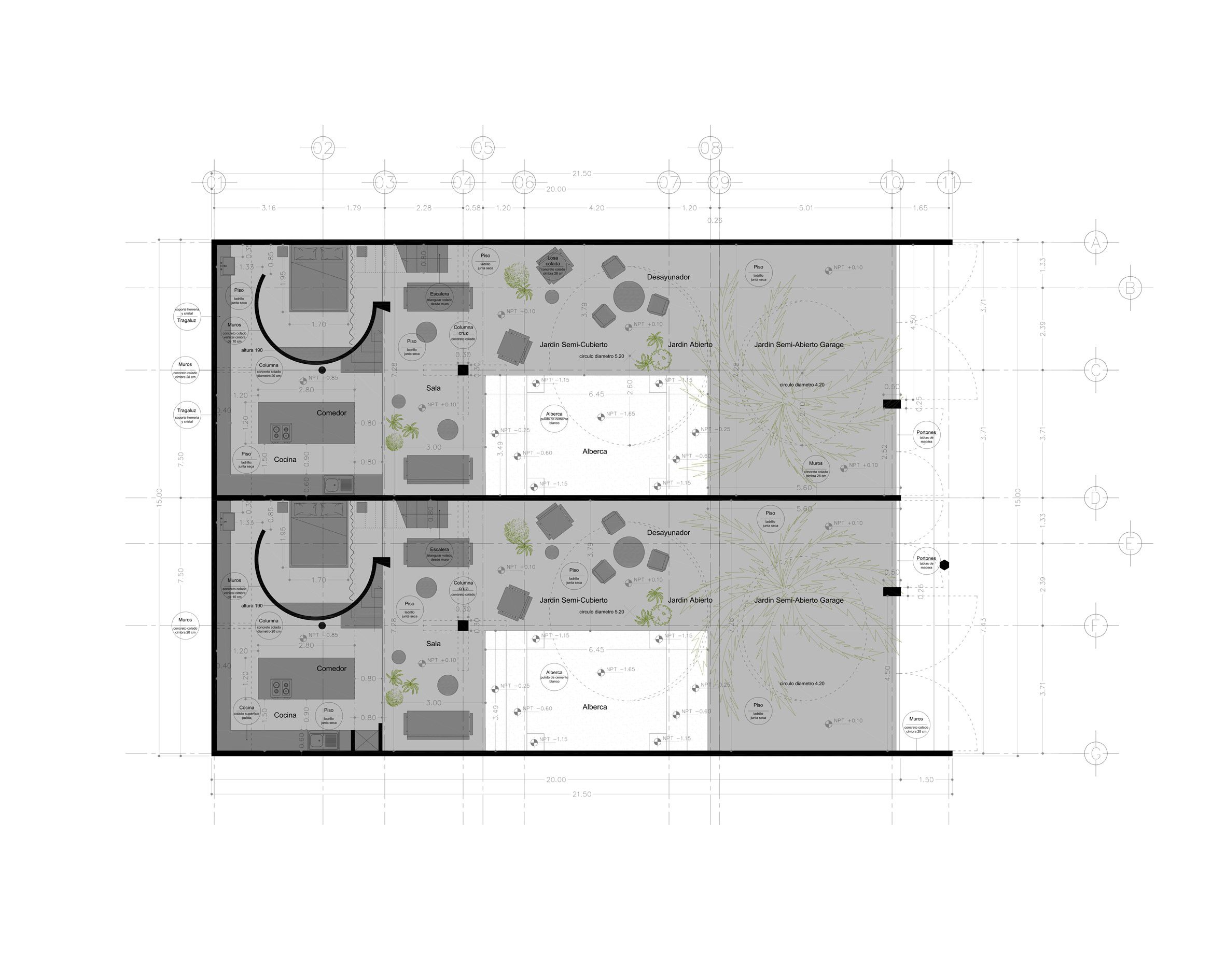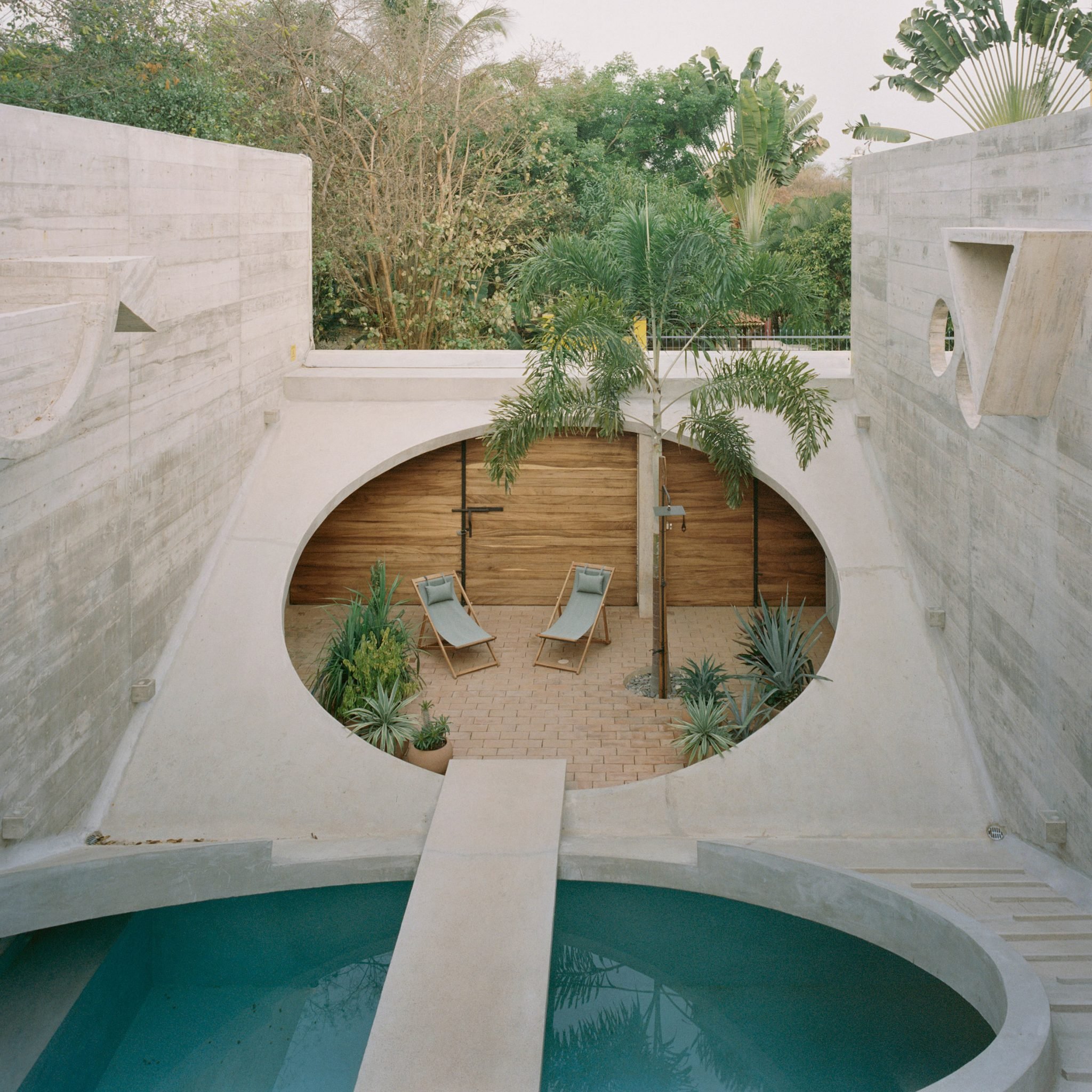 Mexico City based architect Ludwig Godefroy has cut circular openings into the slanted ceilings of a series of dwellings in Puerto Escondido, Mexico, to create semi-exposed pools and gardens.
