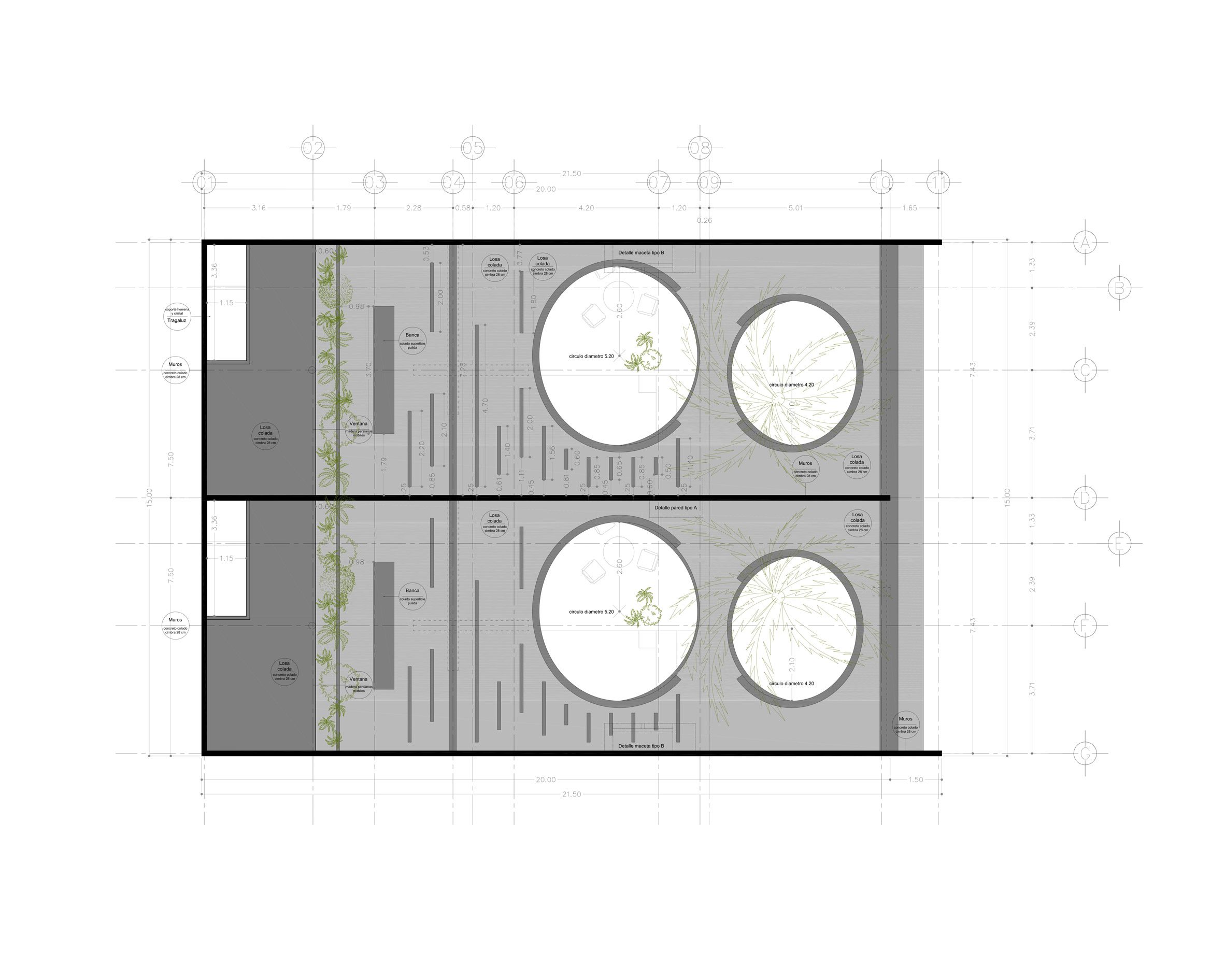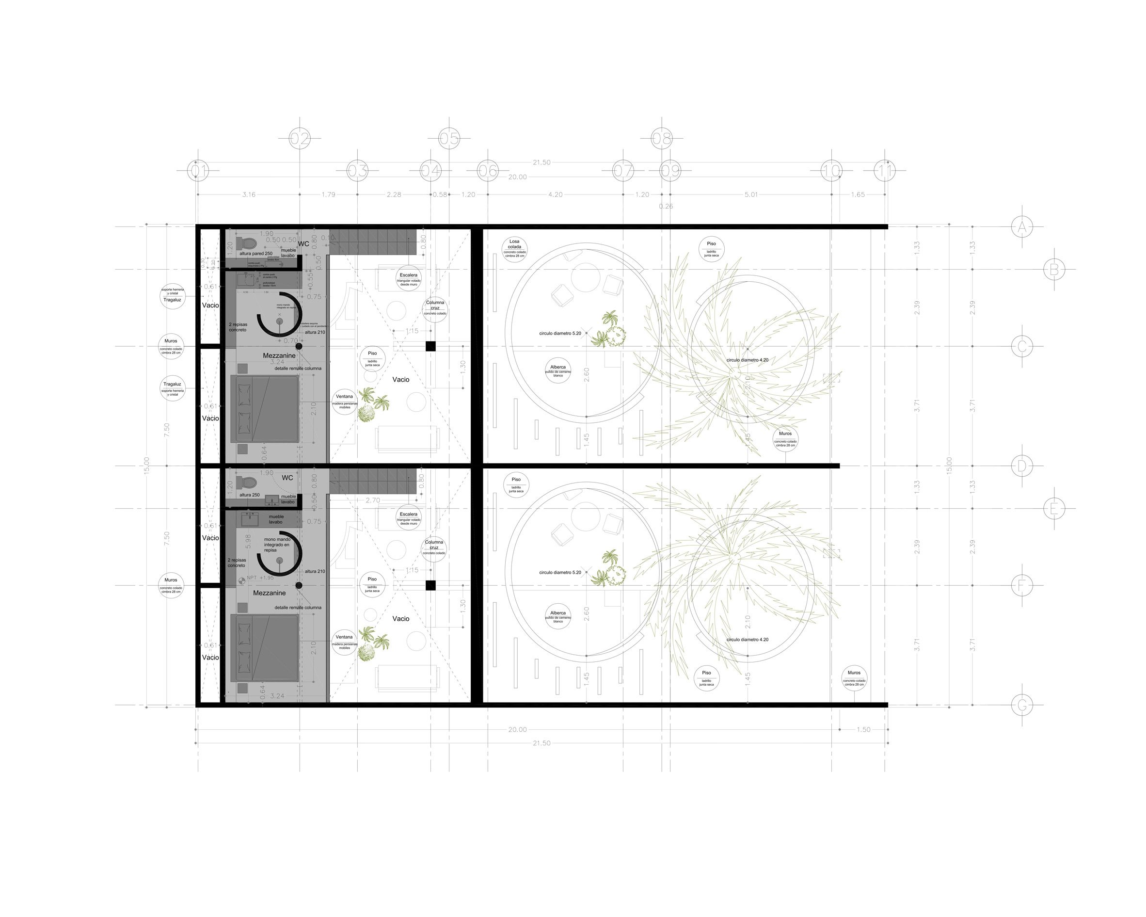 The circular openings were instead employed as large, reclined skylights that also act as mirrored passageways at the centre of each individual dwelling's courtyard.