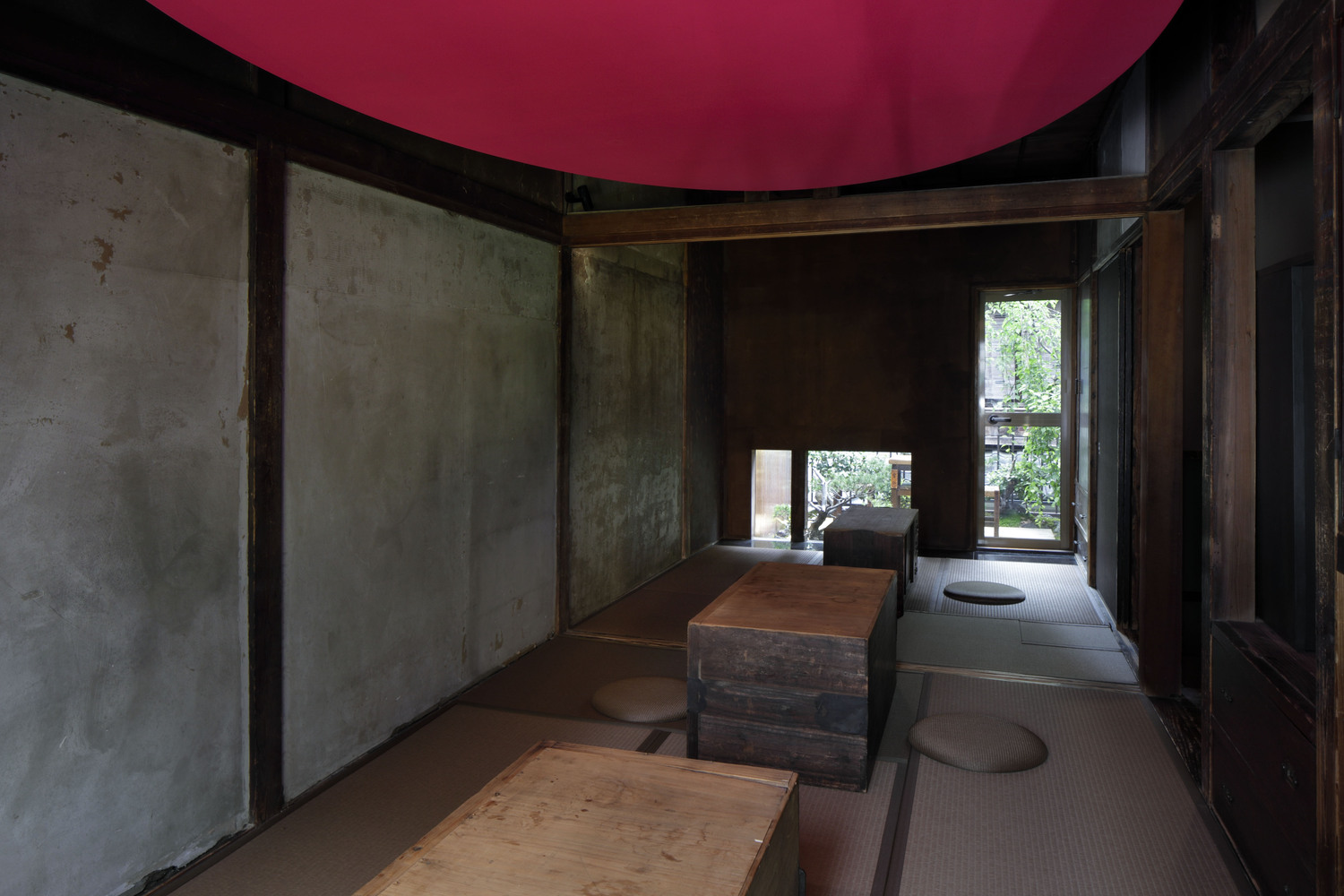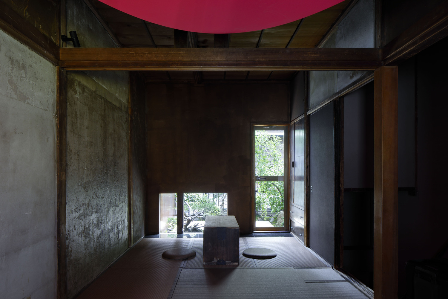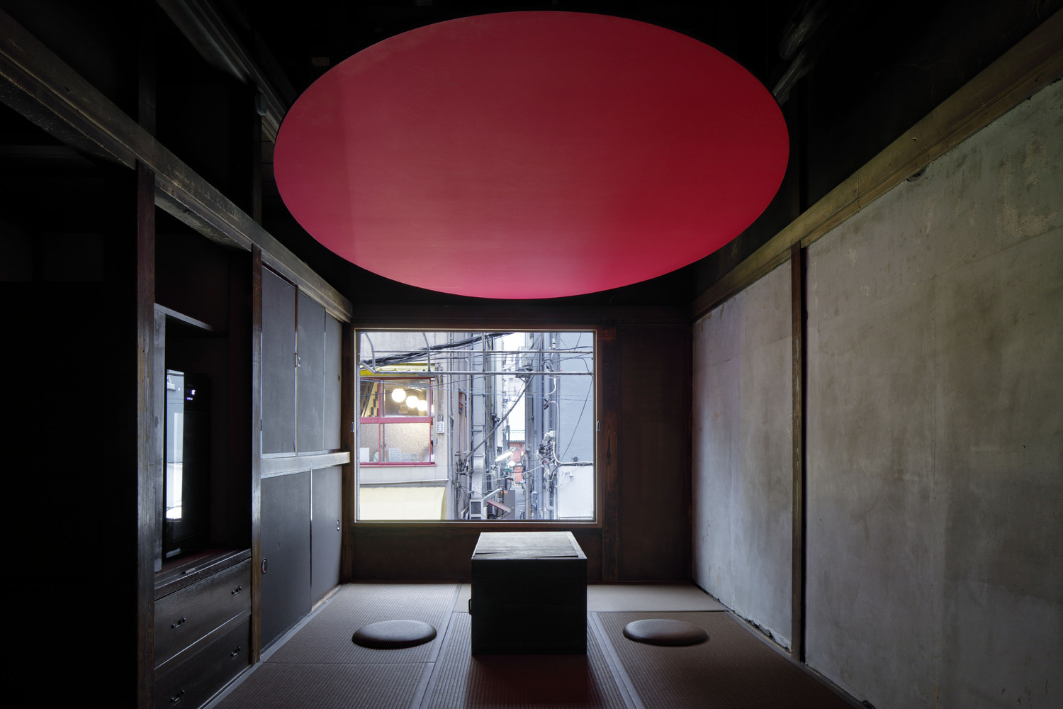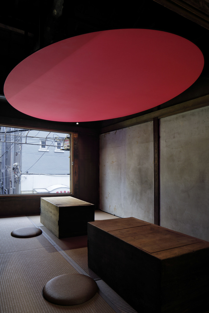 The pink disk is a modern homage to the tearoom, a traditional Japanese architectural style. We changed the round disk to an ellipsoid shape so that it fits the size of the room. It is hanging at a height of 1850mm from the floor and was painted pink. When you sit on the tatami floor and look up, the color effect makes it impossible to keep a viewpoint, and as a result, the depth feels lost. This gives the narrow tearoom-like space a special, tense, atmosphere.