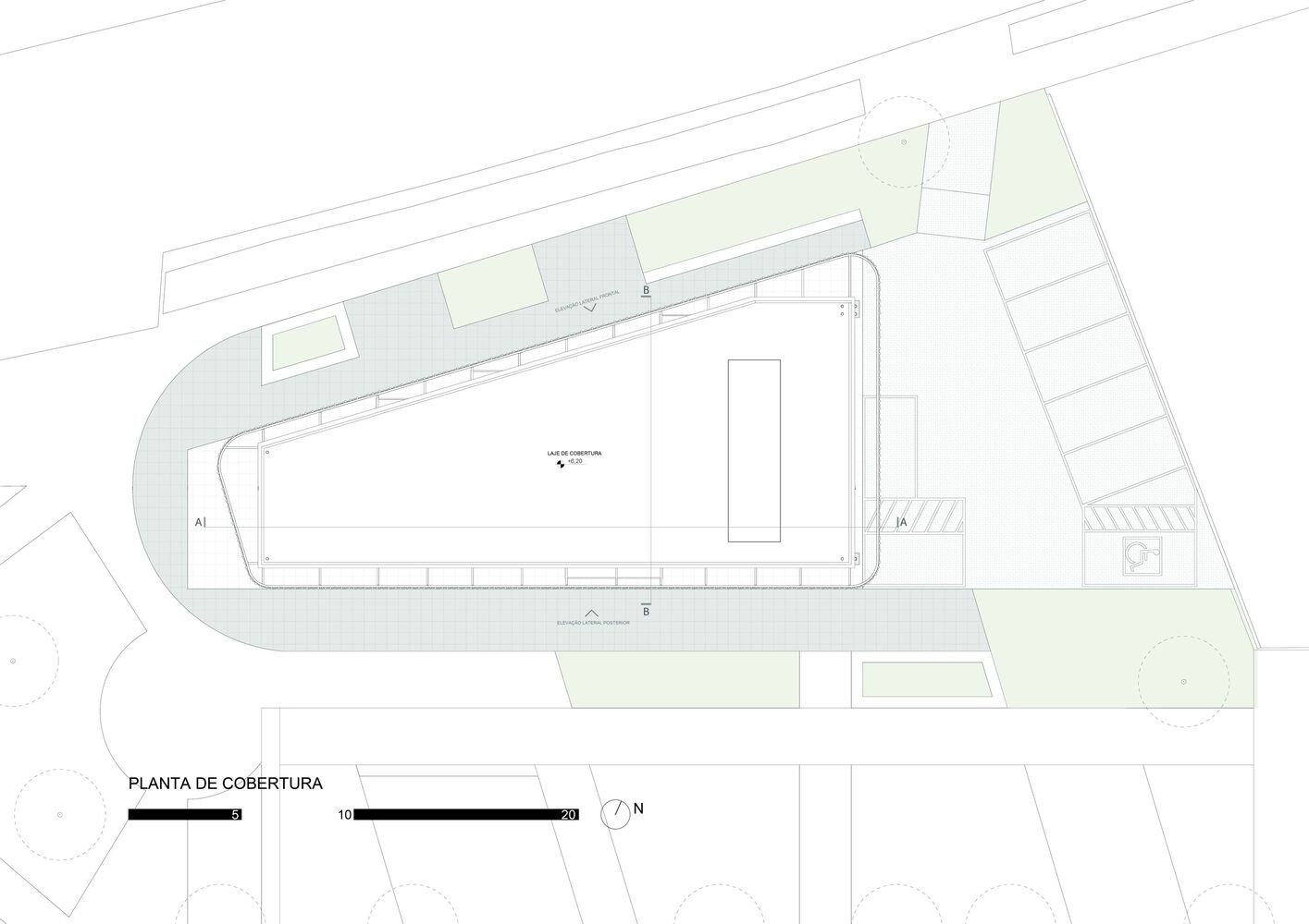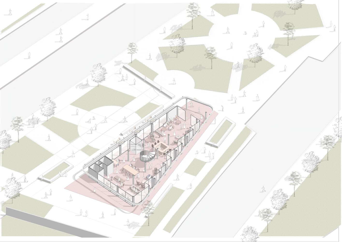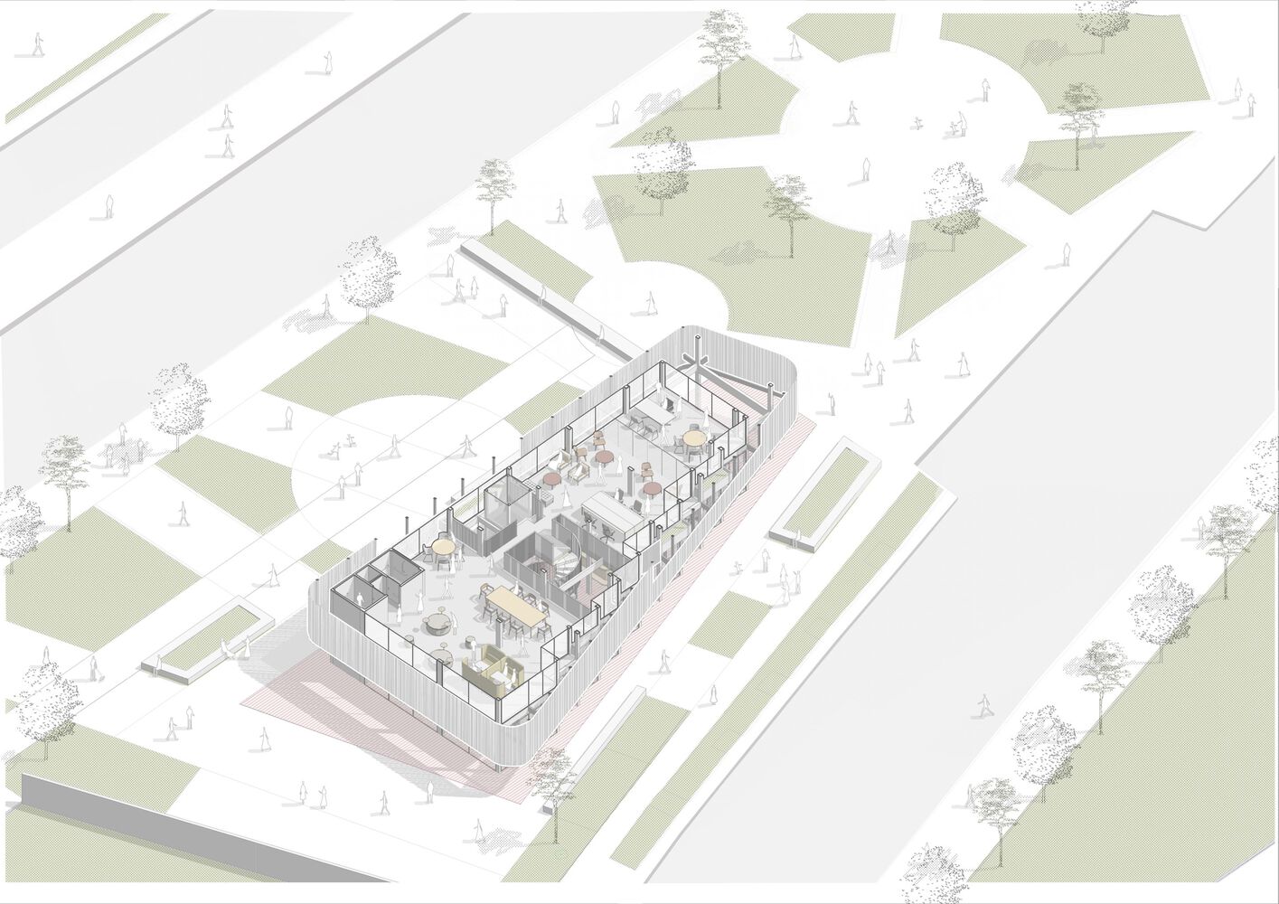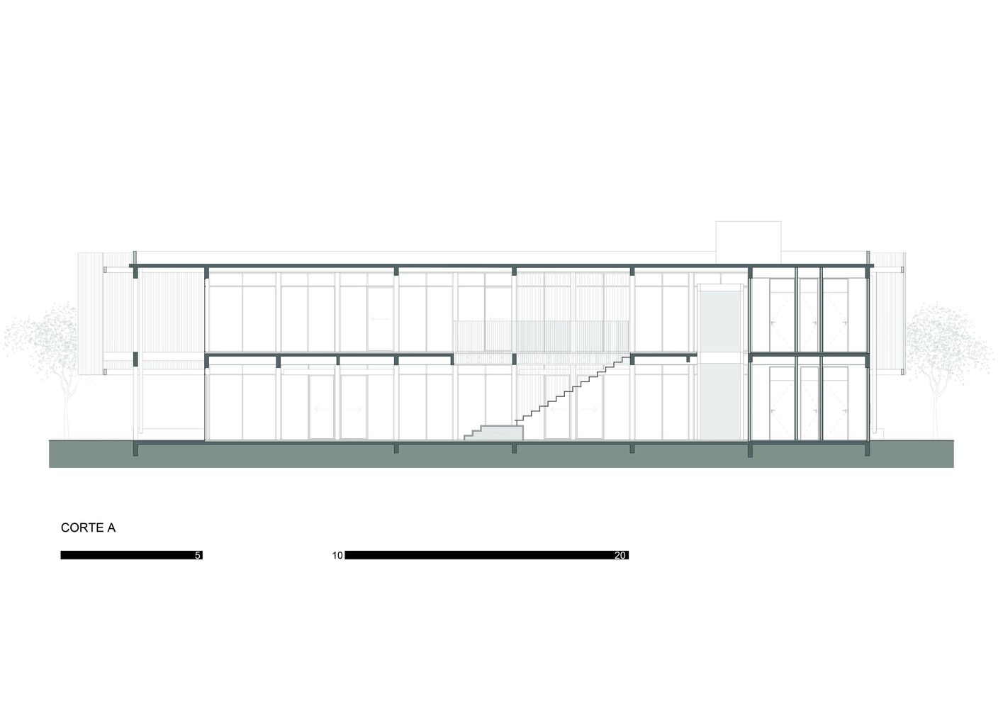 The adoption of a flexible commercial layout allows the adaptability of uses and commercial activities, in order to reframe the relationship between work and the city, establishing visual links between pedestrians, the neighborhood and the users of the building. It could house a shop, a pastry shop, a restaurant and even an office space, but its key use is related to the day-to-day life of the square, sidewalks and surrounding open spaces.