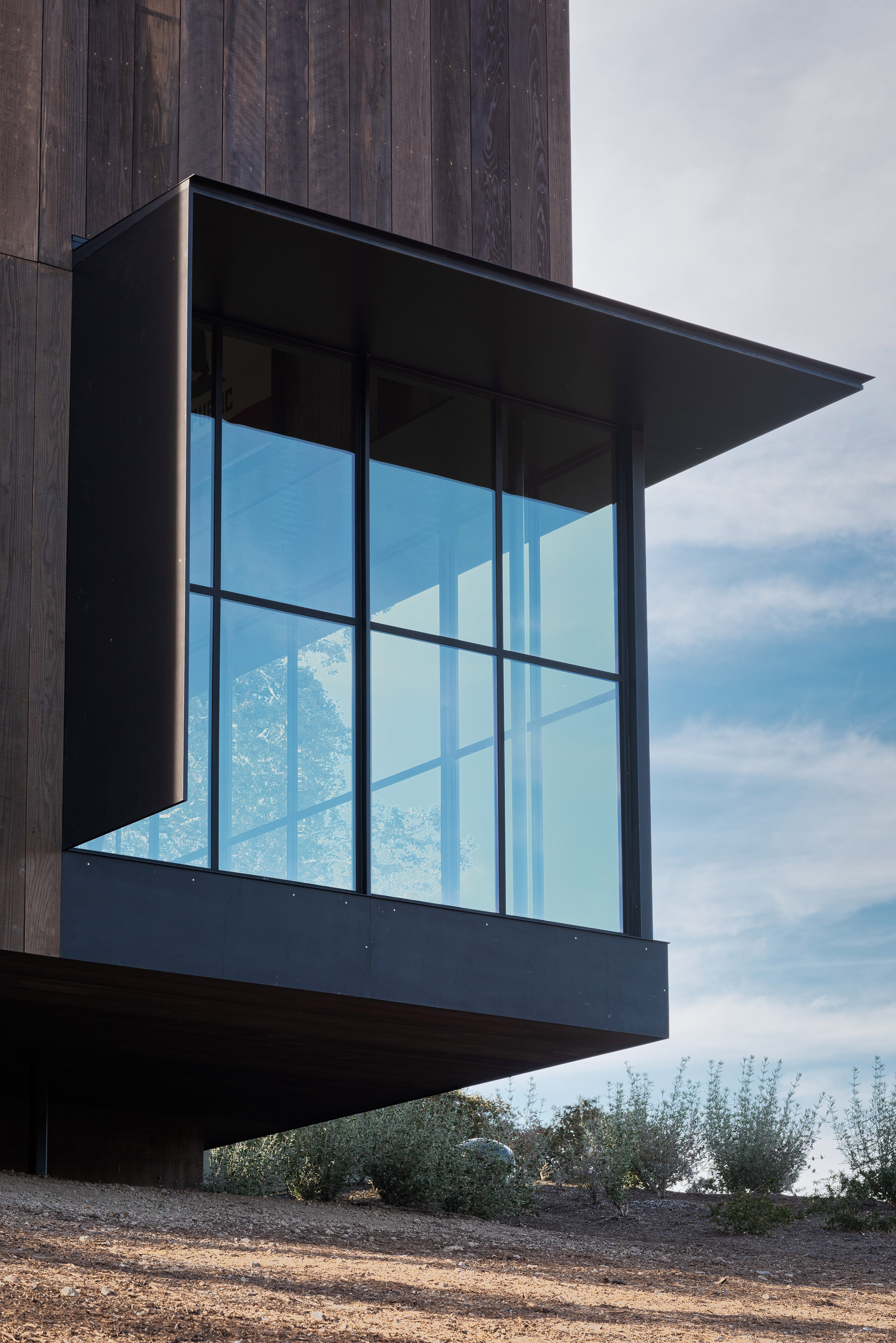 Faulkner Architects has already completed one project on the client's property — the conversion of a tack barn into a minimal bunkhouse, which the owner's stayed in while making plans for a larger abode. The simple building totals 389 square feet (78 square metres) and is clad in weathering steel and reclaimed wood.
