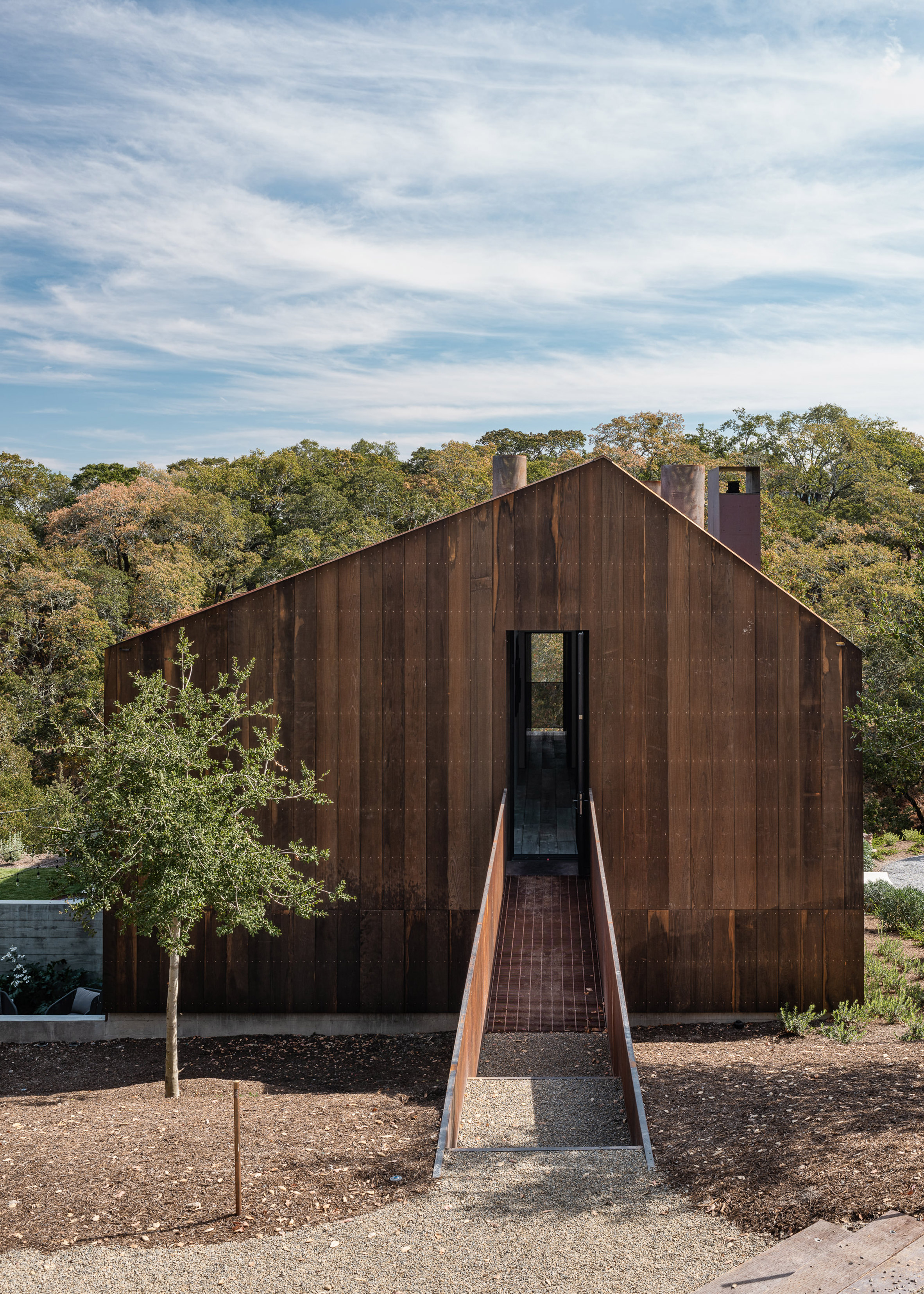 Called the Big Barn house, the project is located in Glen Ellen, a town in Sonoma Valley that is named after a winery established there in the 1860s. Located about an hour's drive from San Francisco, the area has rolling hills dotted with oak trees and agricultural buildings.